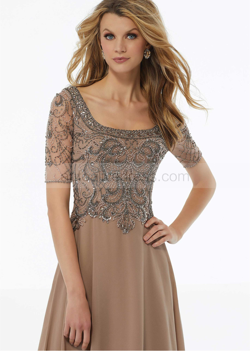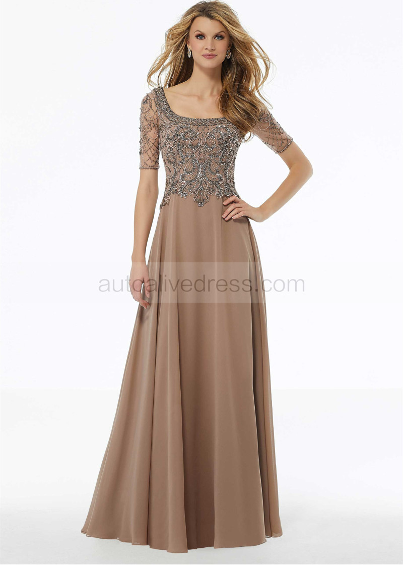 Short Sleeves Beaded Taupe Chiffon Evening Dress