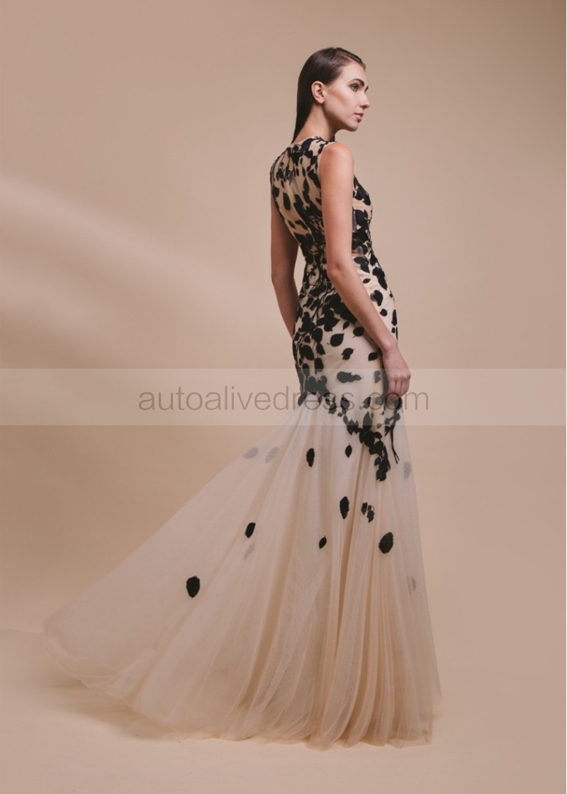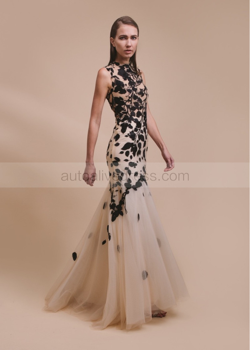 Sleeveless High Neck Black Leaf Lace Nude Tulle Evening Dress