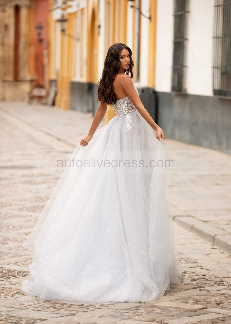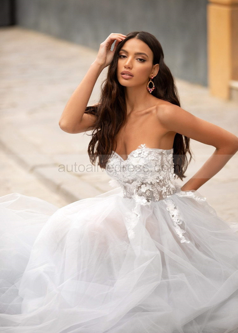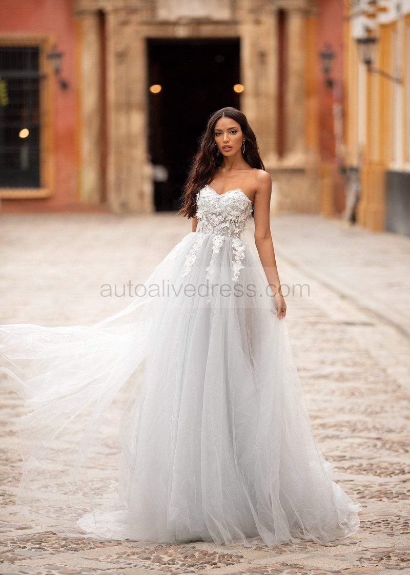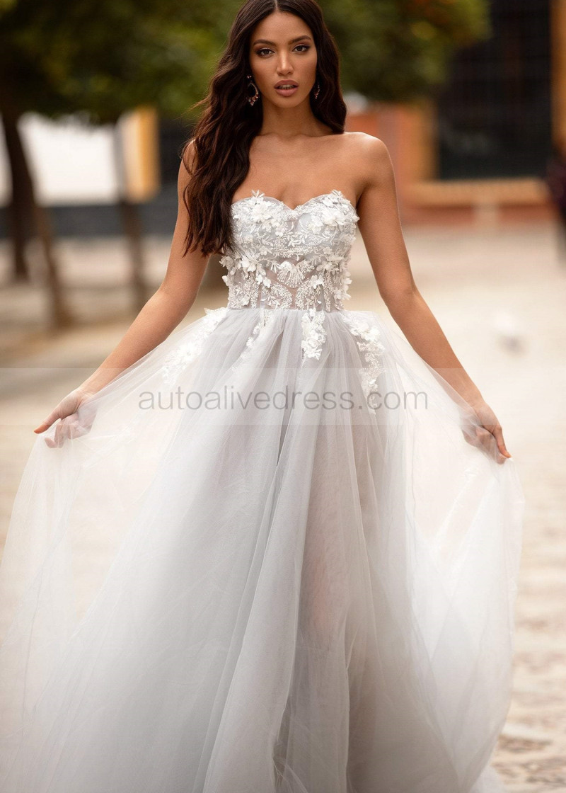 Strapless Beaded Light Gray Tulle 3D Flowers Evening Dress