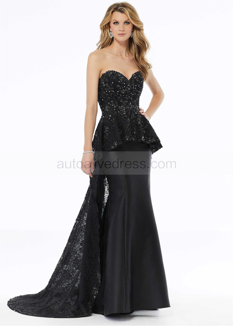 Strapless Sweetheart Beaded Satin Lace Peplum Evening Dress