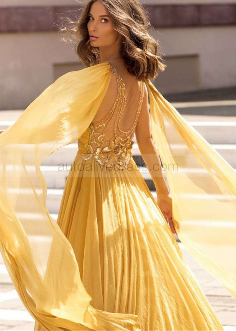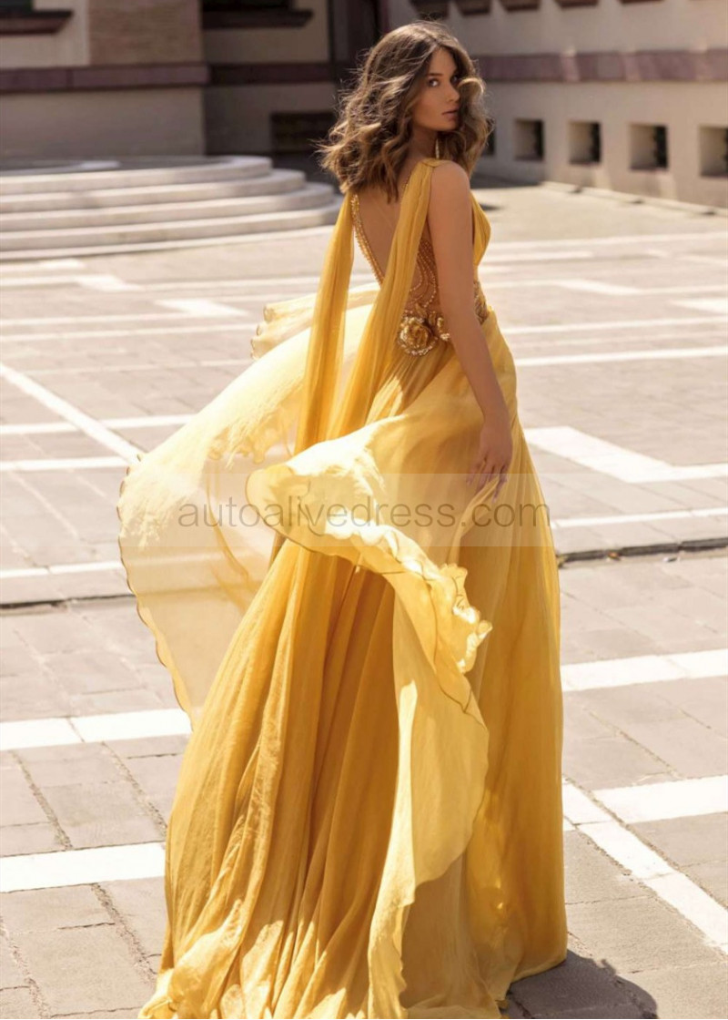 V Neck Beaded Gold Chiffon Slit Evening Dress