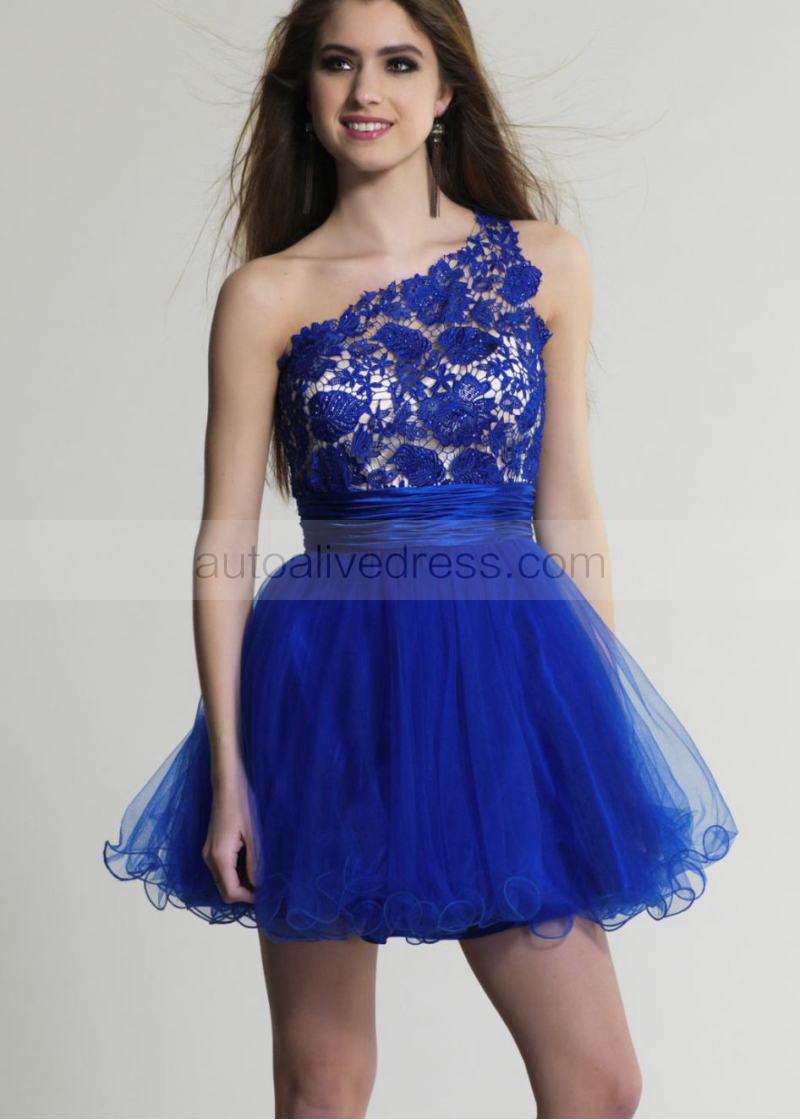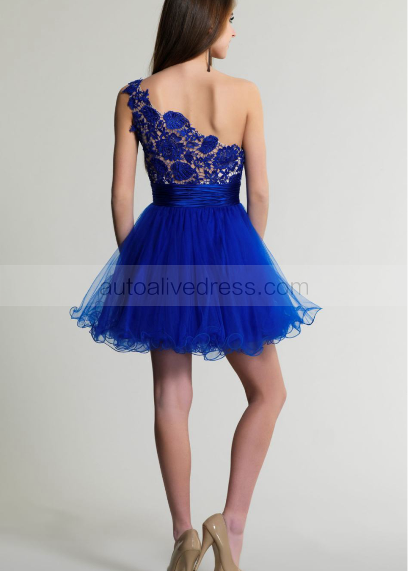 Royal Blue Tulle Lace One Shoulder Knee Length Prom Dress