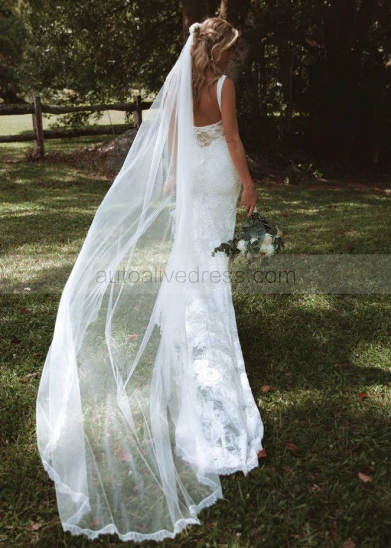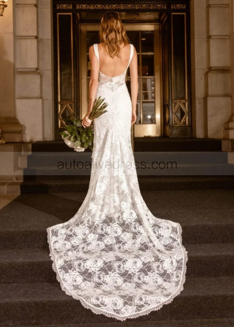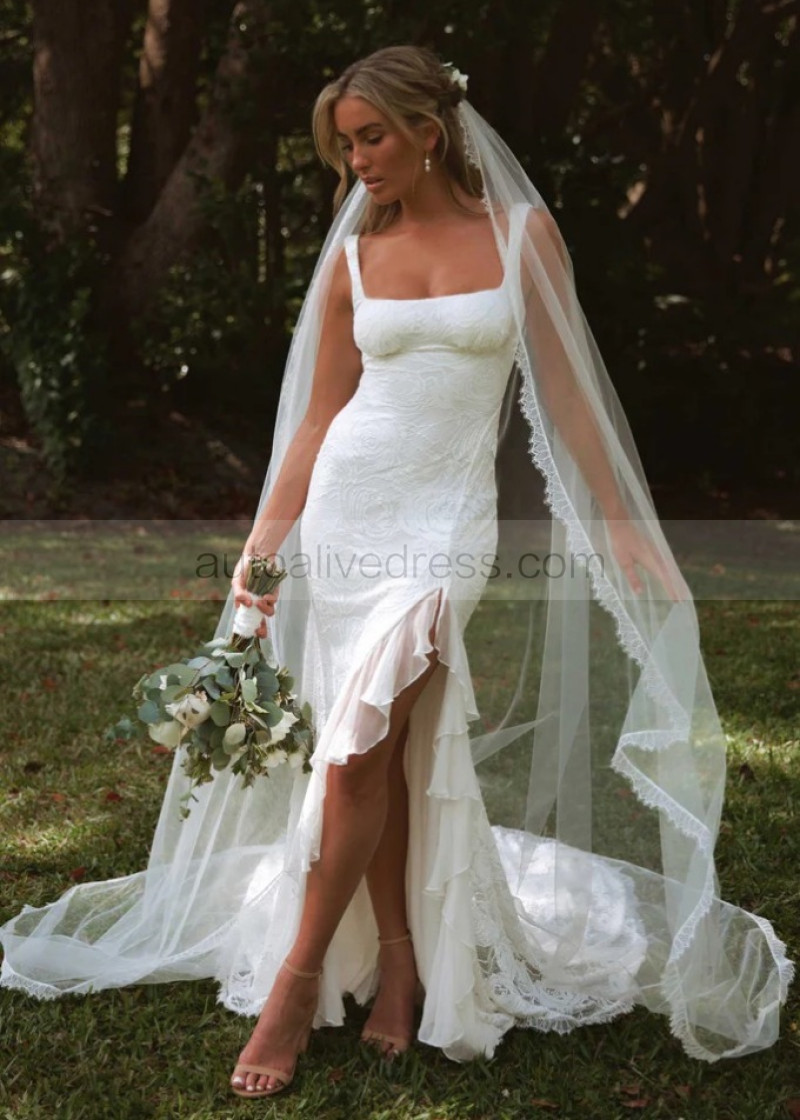 Square Neck Ivory Lace Chiffon Slit Sweet Wedding Dress