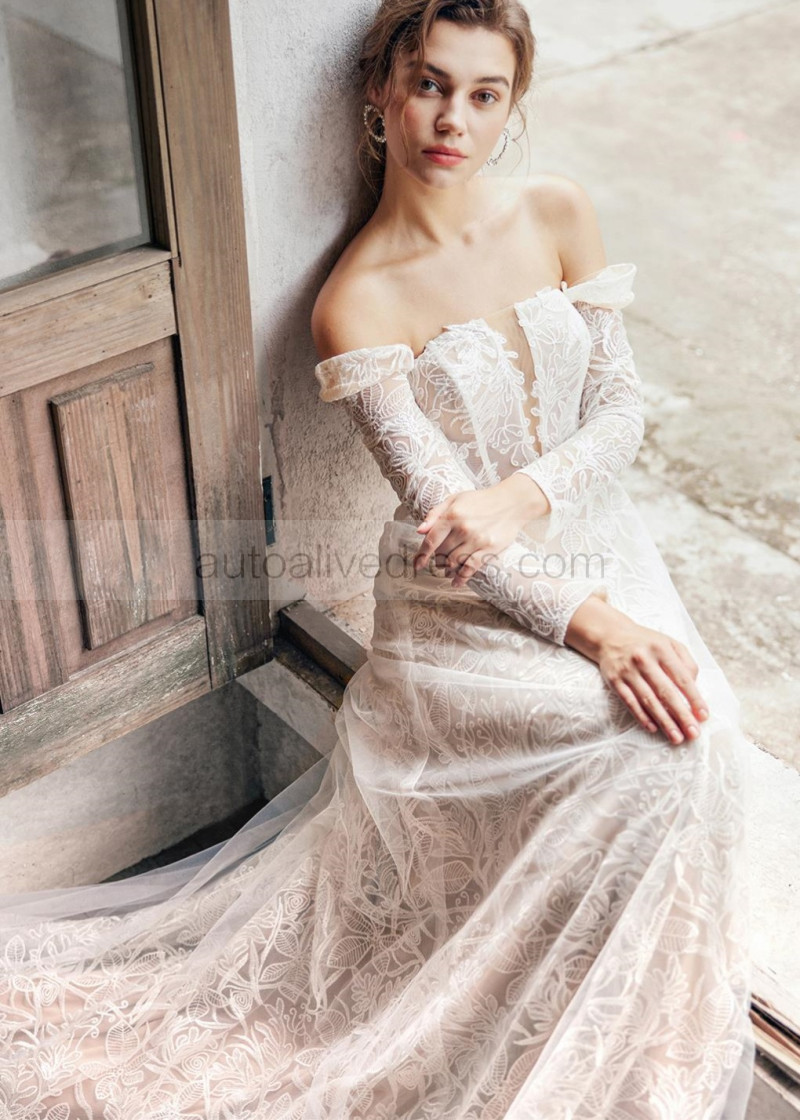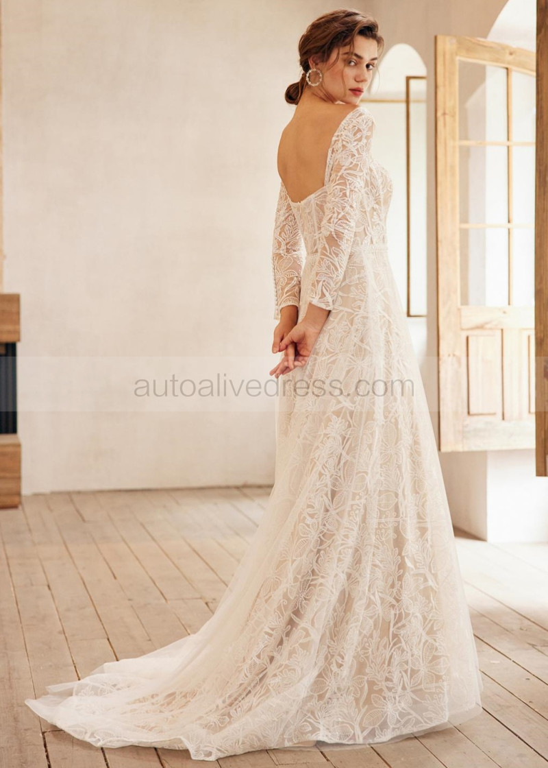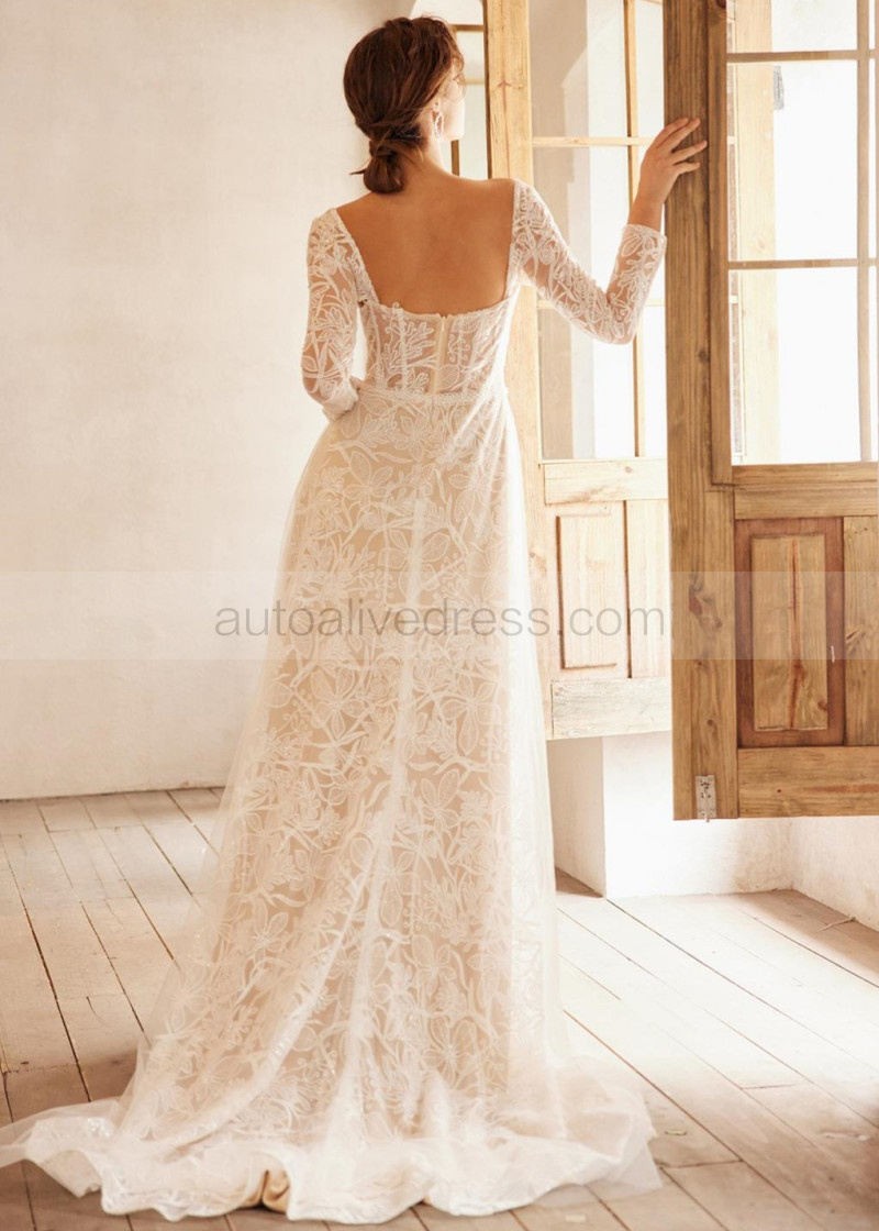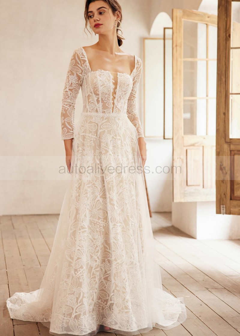 Square Neck Ivory Lace Tulle Floral Wedding Dress