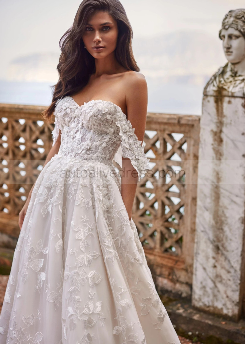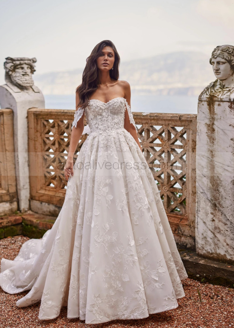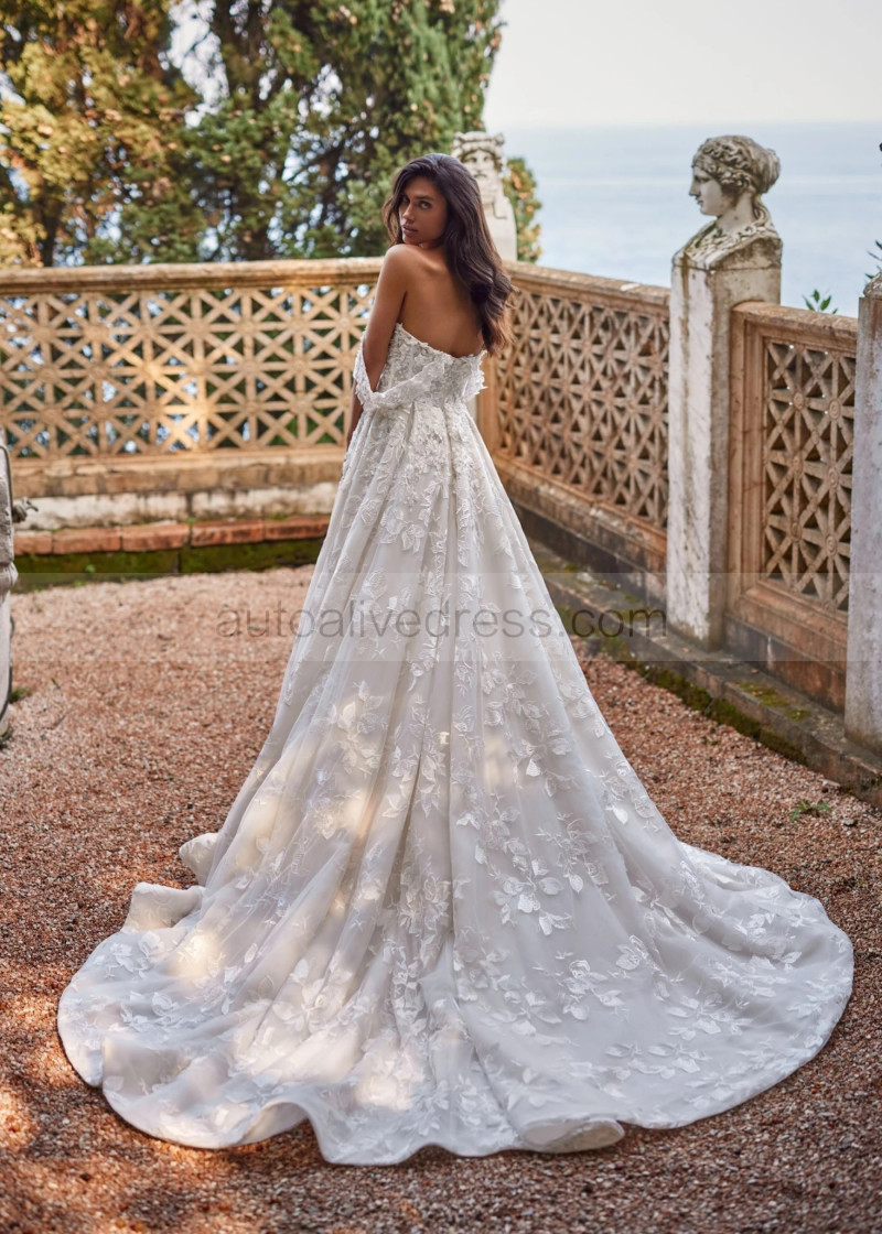 Strapless Beaded Ivory Lace Tulle Wedding Dress With Removable Straps