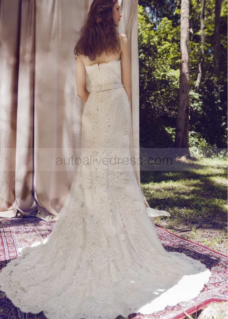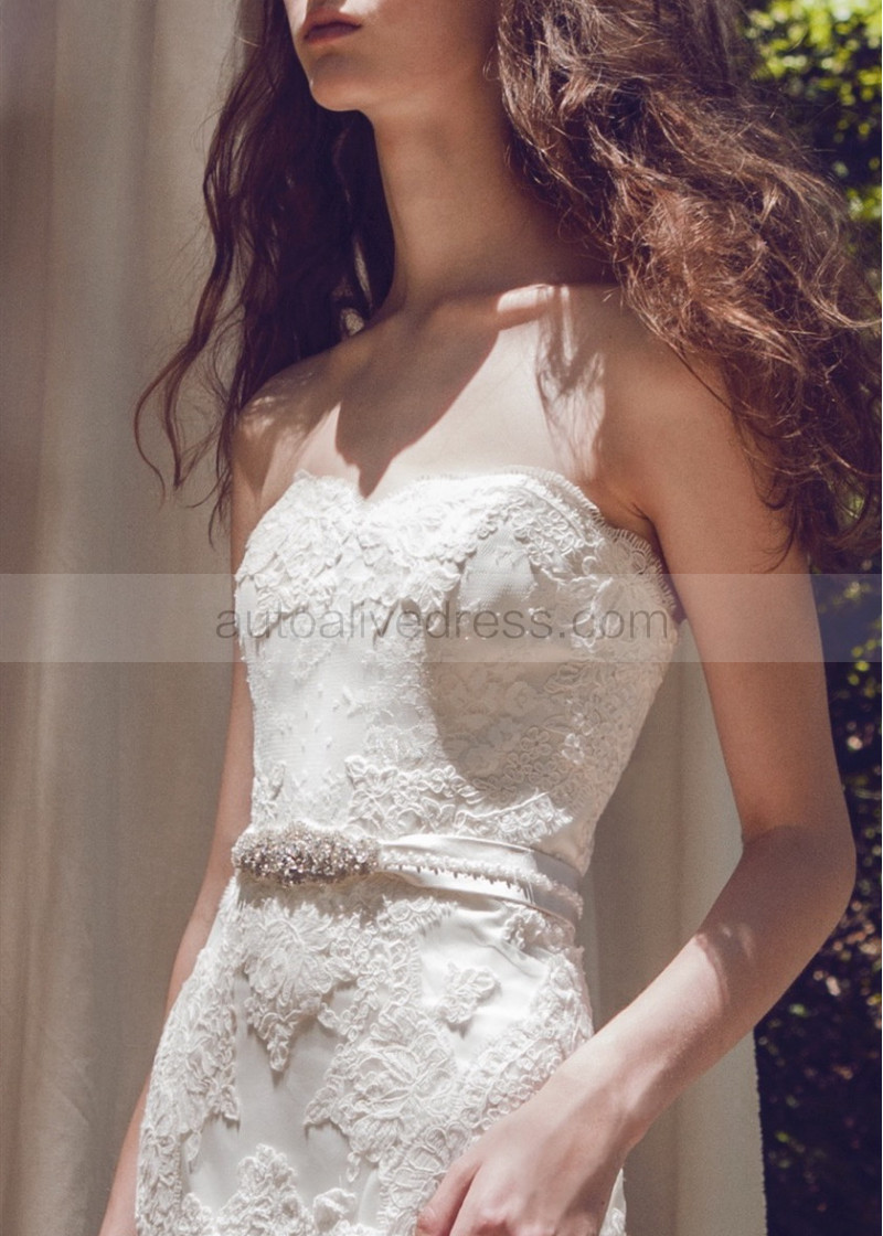 Strapless Ivory Lace Tulle Wedding Dress With Beaded Belt