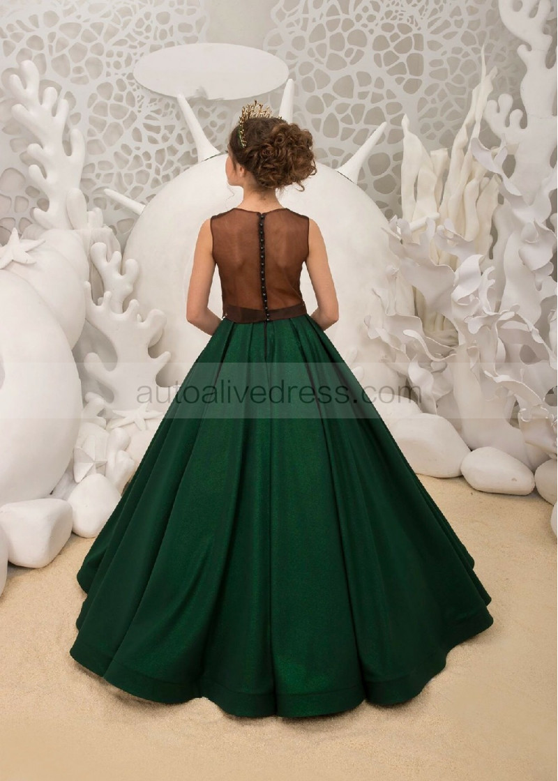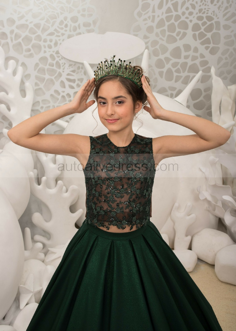 Two Pieces Beaded Dark Green Lace Satin Floor Length Flower Girl Dress