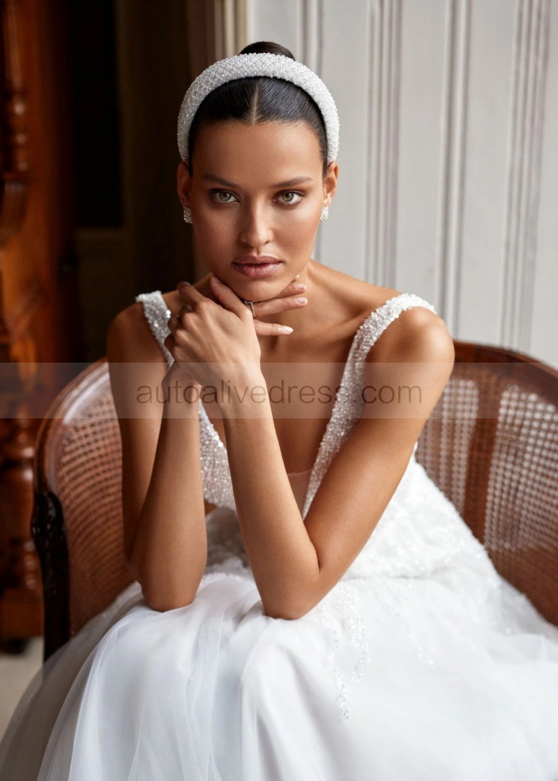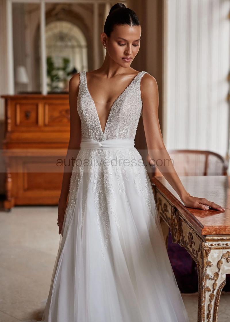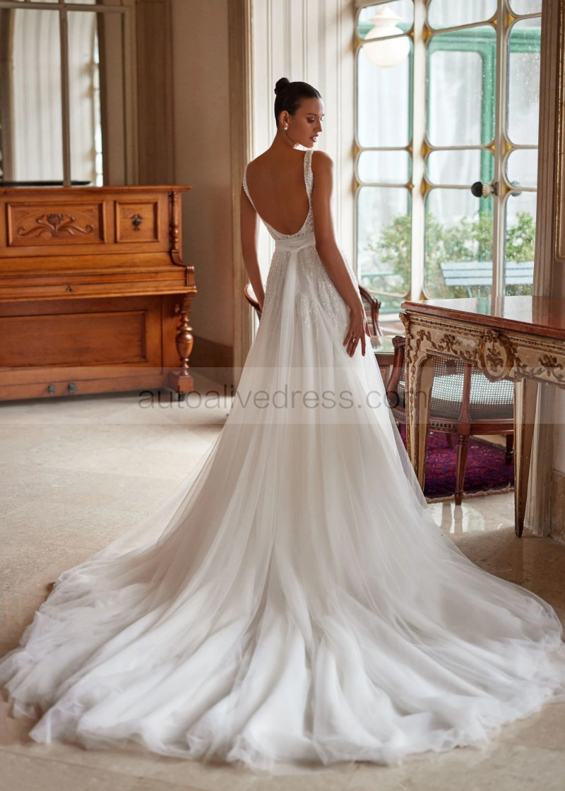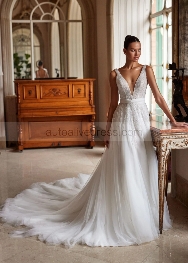 V Neck Beaded Ivory Lace Tulle Sparkling Wedding Dress