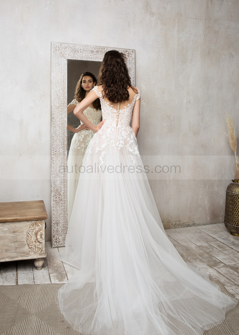 Cap Sleeves Ivory Lace Tulle Pearl Buttons Back Wedding Dress