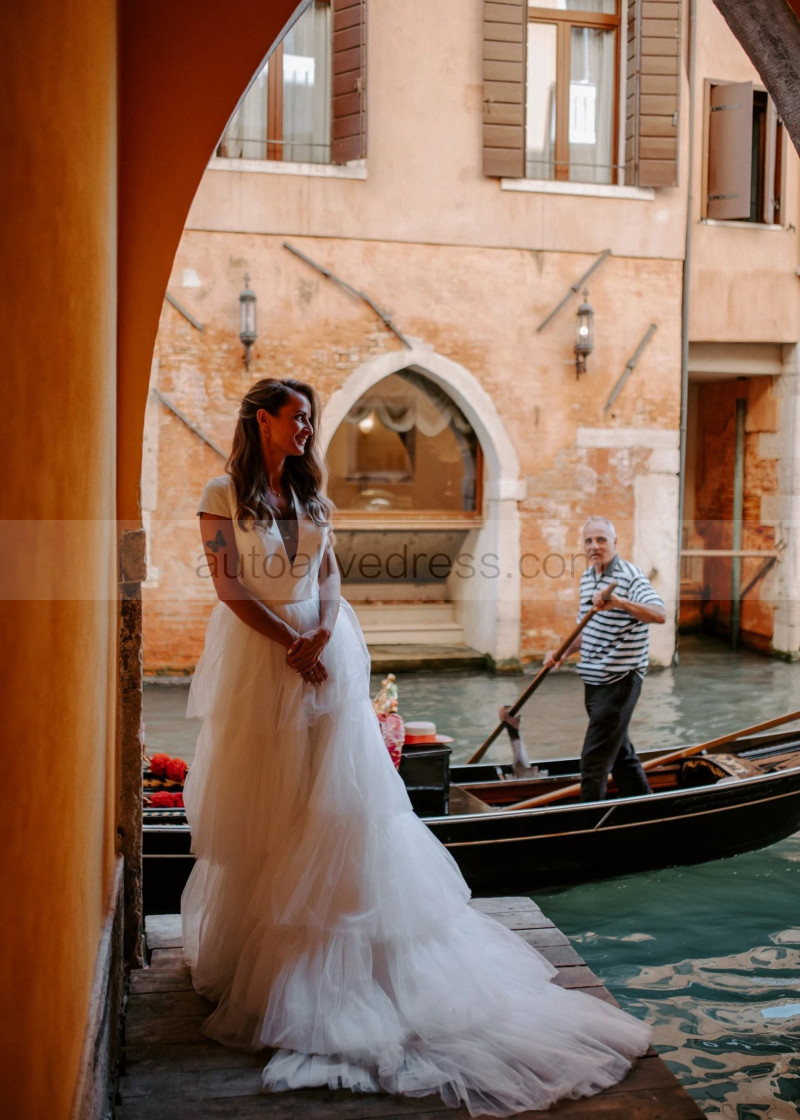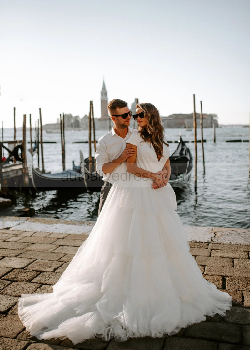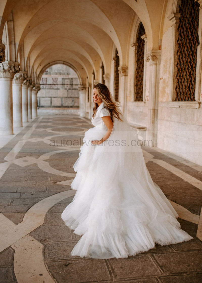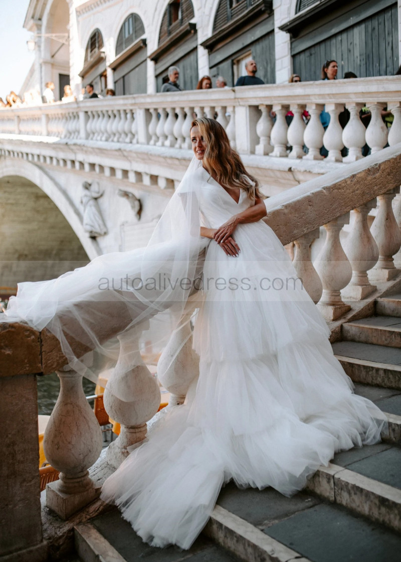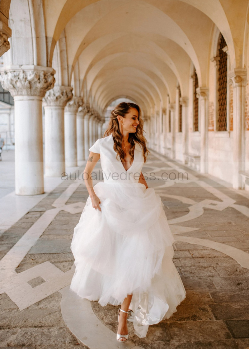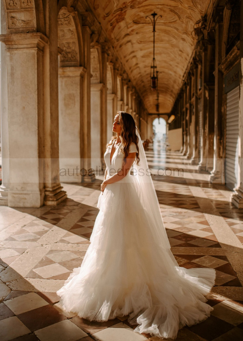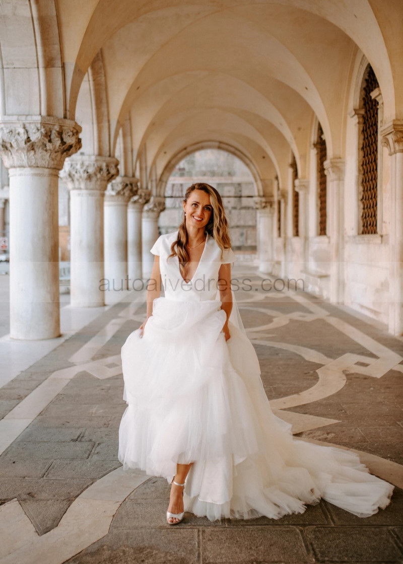 Cap Sleeves Ivory Satin Tulle Tiered Princess Wedding Dress