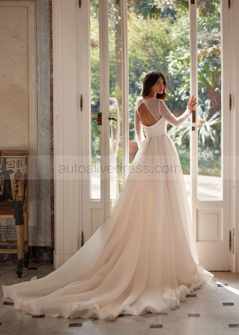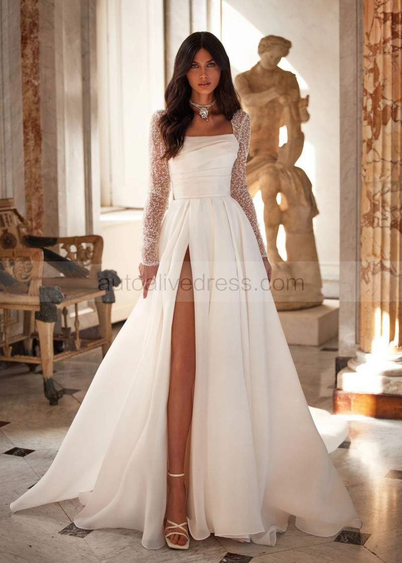Long Sleeves Ivory Glitter Lace Organza Slit Wedding Dress