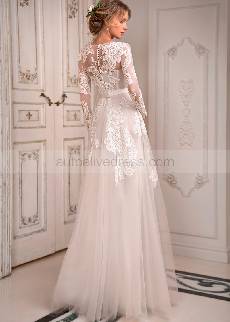 Long Sleeves Ivory Lace Tulle Fairy Wedding Dress