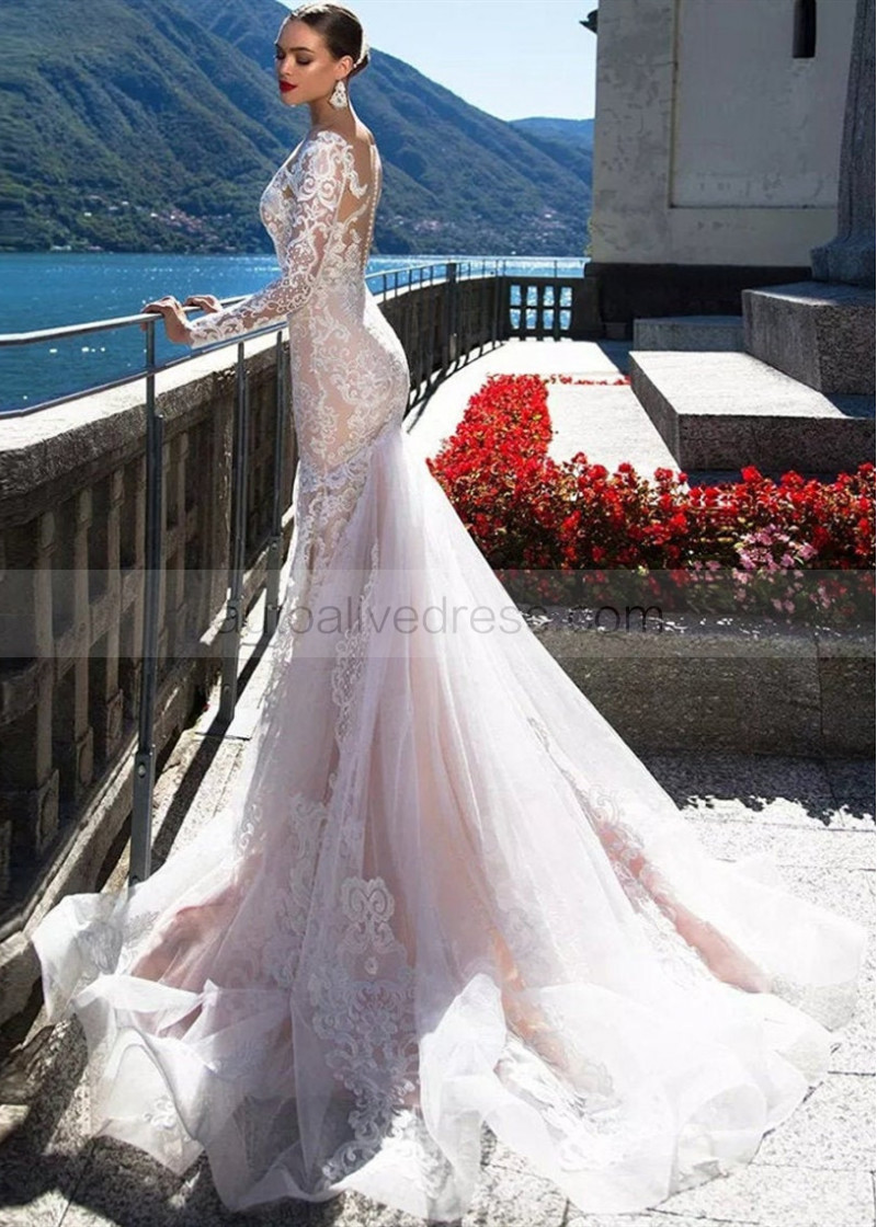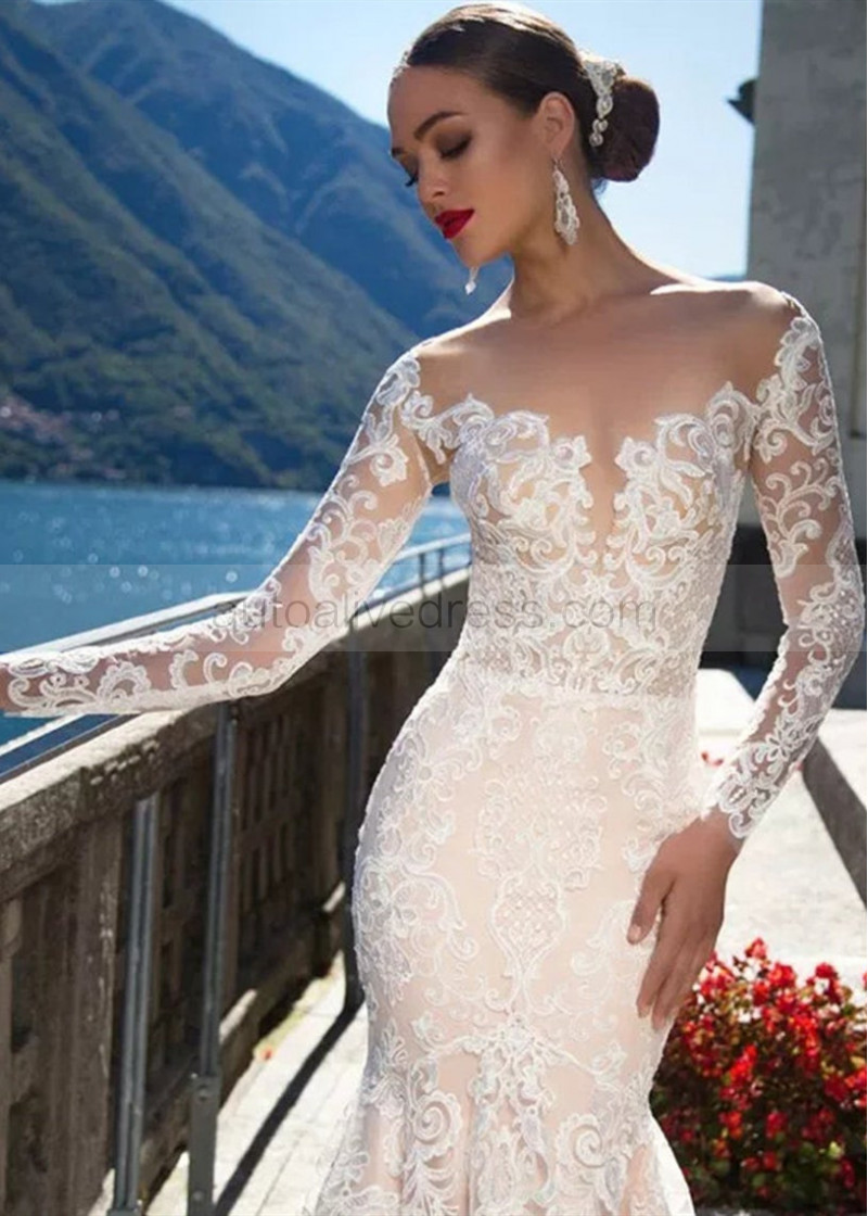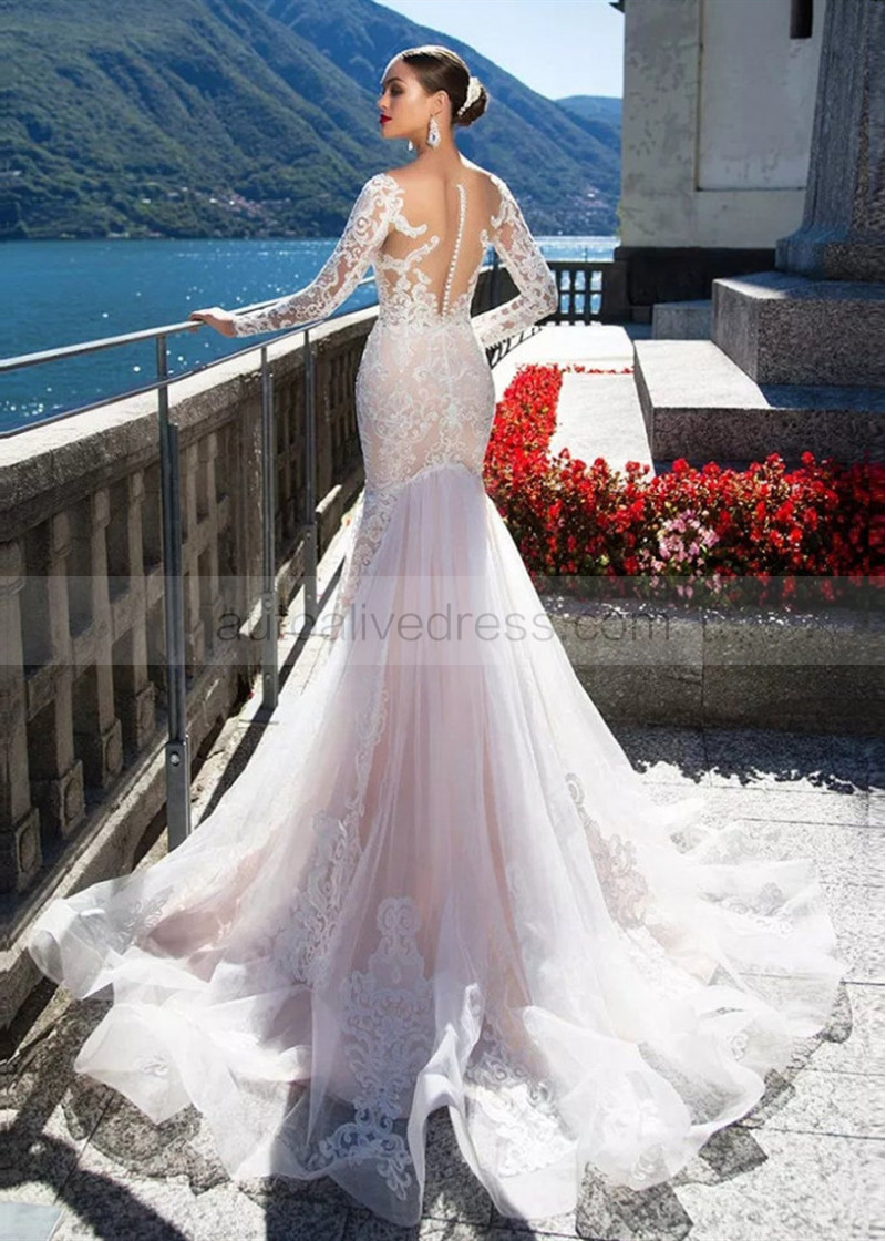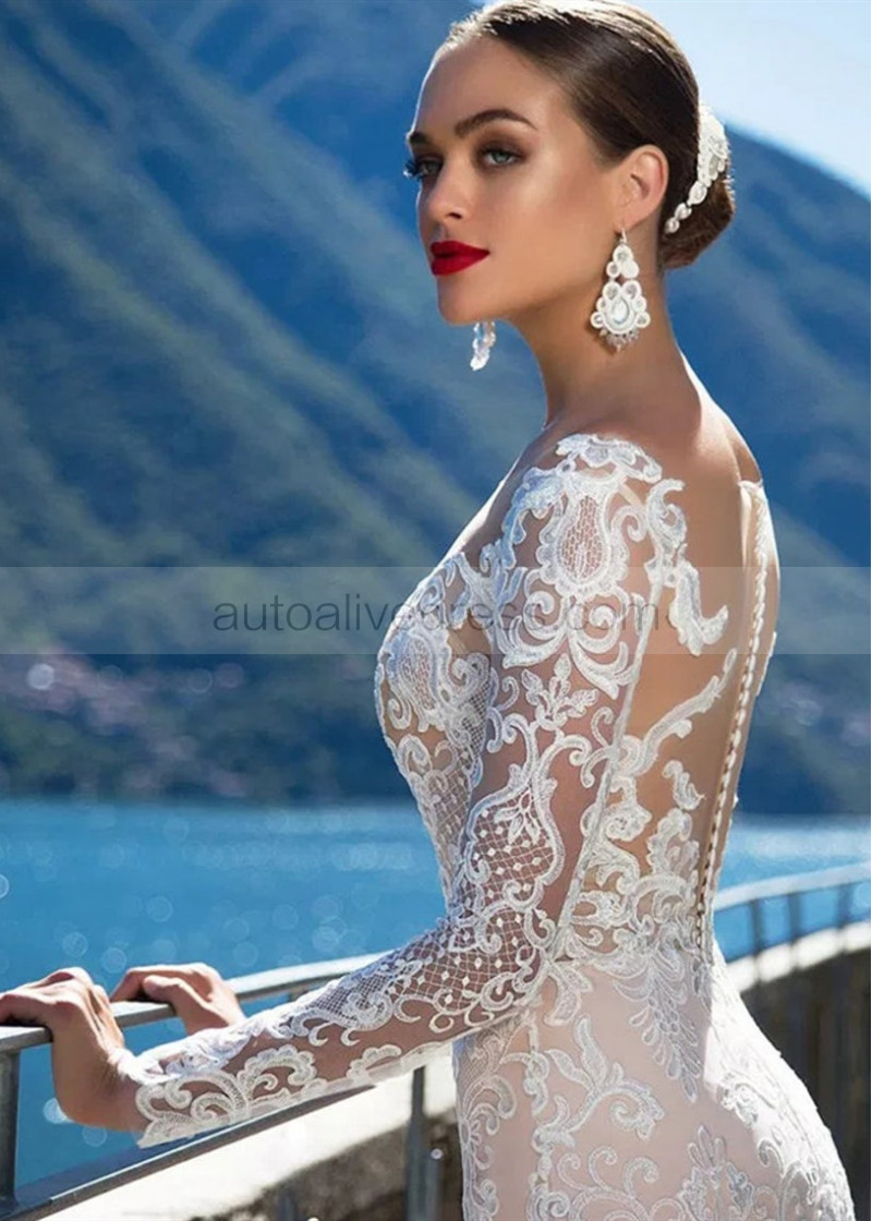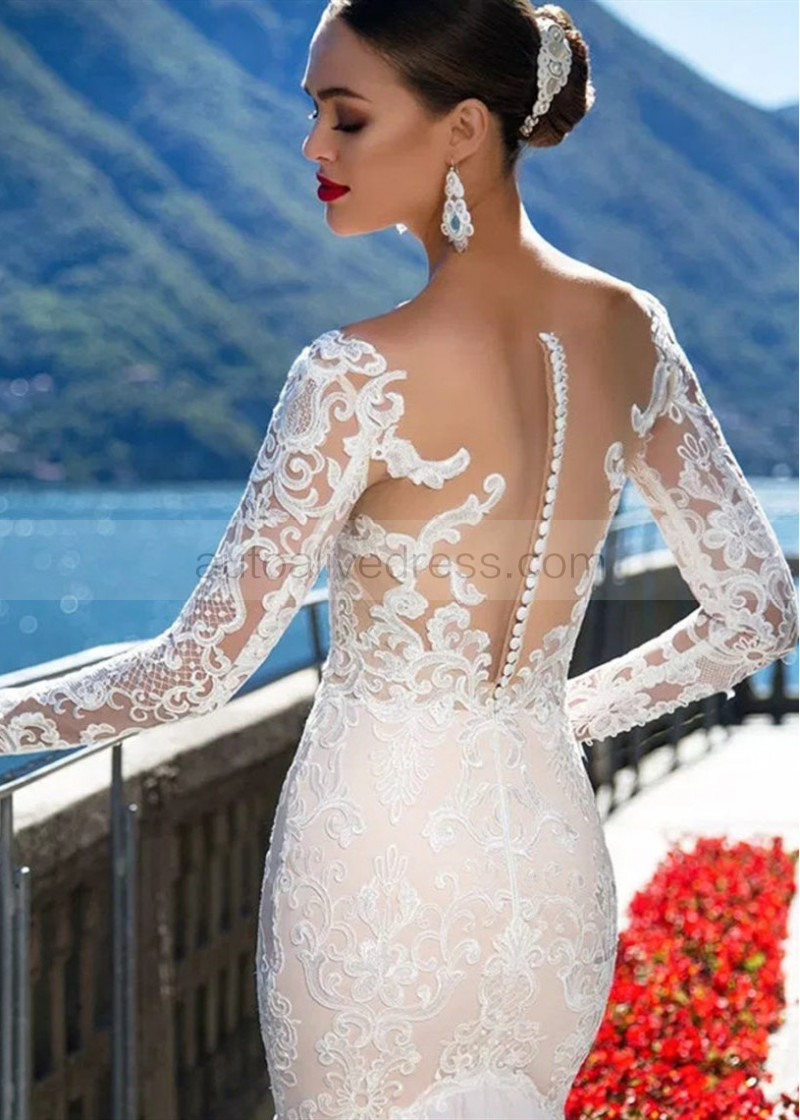 Long Sleeve Ivory Lace Tulle See Through Back Wedding Dress