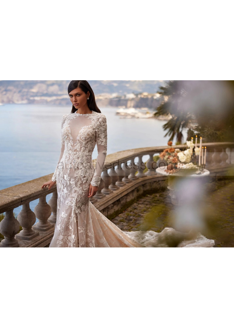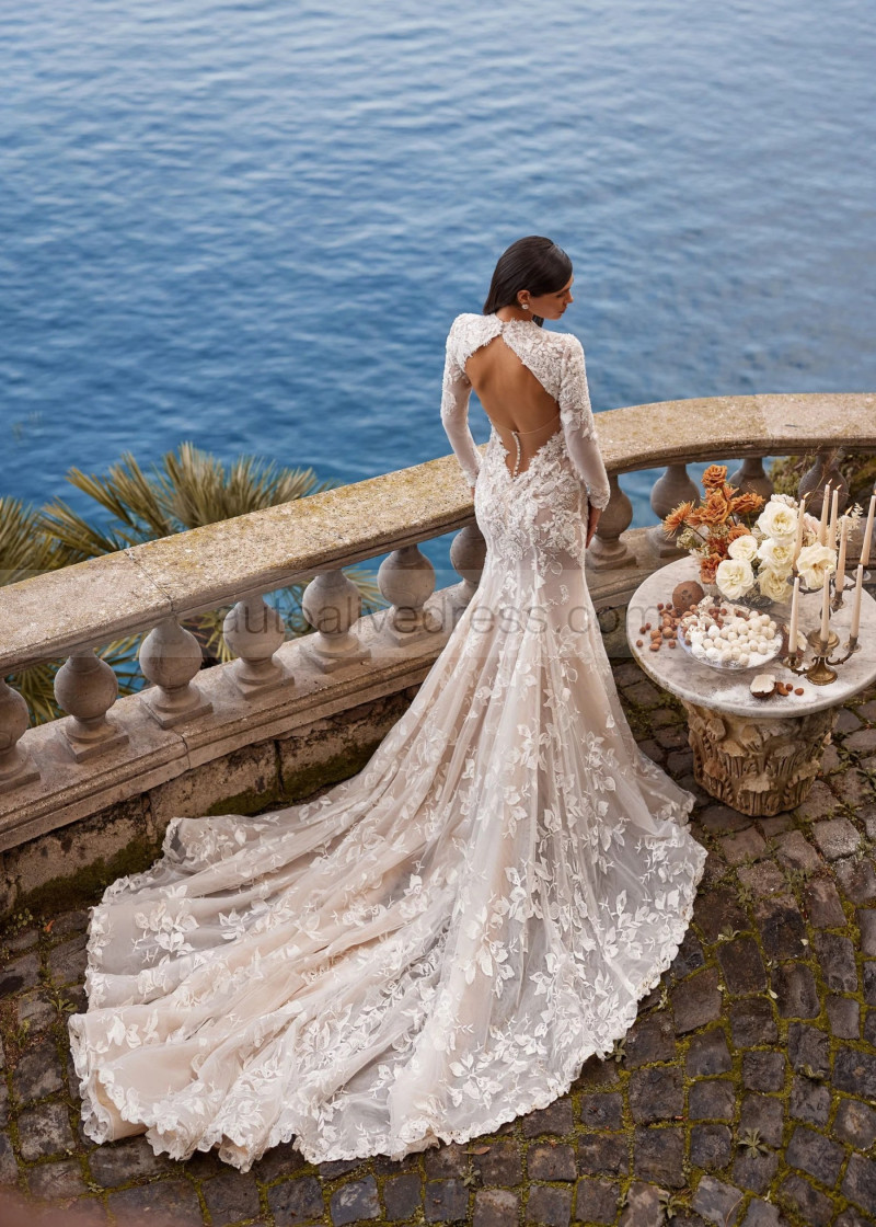 Long Sleeves Beaded Lace Tulle Keyhole Back Elegant Wedding Dress