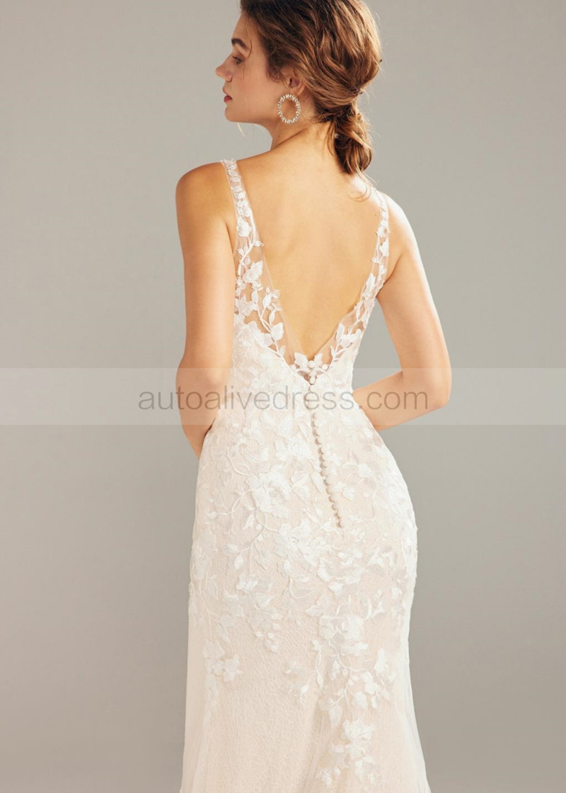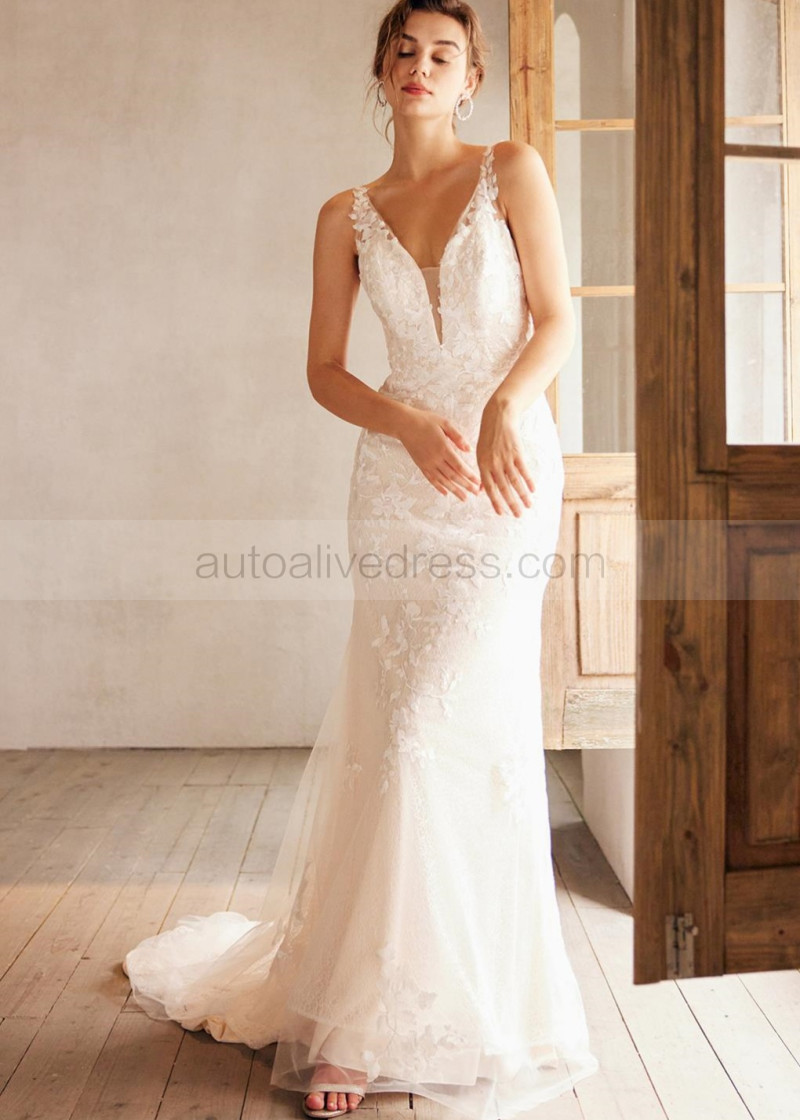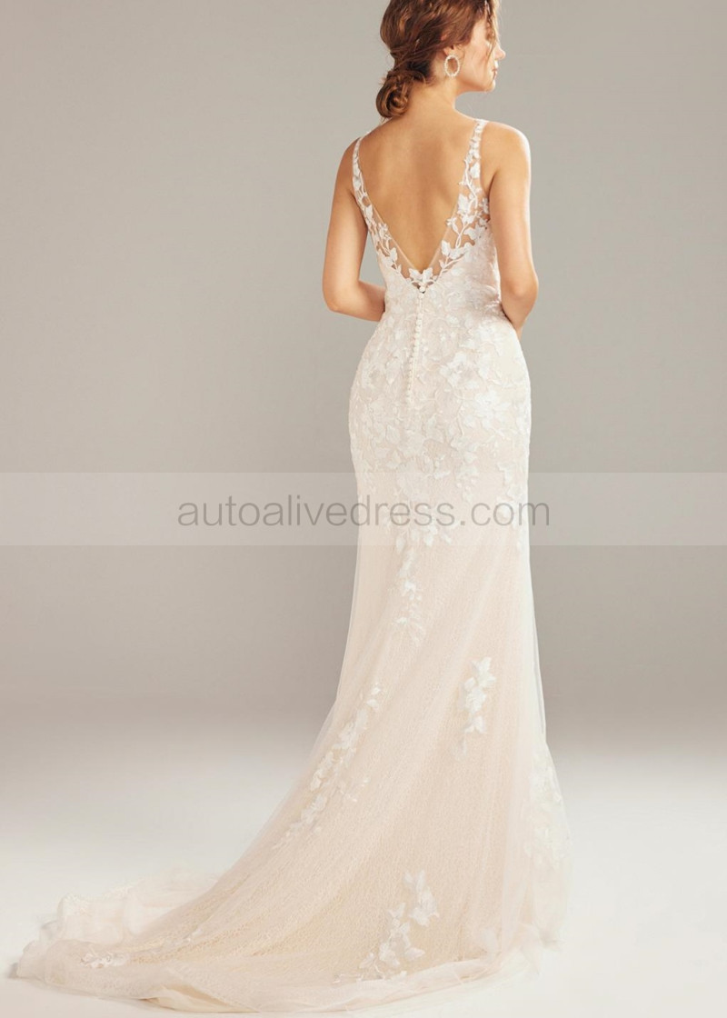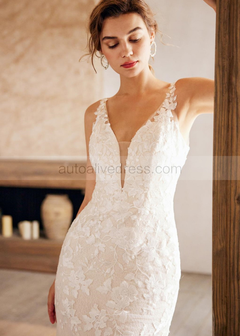 Plunging Neck Ivory Lace Tulle Rustic Wedding Dress