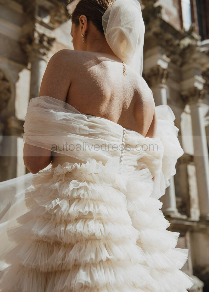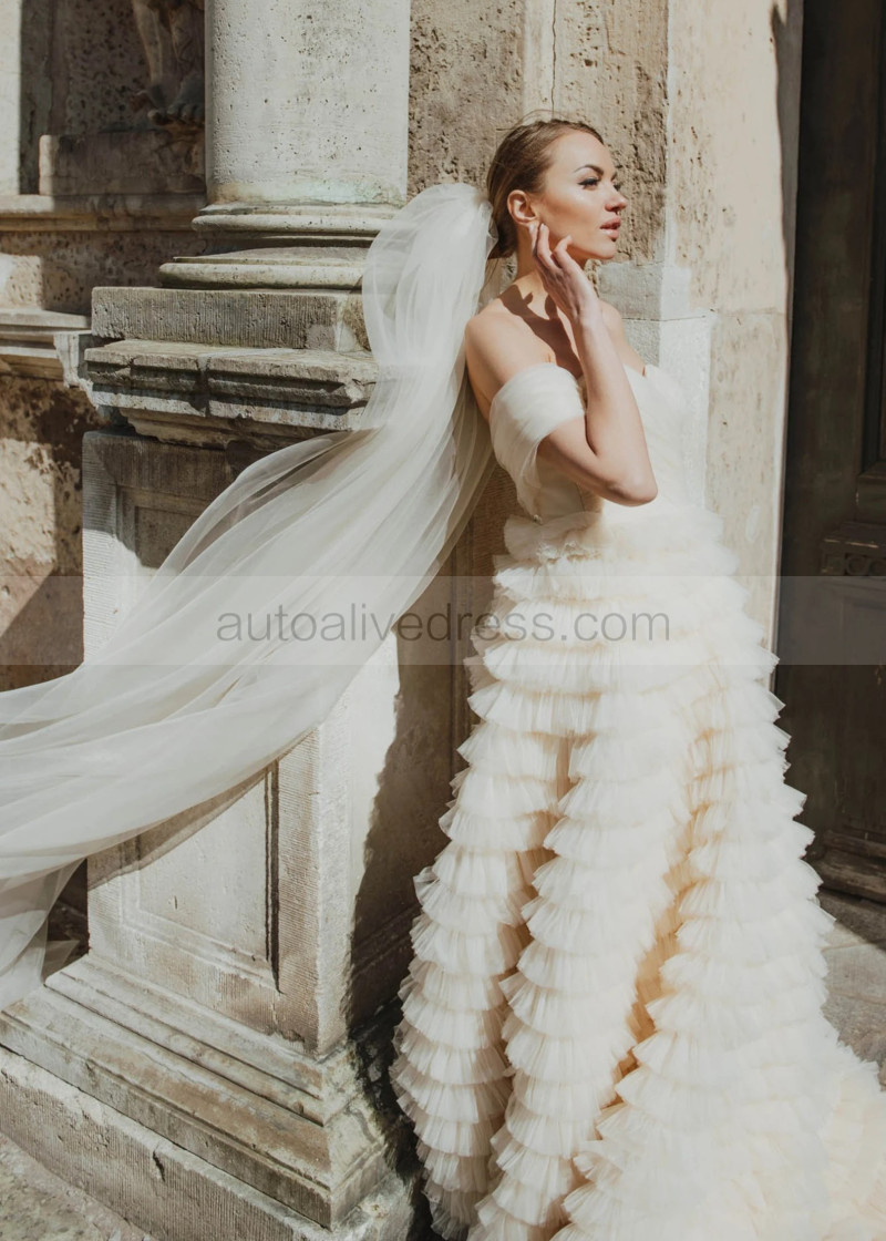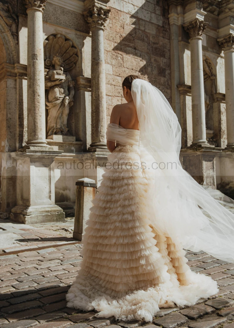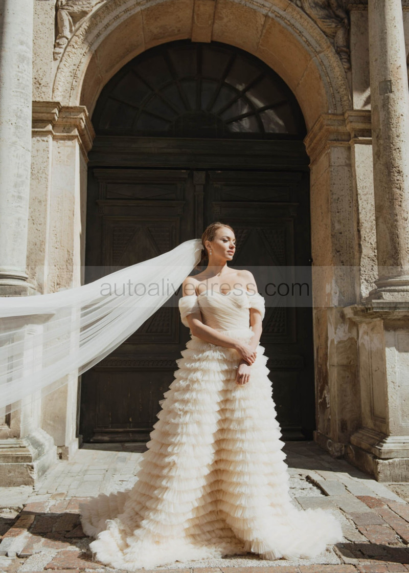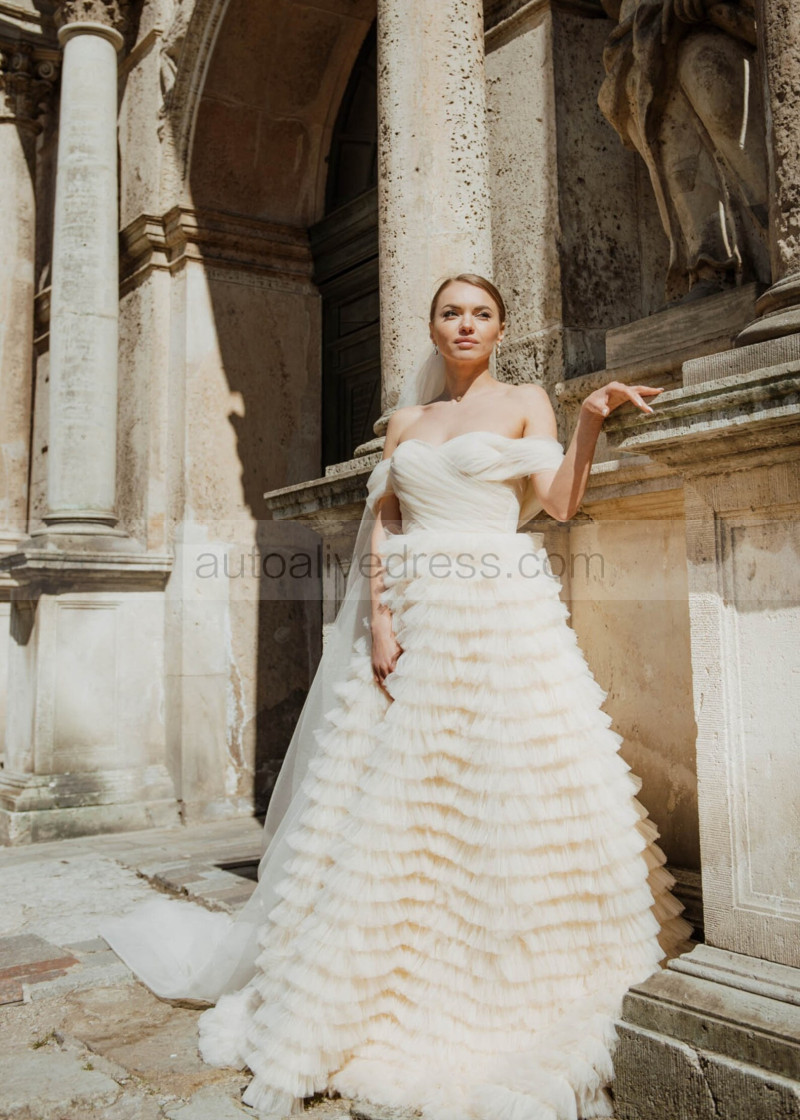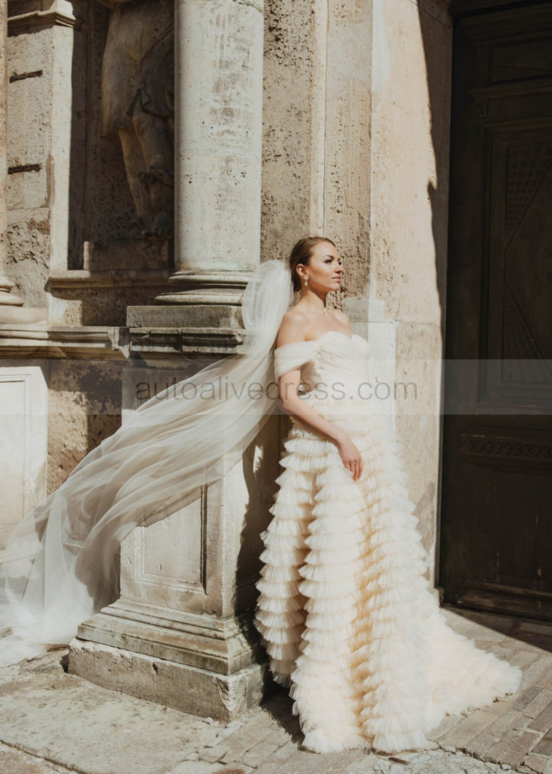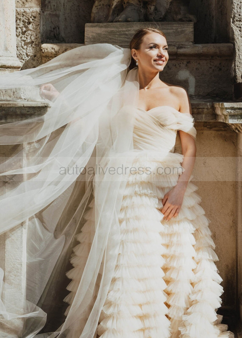 Off Shoulder Champagne Tulle Ruffled Luxurious Wedding Dress