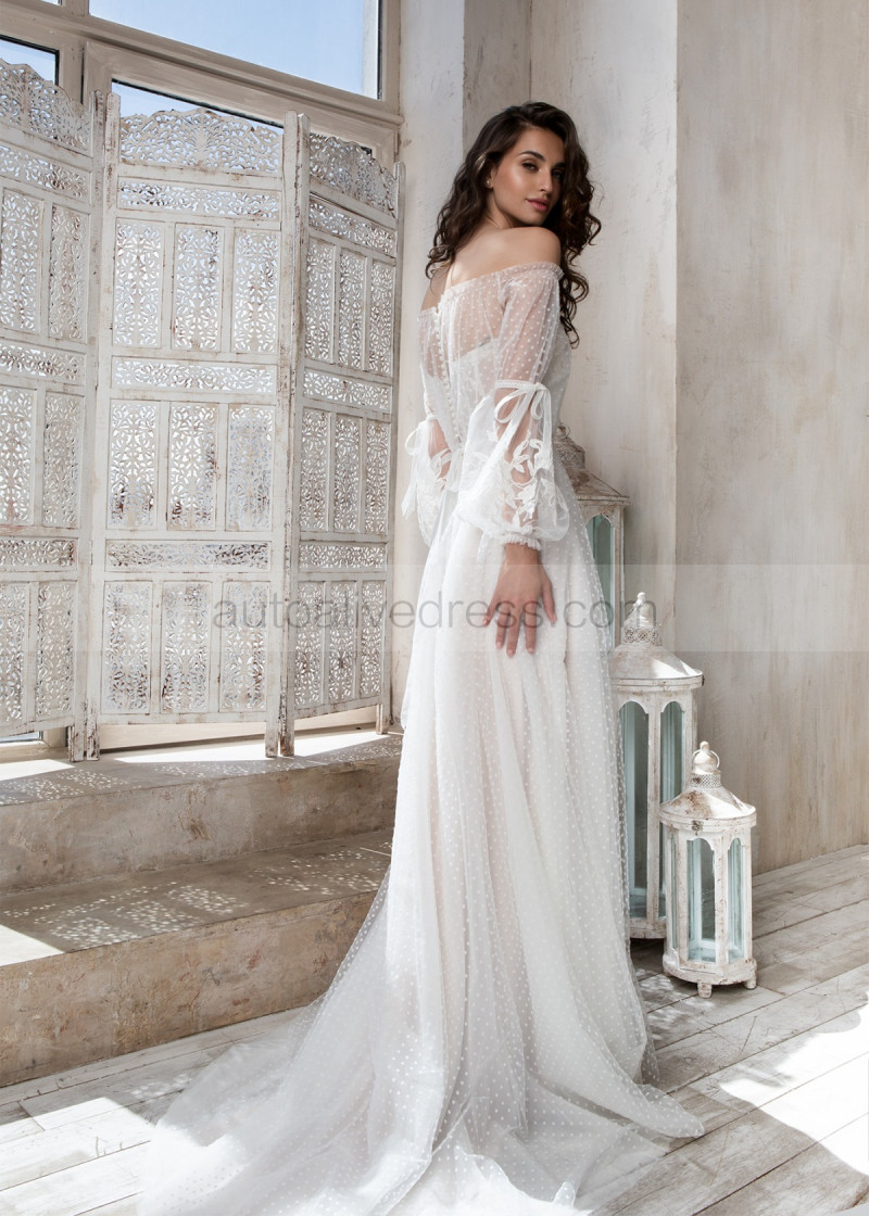 Off Shoulder Ivory Lace Dots Tulle Sweet Wedding Dress
