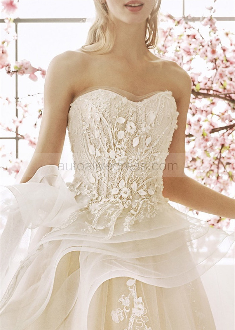 Strapless Beaded Ivory Lace Tulle Ruffle Wedding Dress With Horsehair Trim