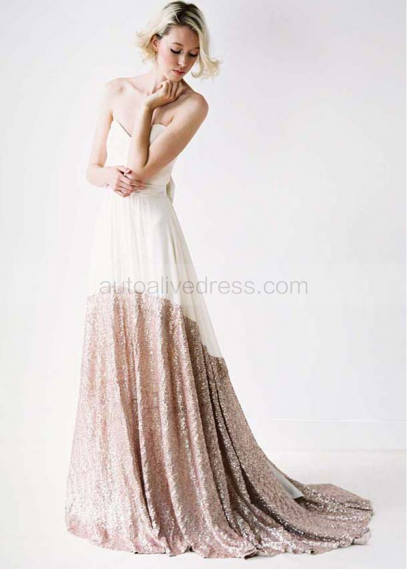 Strapless Sweetheart Neckline Ivory Chiffon Champagne Sequin Wedding Dress