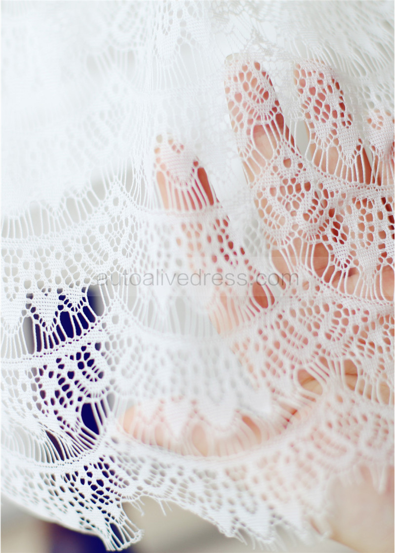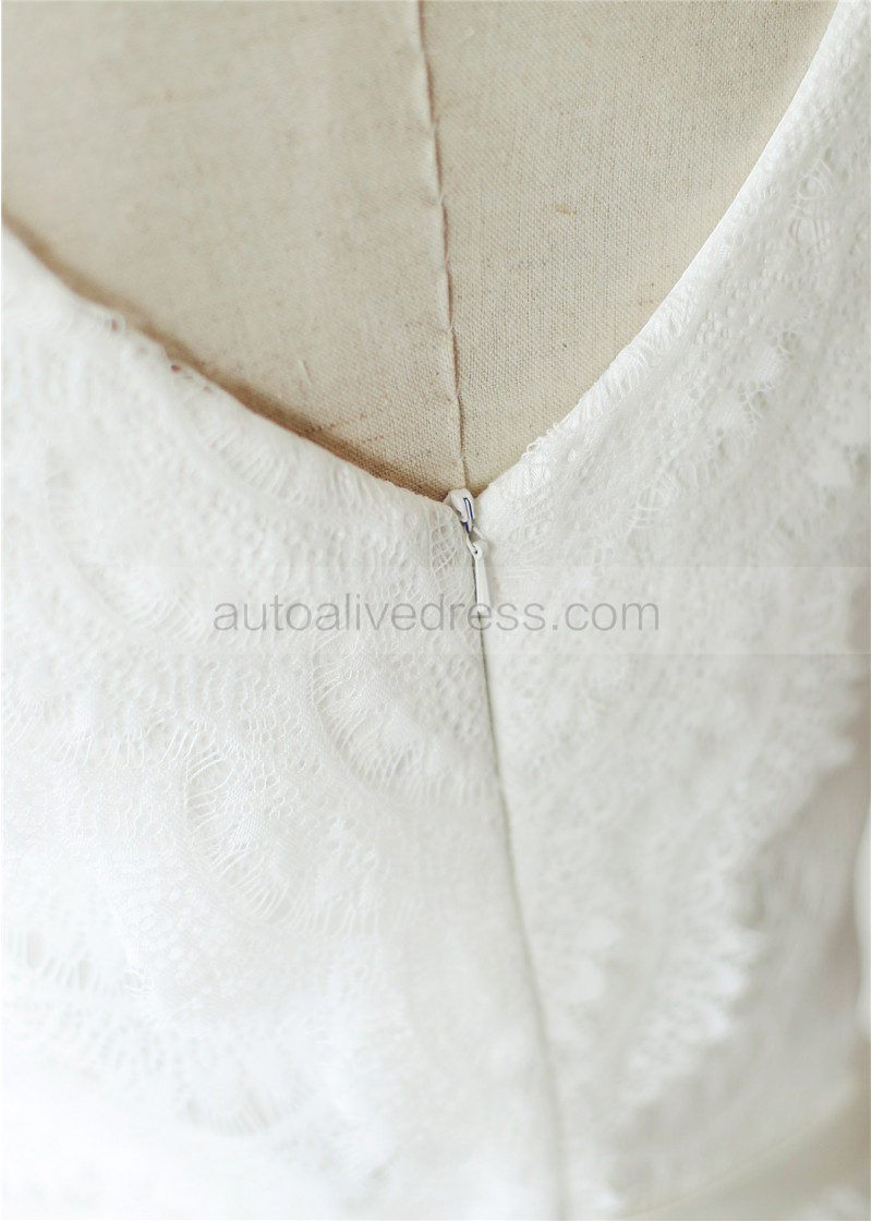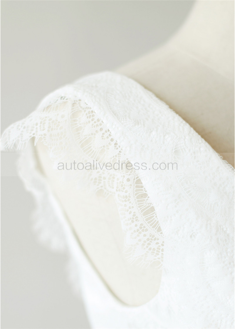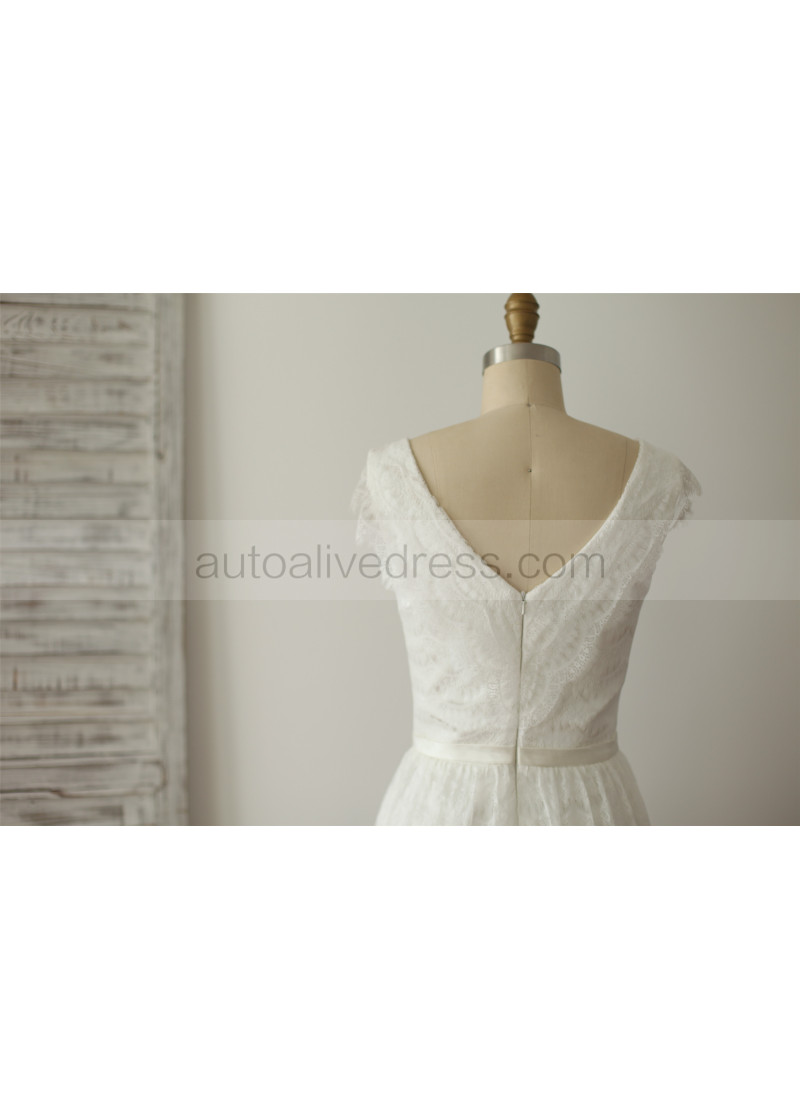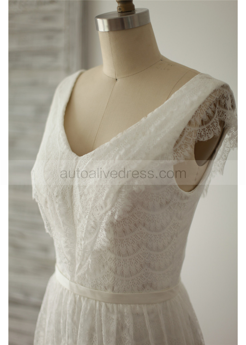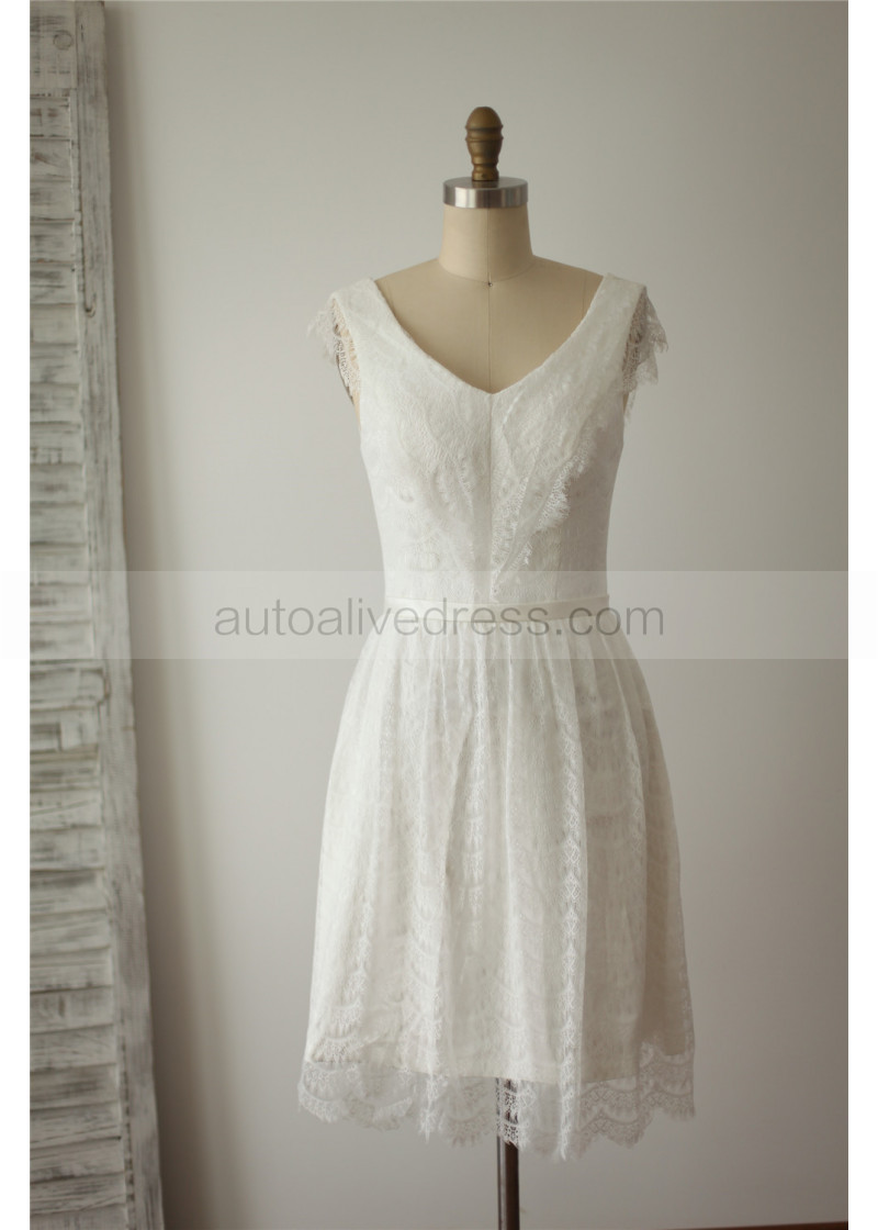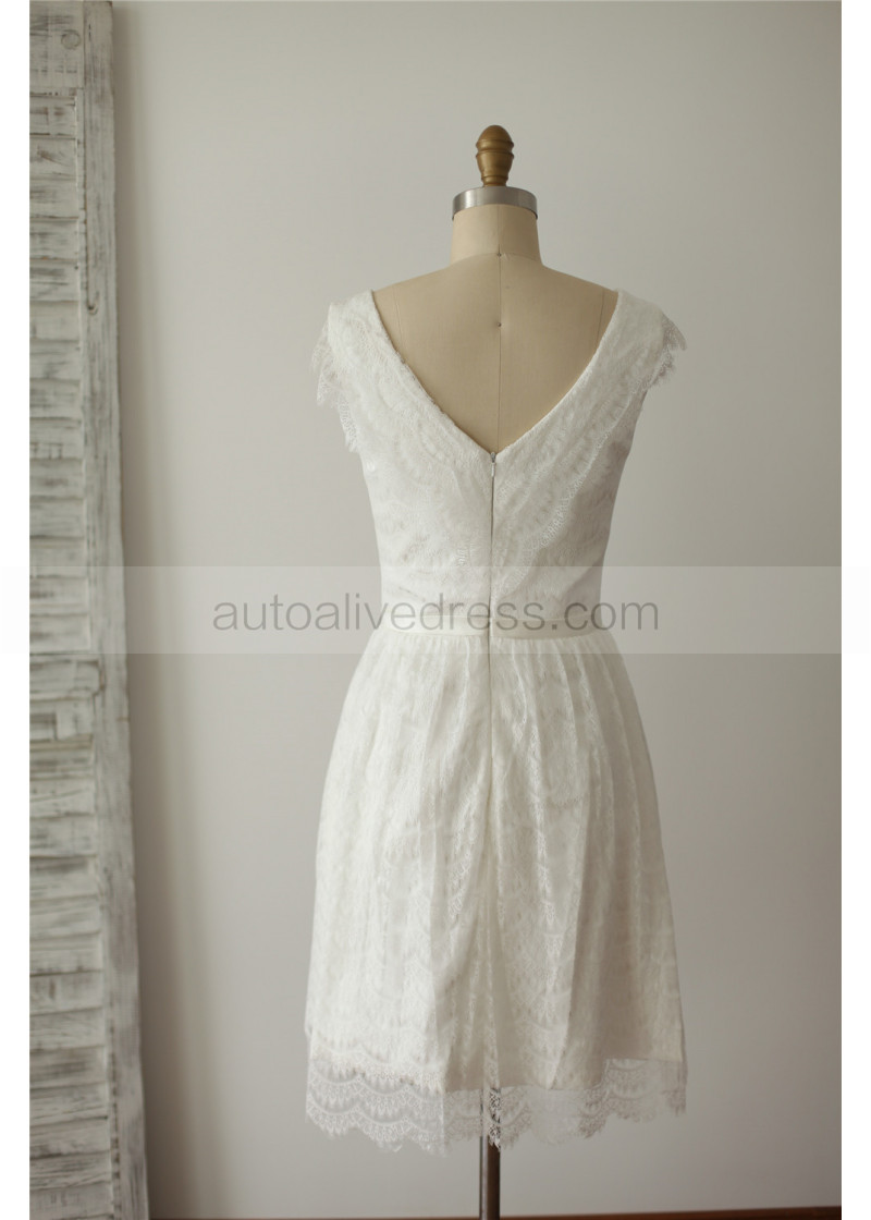 V Neck Ivory Eyelash Lace Knee Length Romantic Wedding Dress