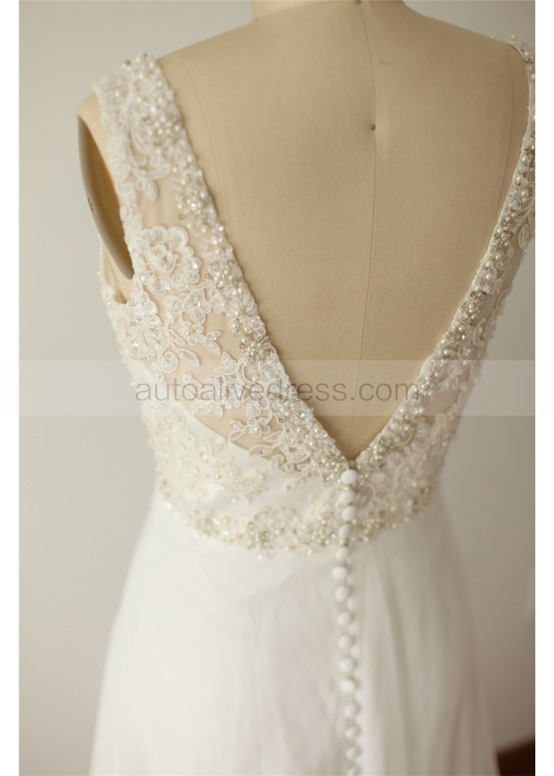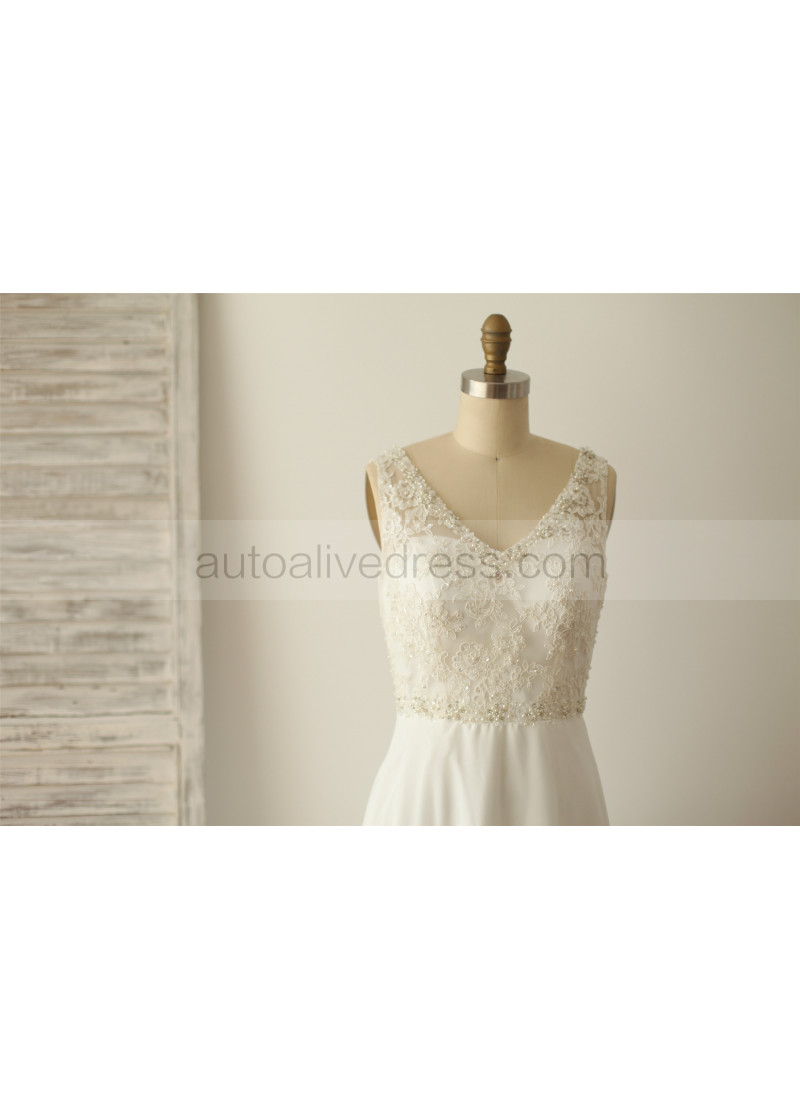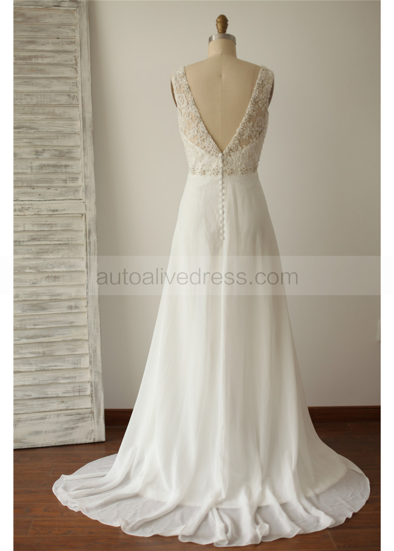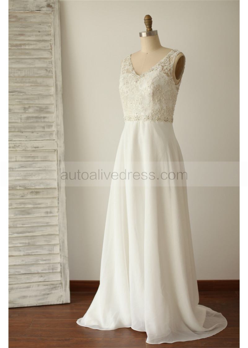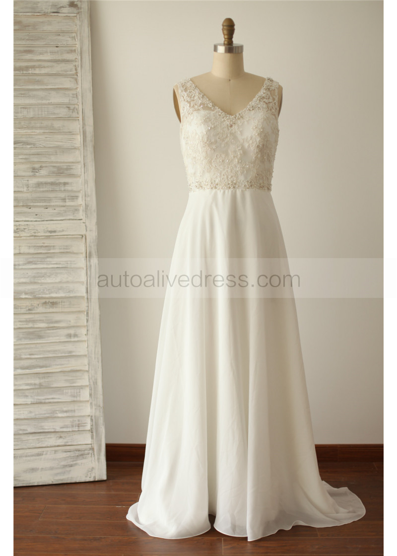 V Neckline Ivory Beaded Lace Chiffon Long Wedding Dress
