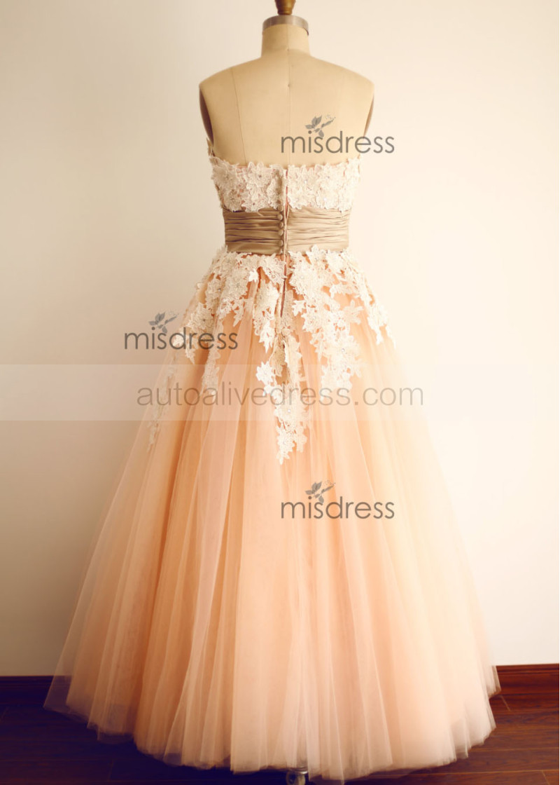 Strapless Ivory Lace Champagne Tulle Ankle Length Wedding Dress