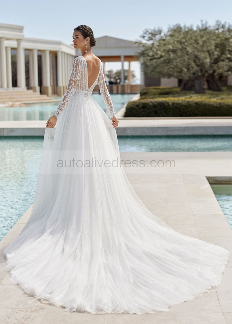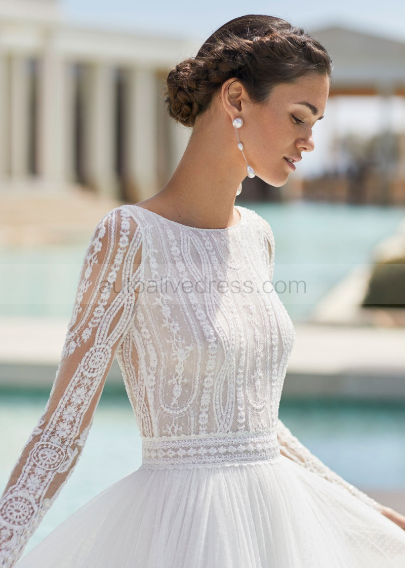 Bateau Neck Ivory Lace Dotted Tulle Beaded Wedding Dress