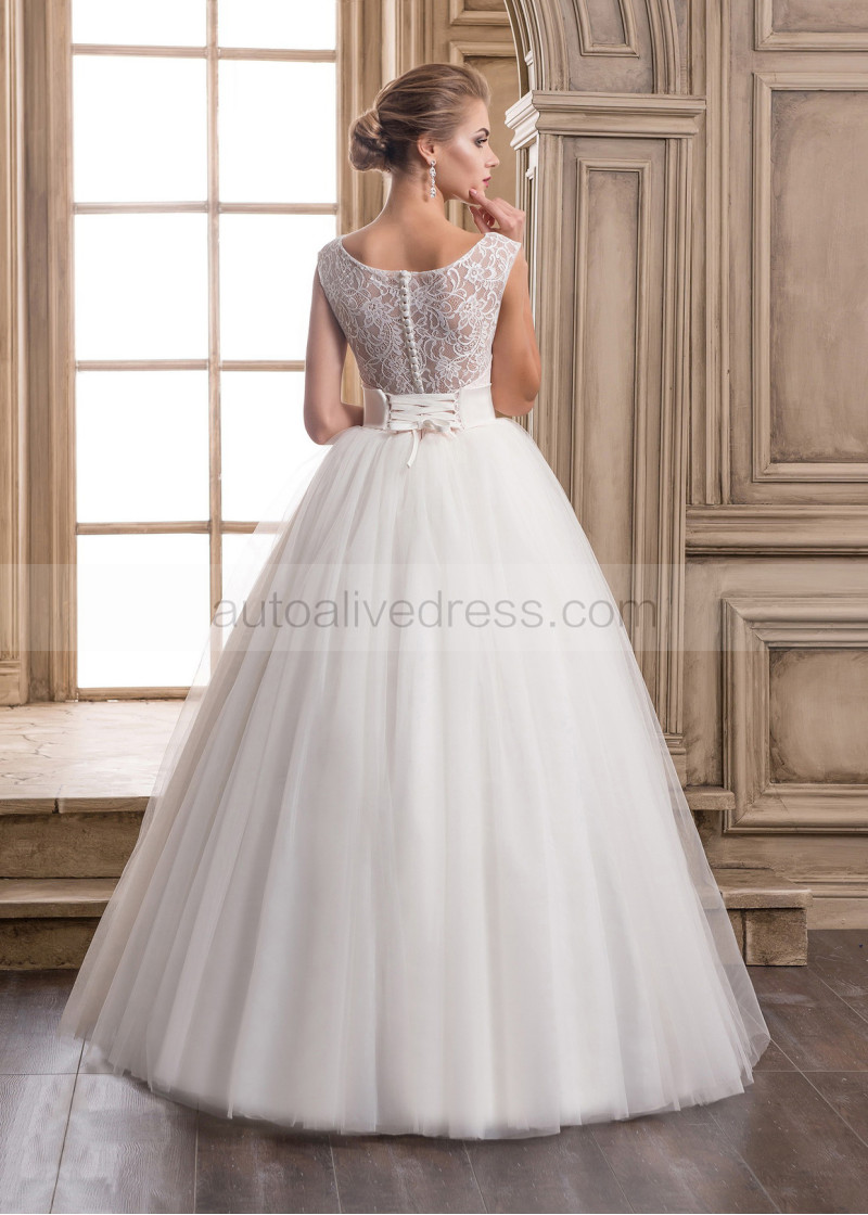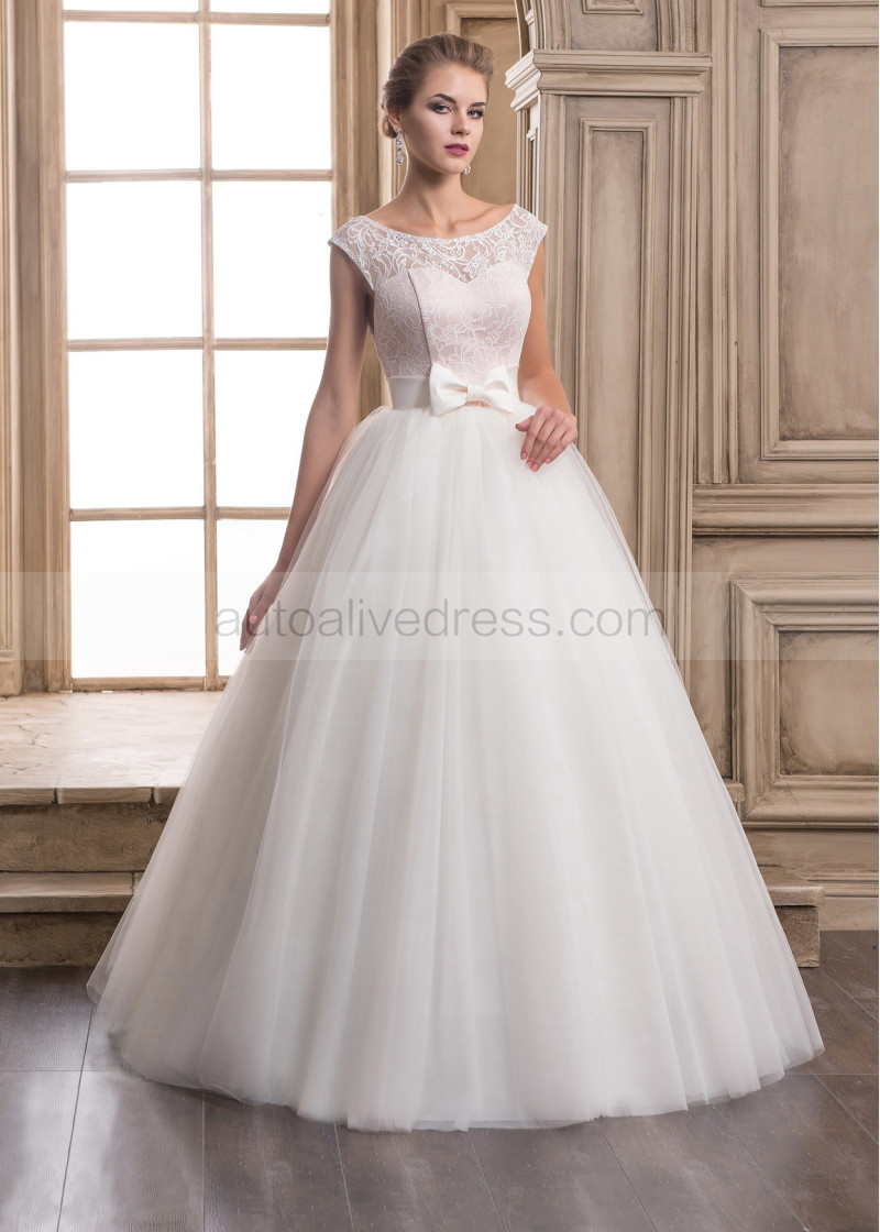 Bateau Neck Lace Tulle Wedding Dress With Pink Lining