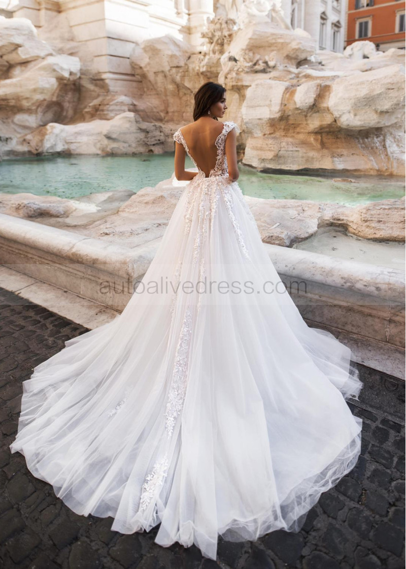 Beaded Cap Sleeve Ivory Lace Tulle Tasteful Wedding Dress