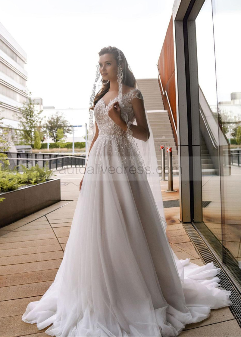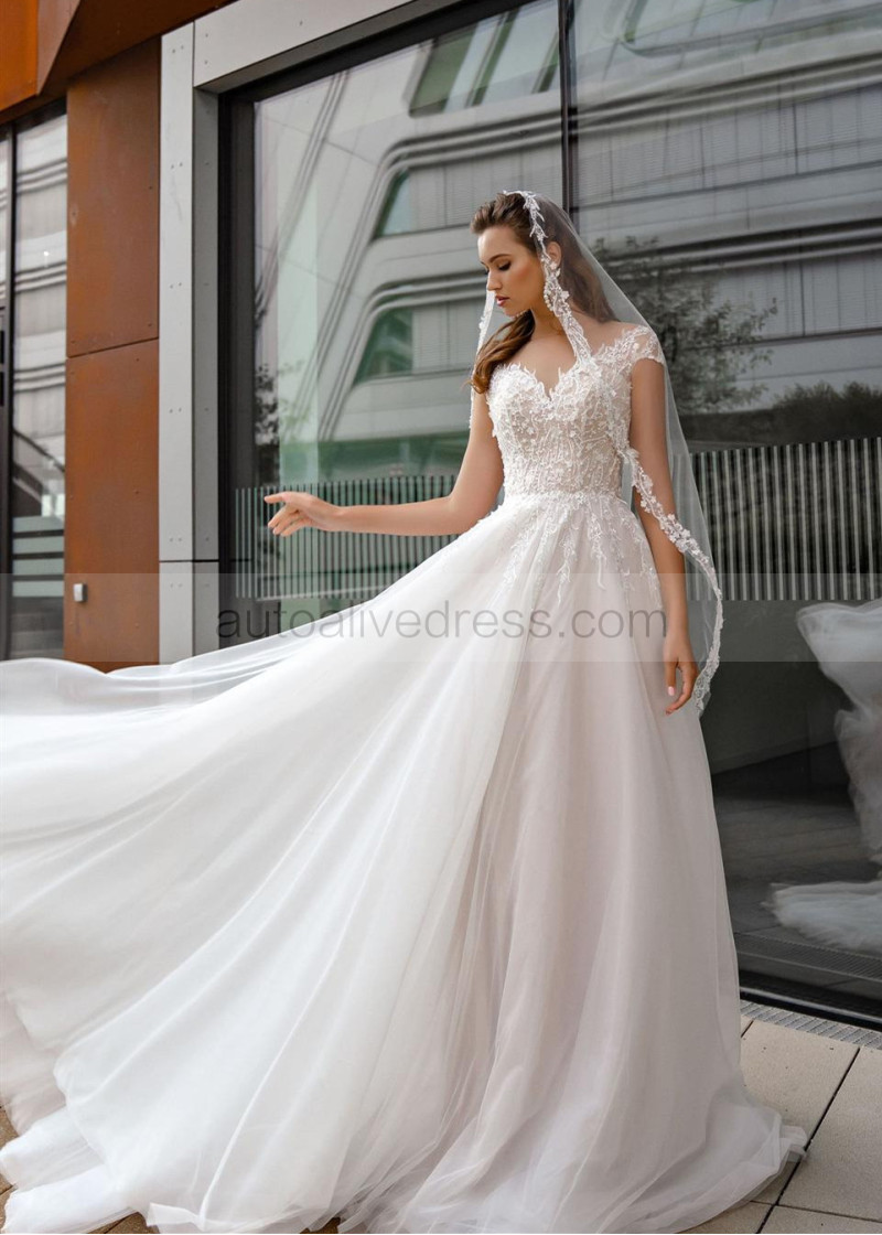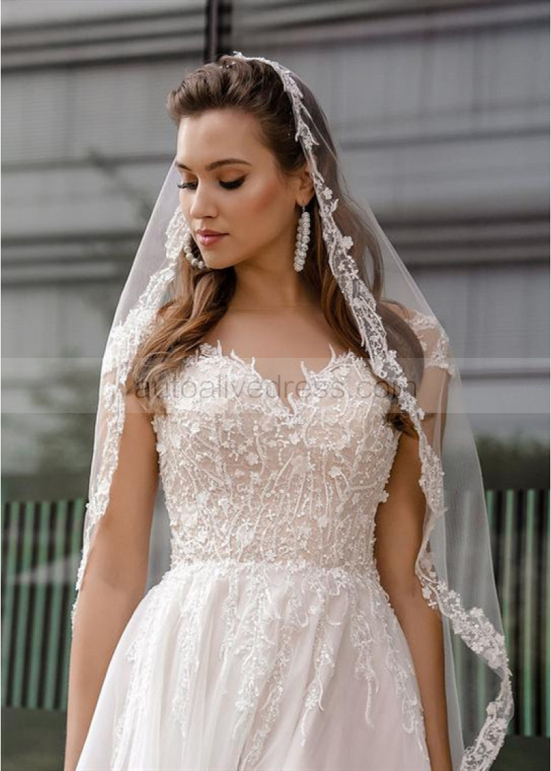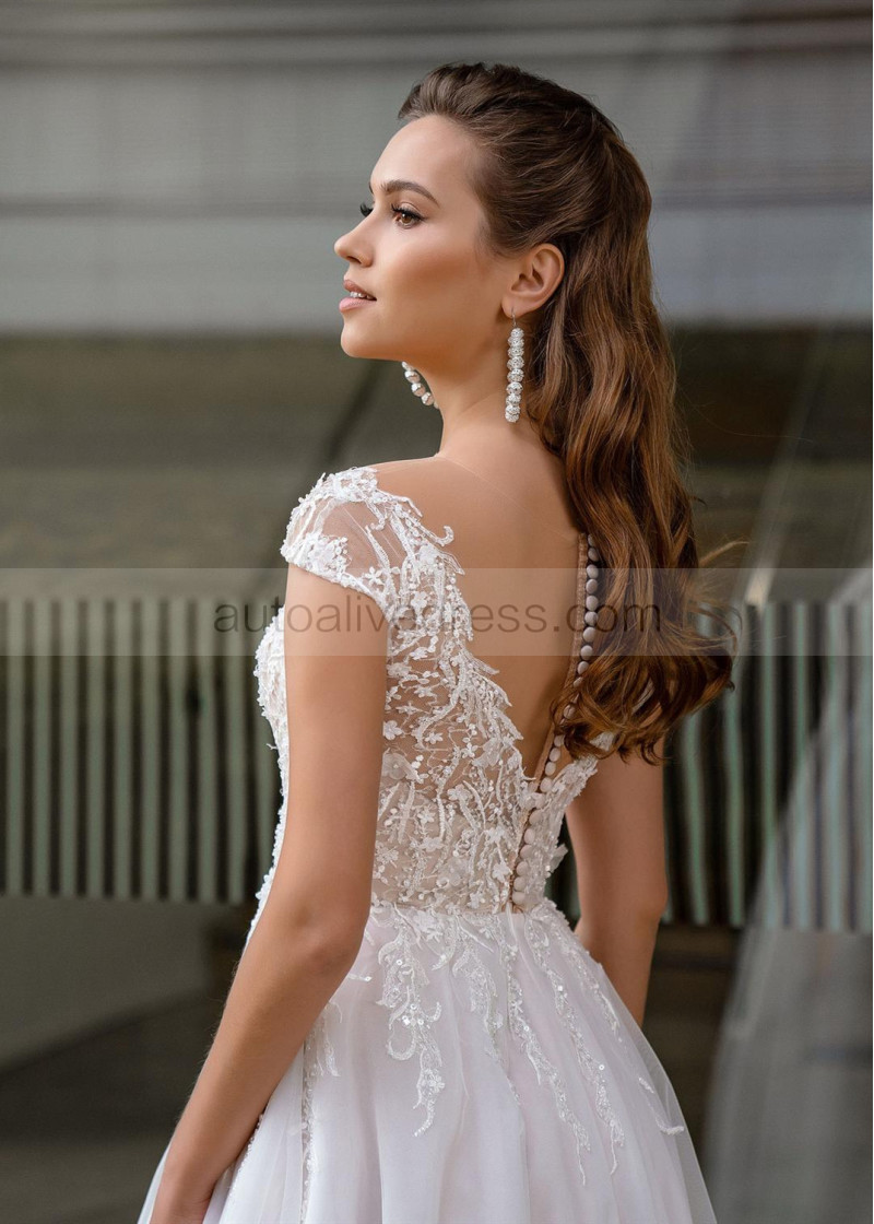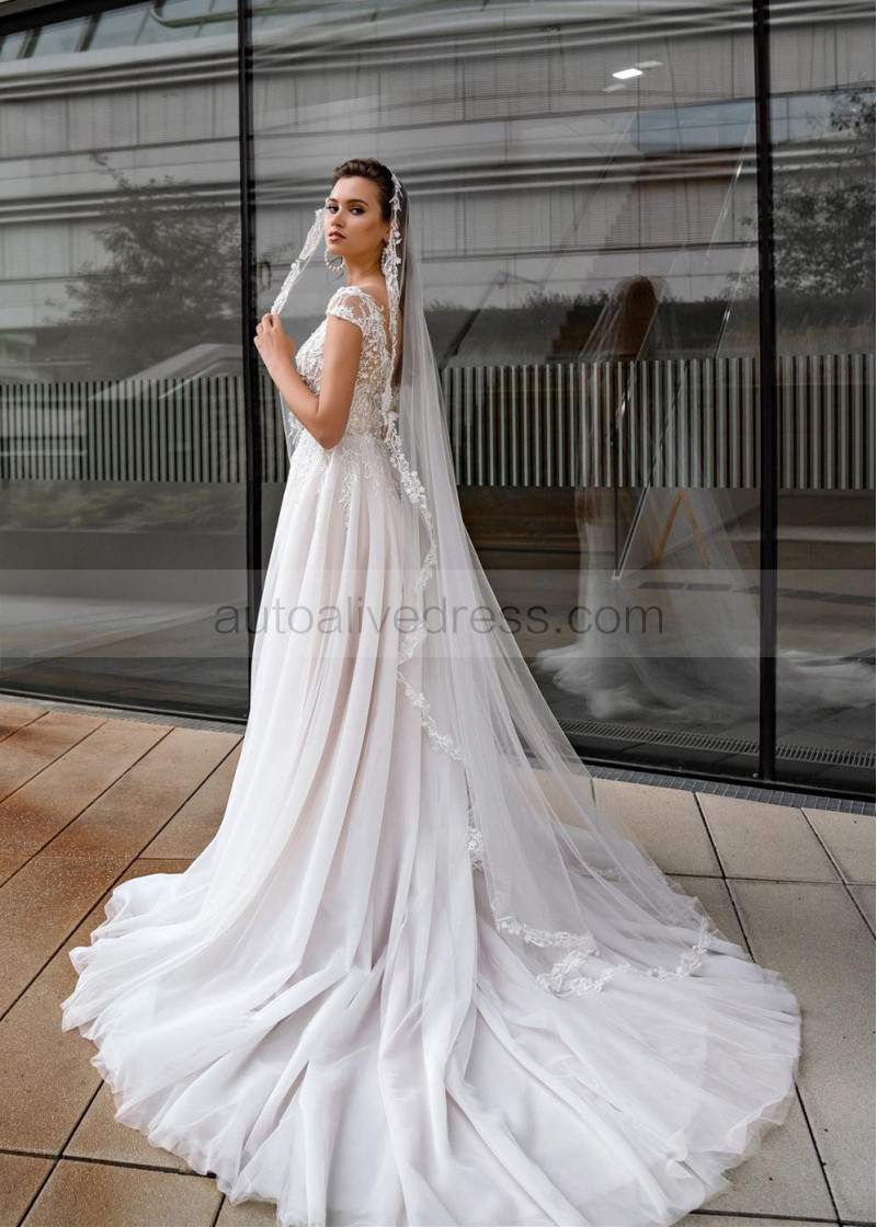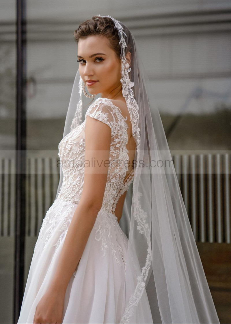 Beaded Cap Sleeves Ivory Lace Tulle Wedding Dress