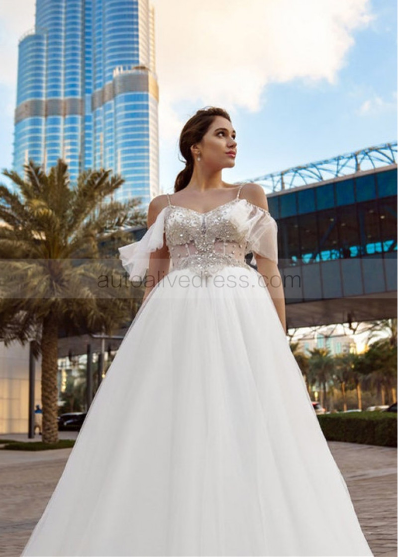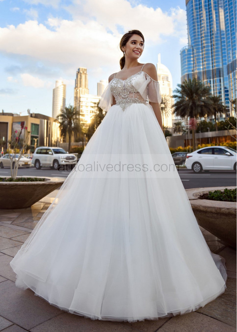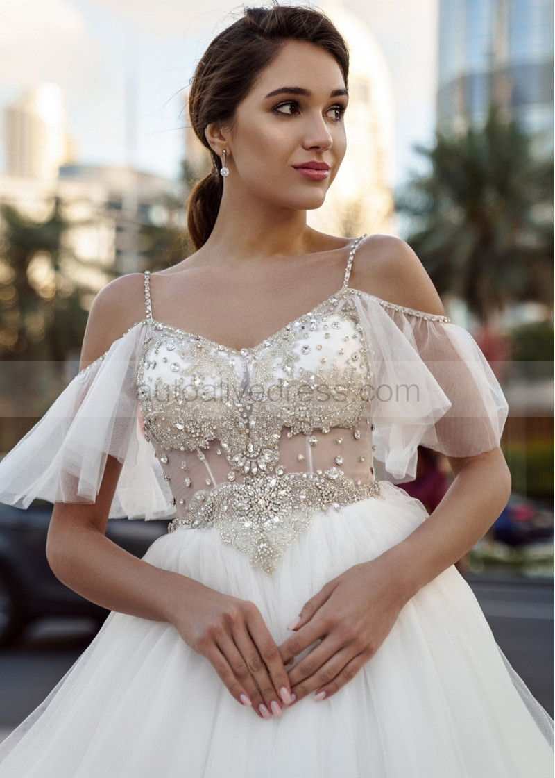 Beaded Cold Shoulder Ivory Tulle Wedding Dress