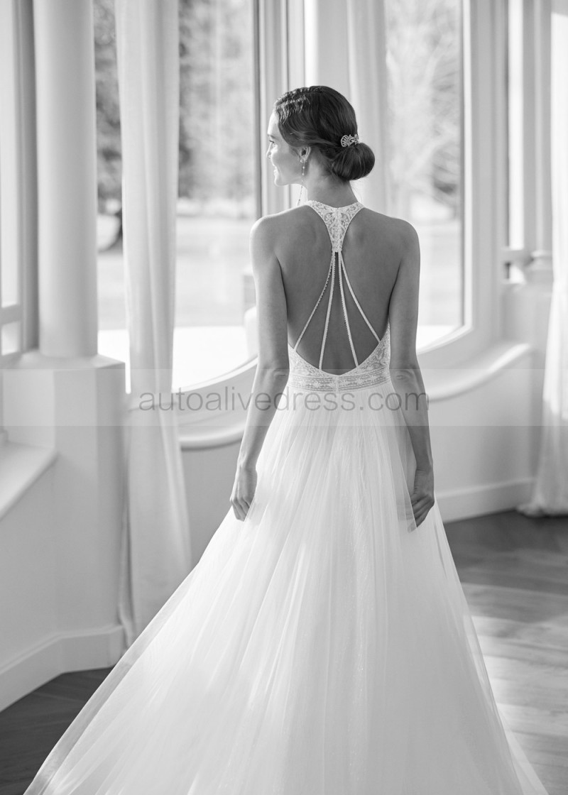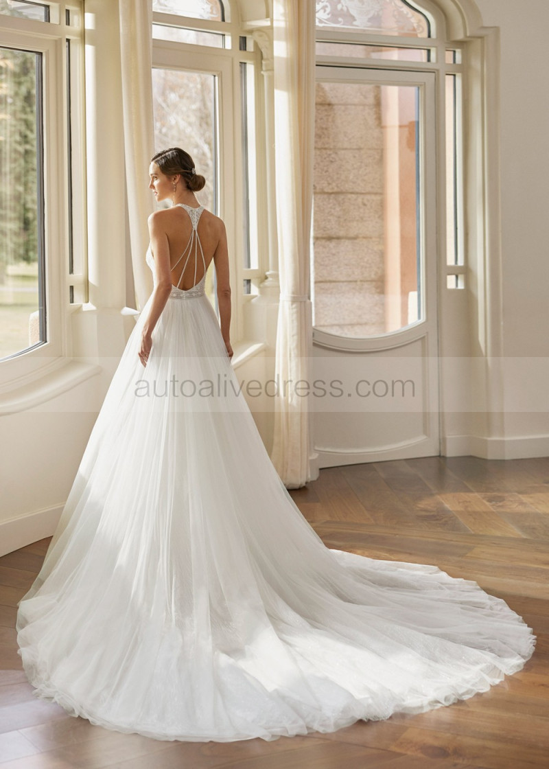 Beaded Halter Neck Ivory Lace Tulle Sparkly Wedding Dress