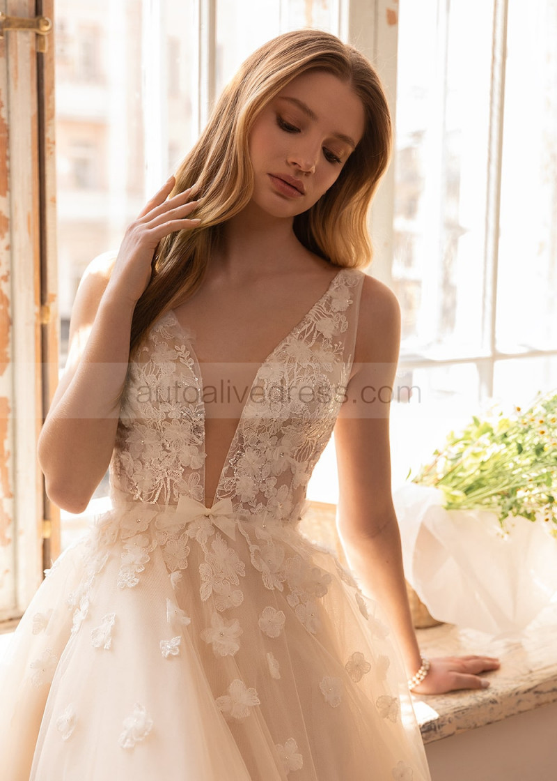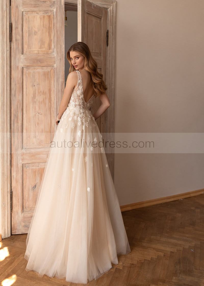 Beaded Ivory 3D Floral Lace Champagne Tulle Tender Wedding Dress