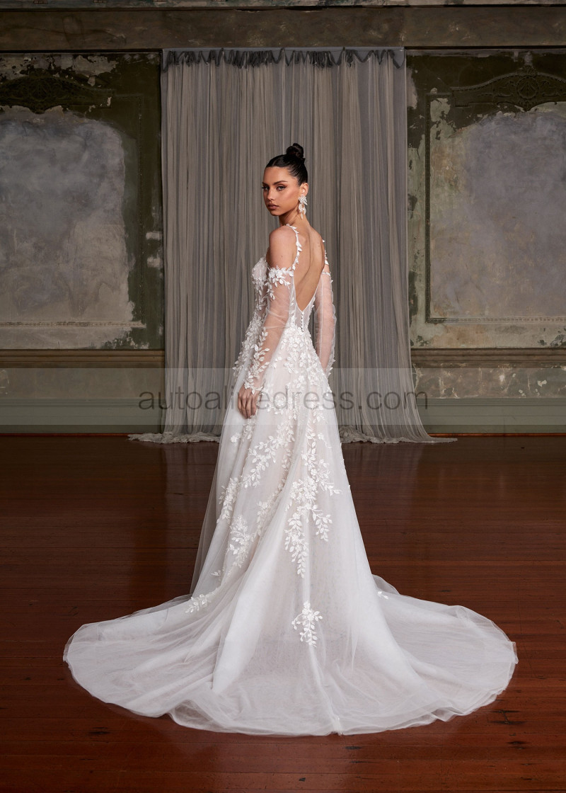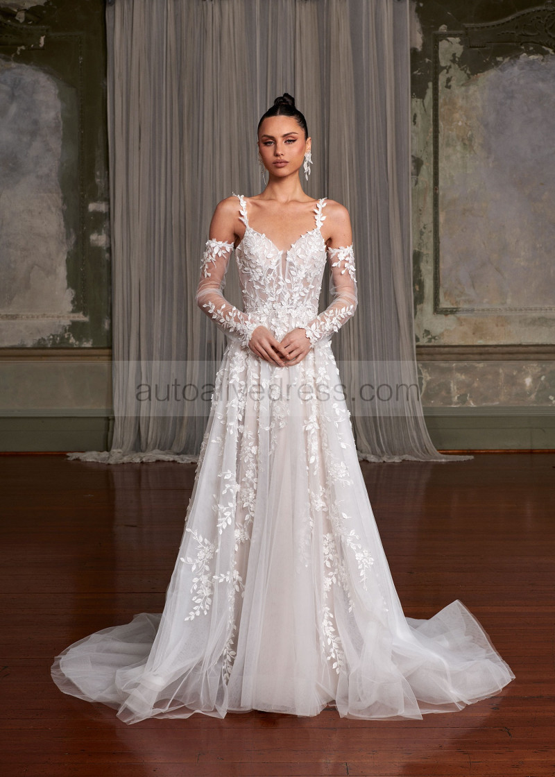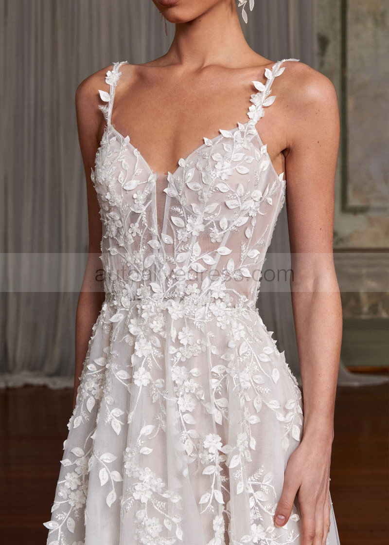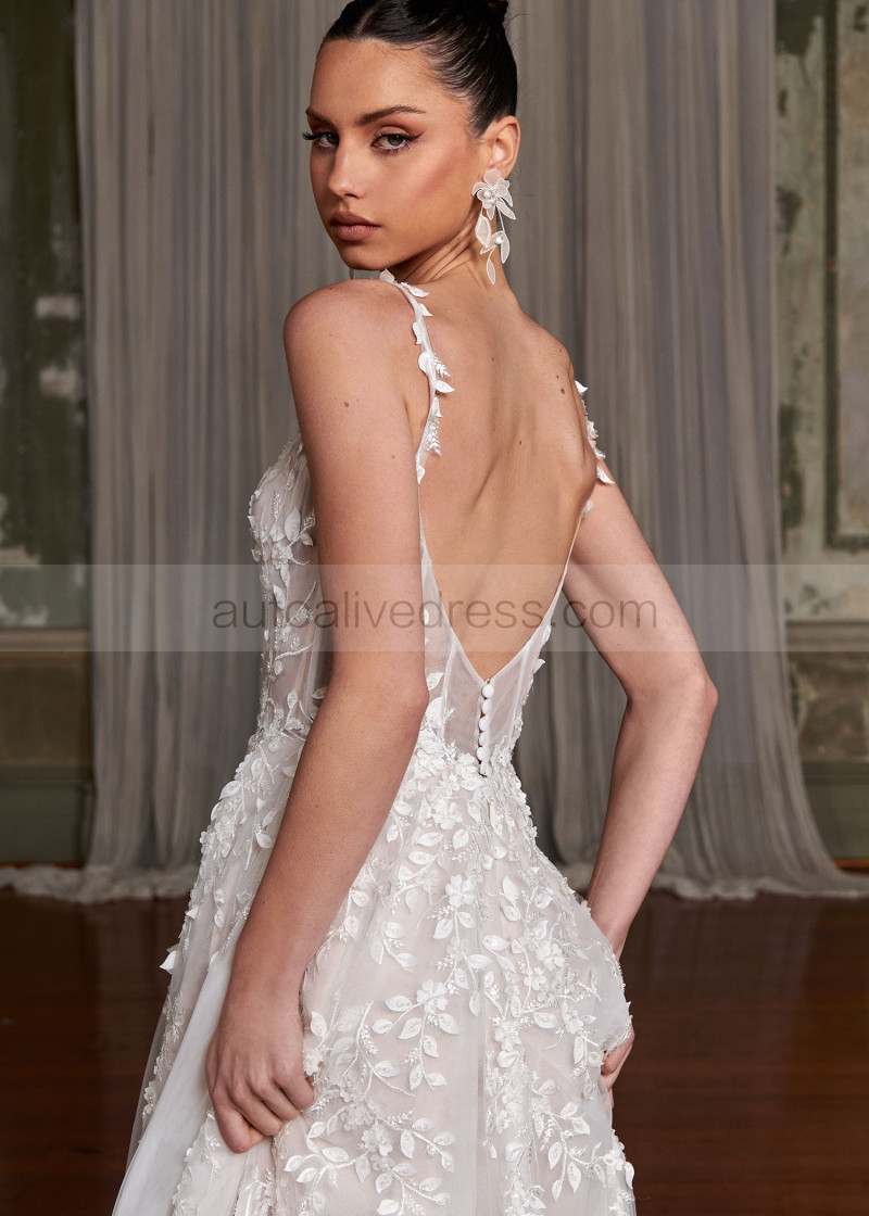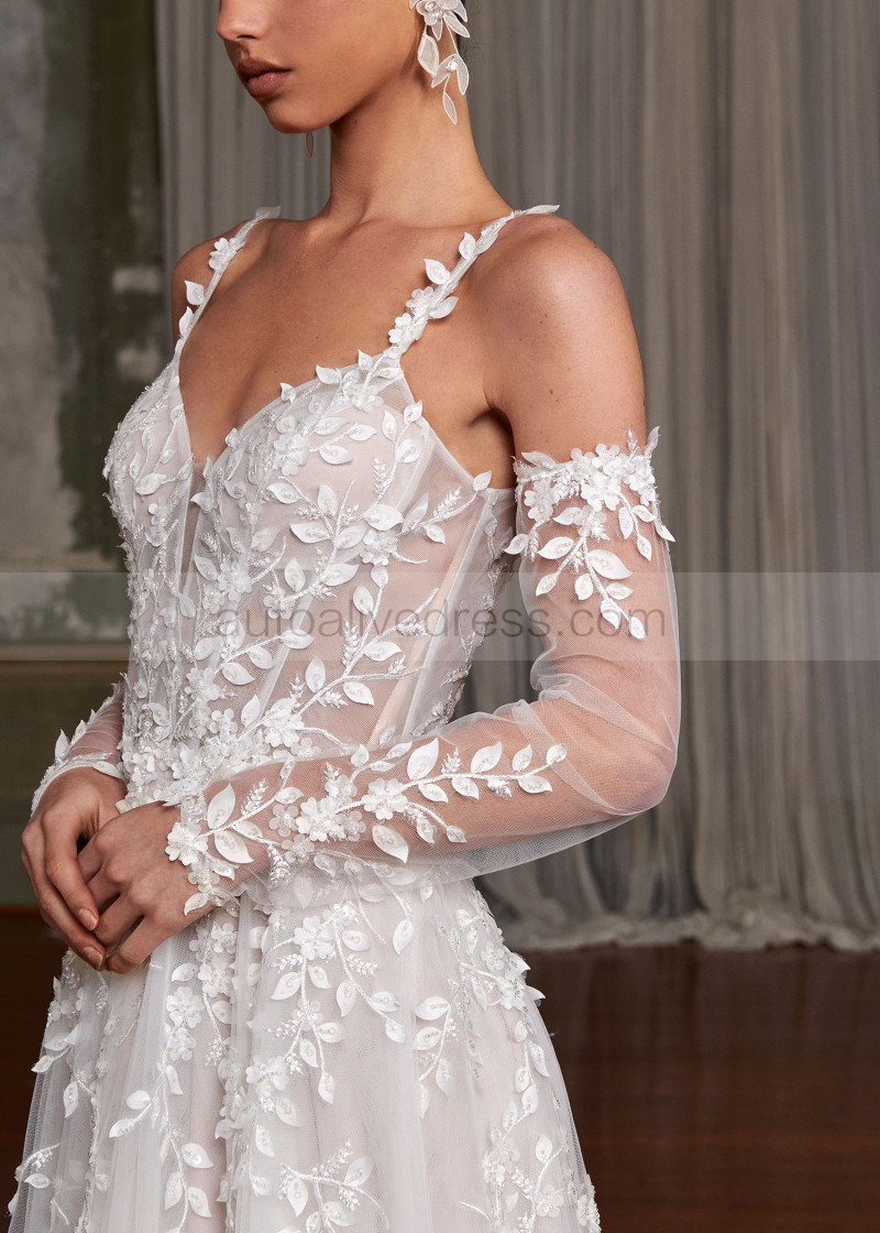 Beaded Ivory 3D Leaf Lace Tulle Romantic Wedding Dress