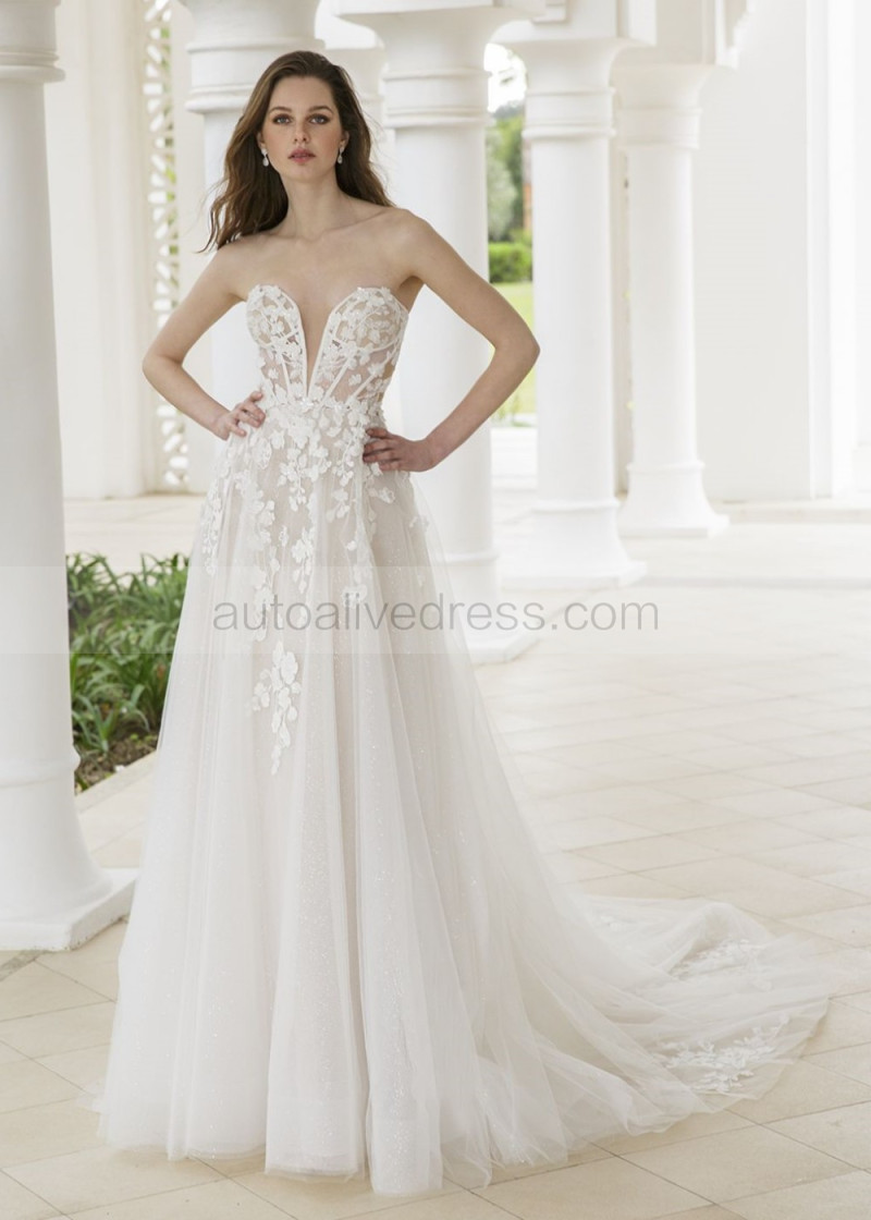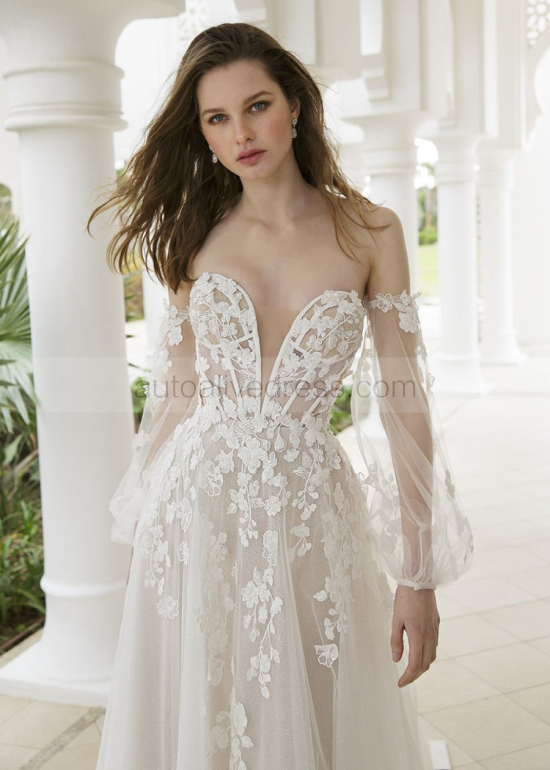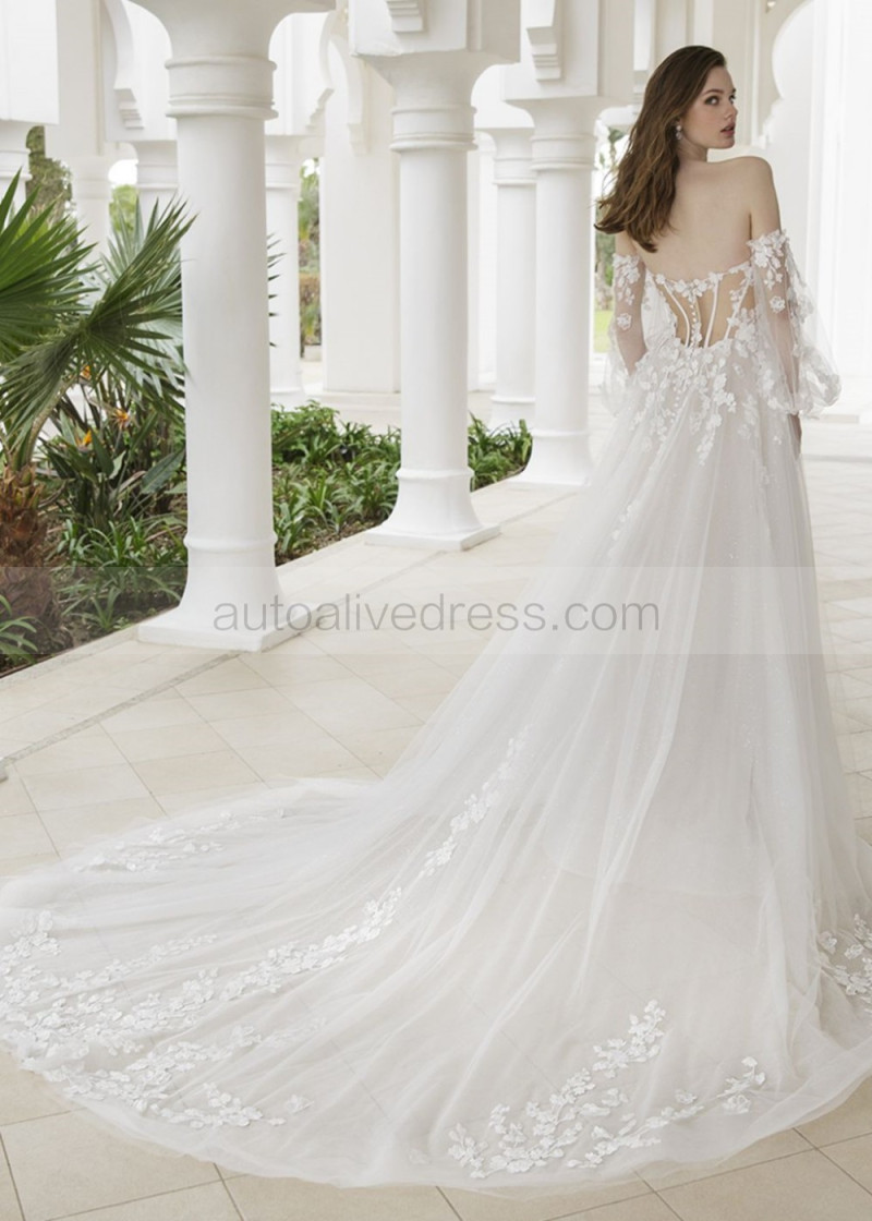 Beaded Ivory Floral Lace Tulle Wedding Dress With Detachable Sleeves