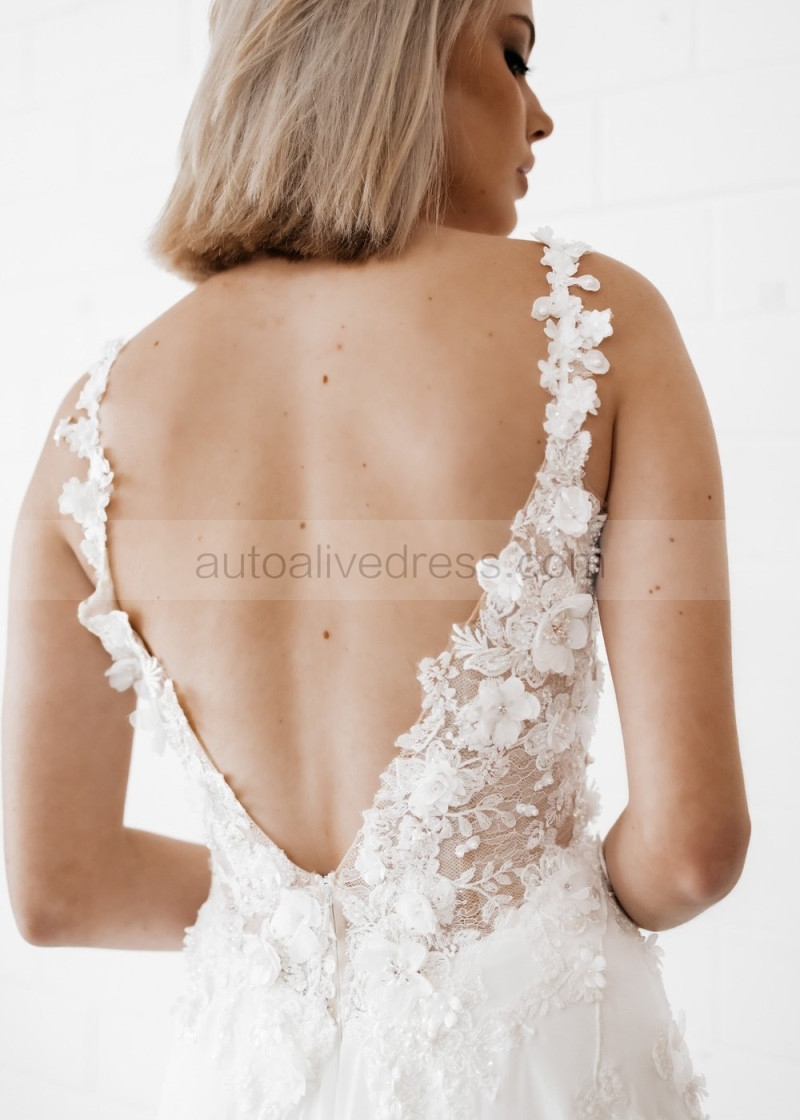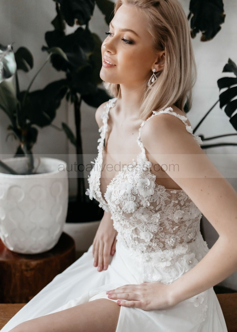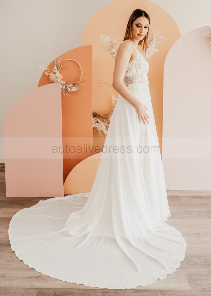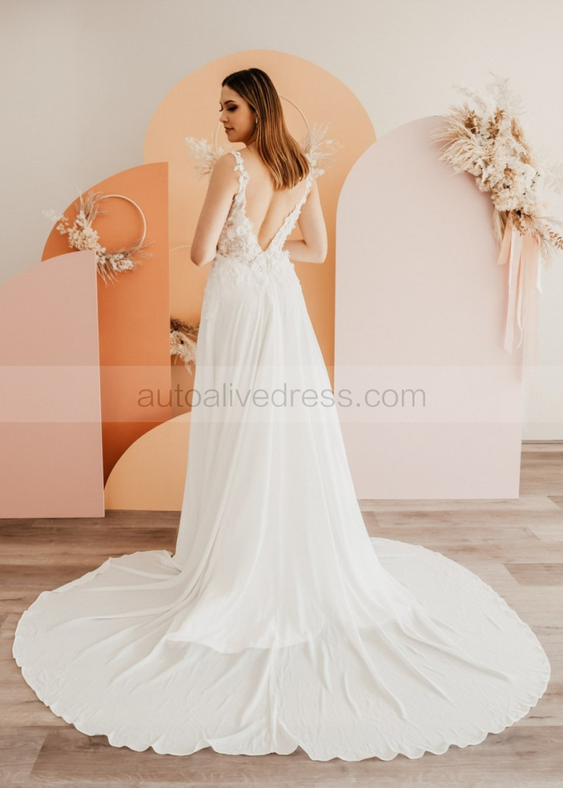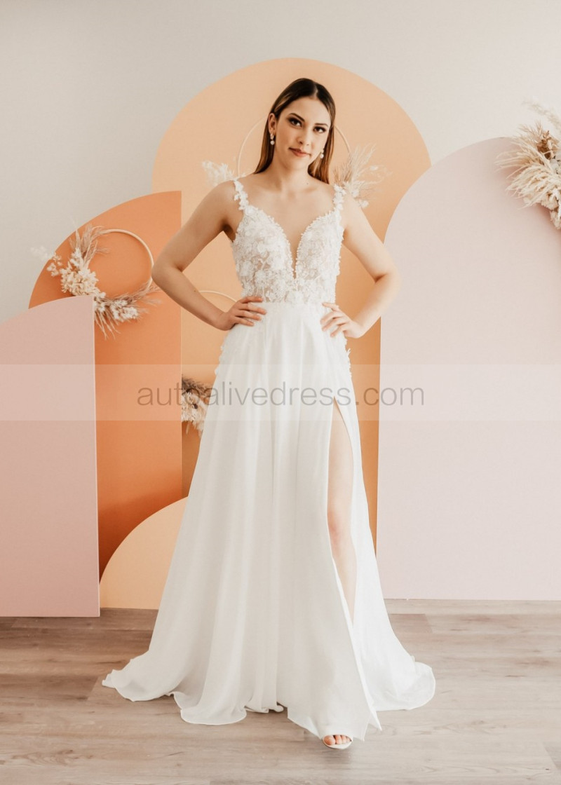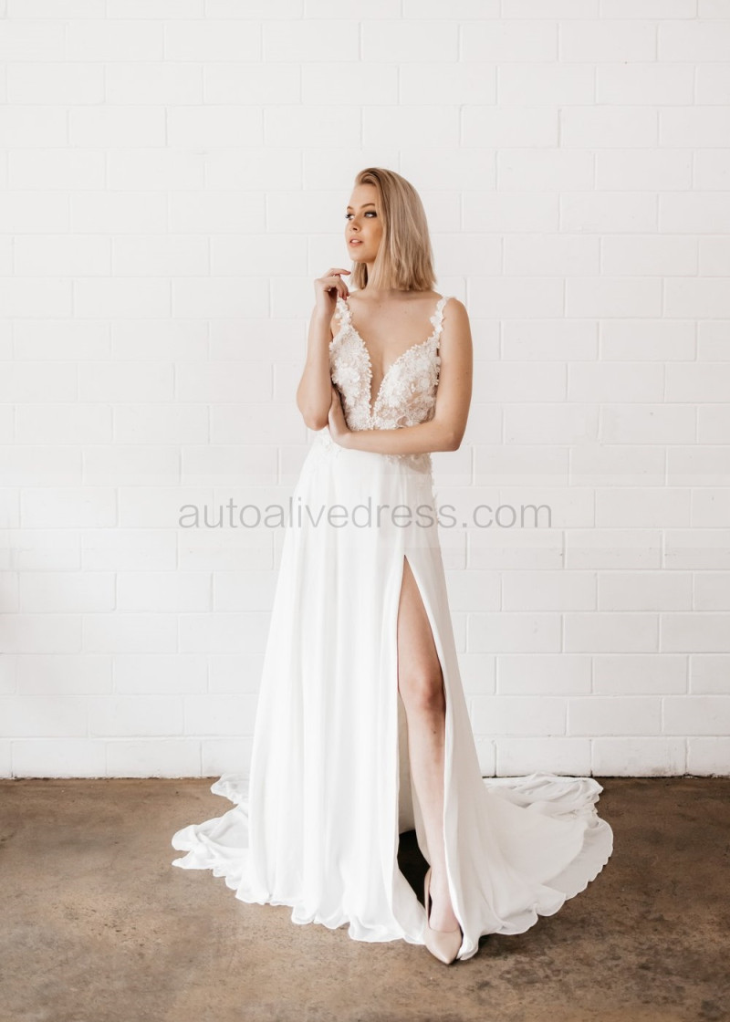 Beaded Ivory Lace Chiffon Slit Flowing Dreamy Wedding Dress