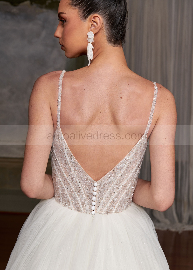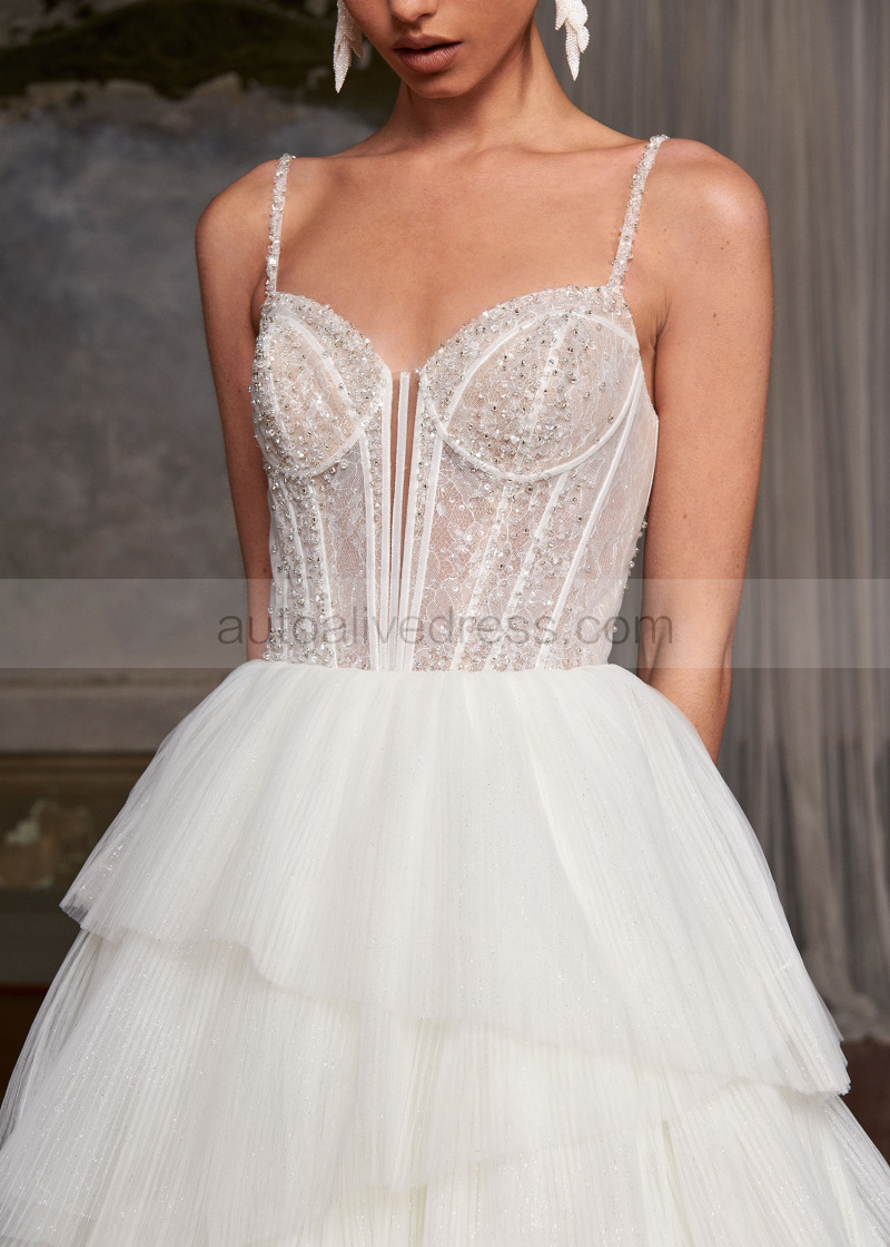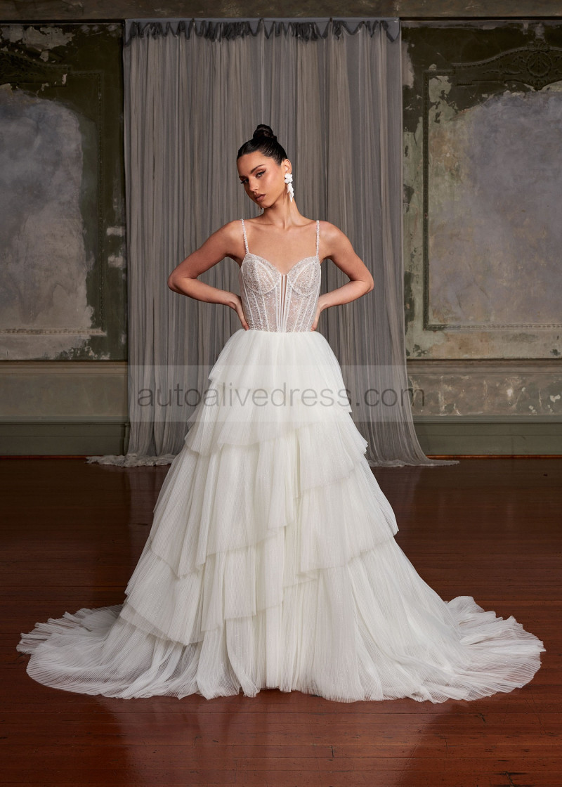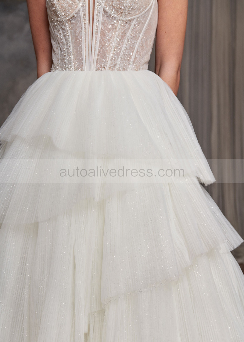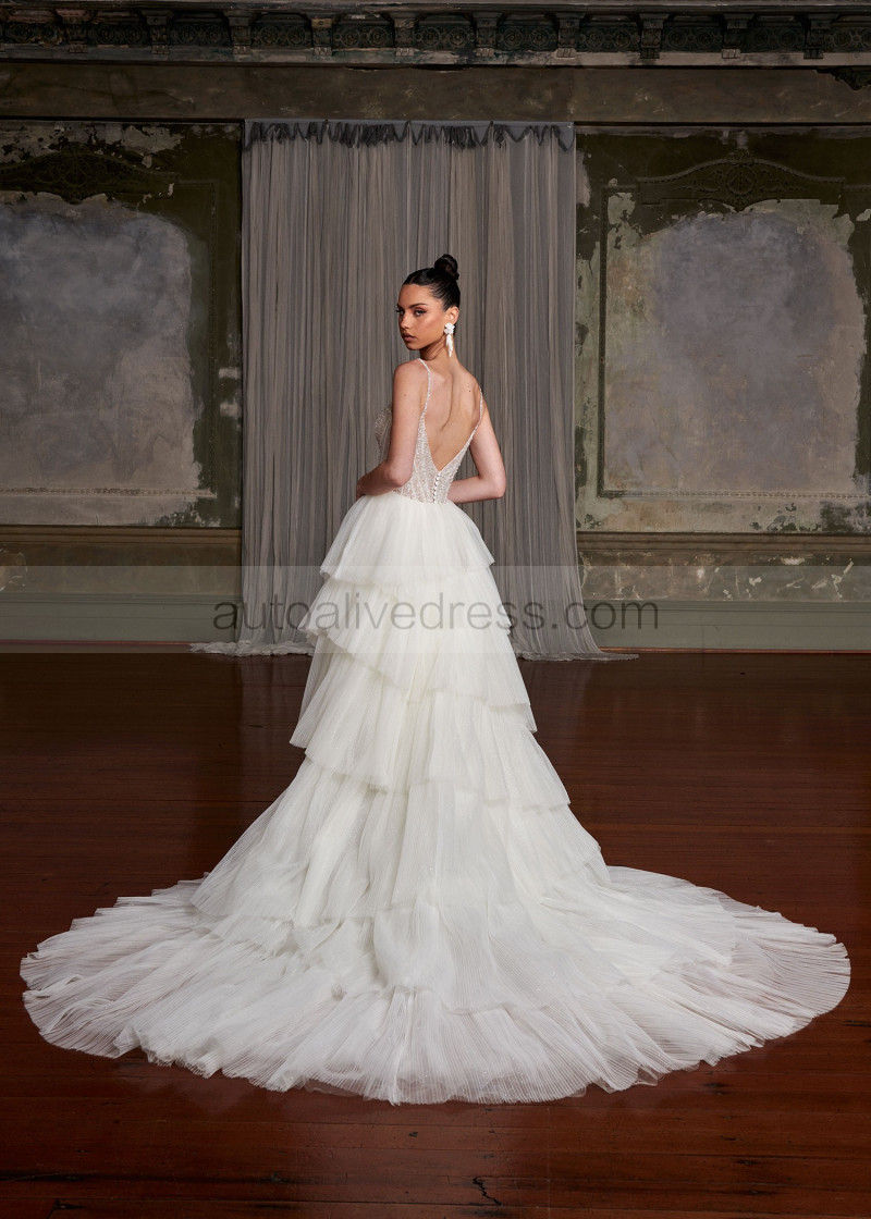 Beaded Ivory Lace Pleated Tulle Layered Chic Wedding Dress