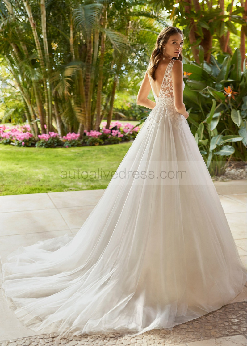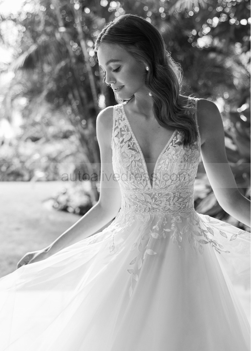 Beaded Ivory Lace Tulle Deep V Back Sexy Wedding Dress