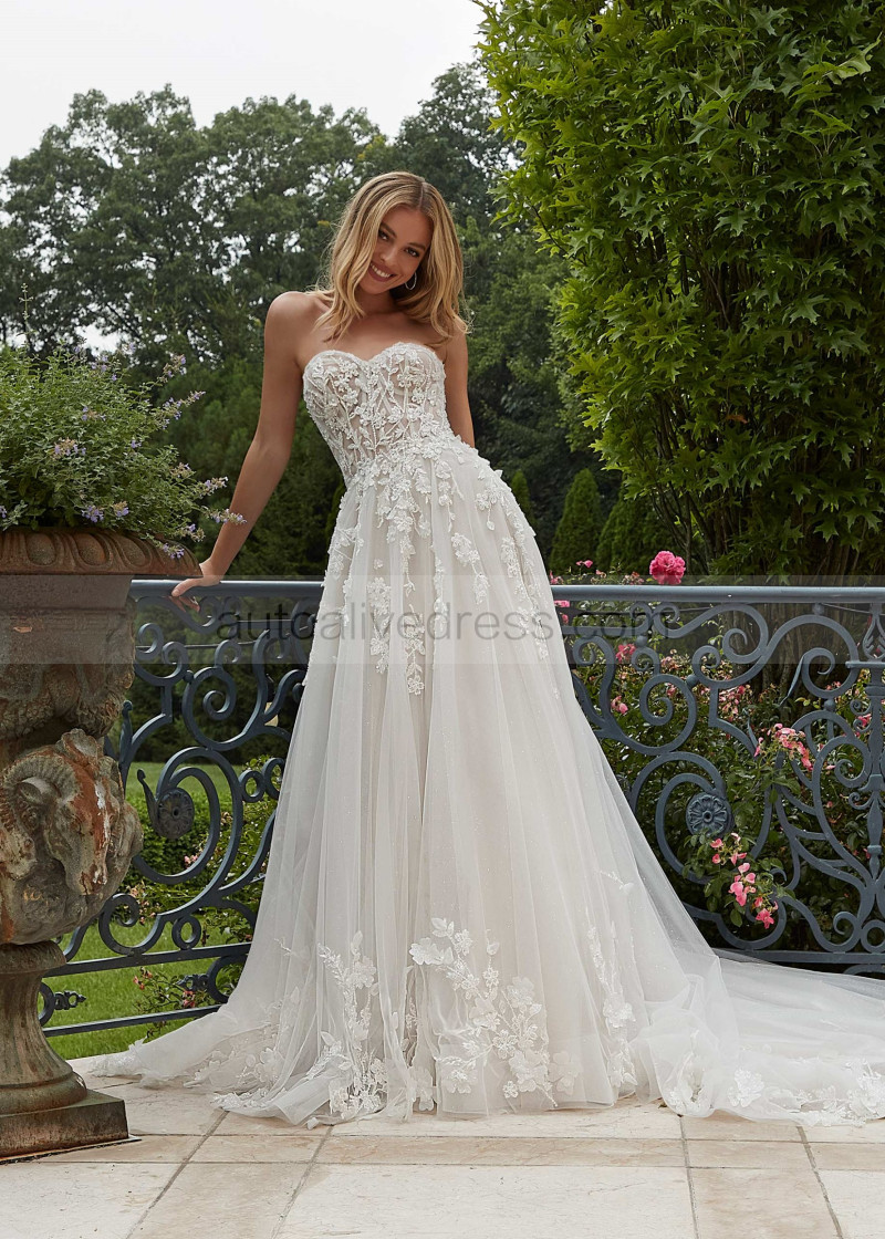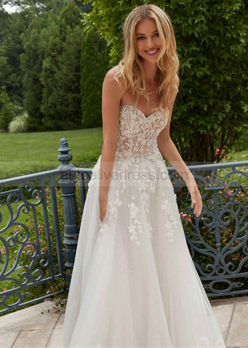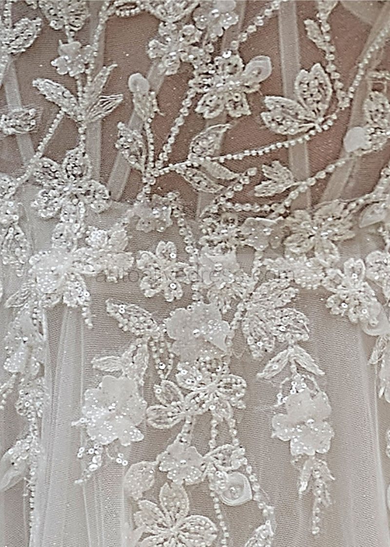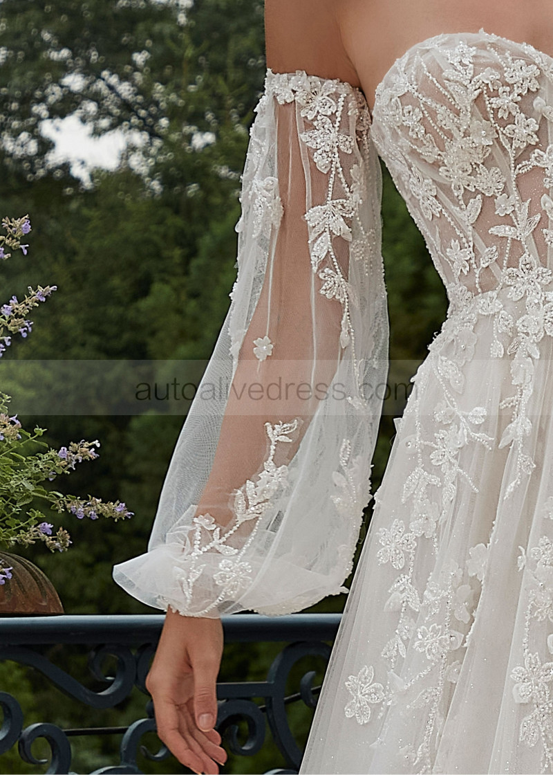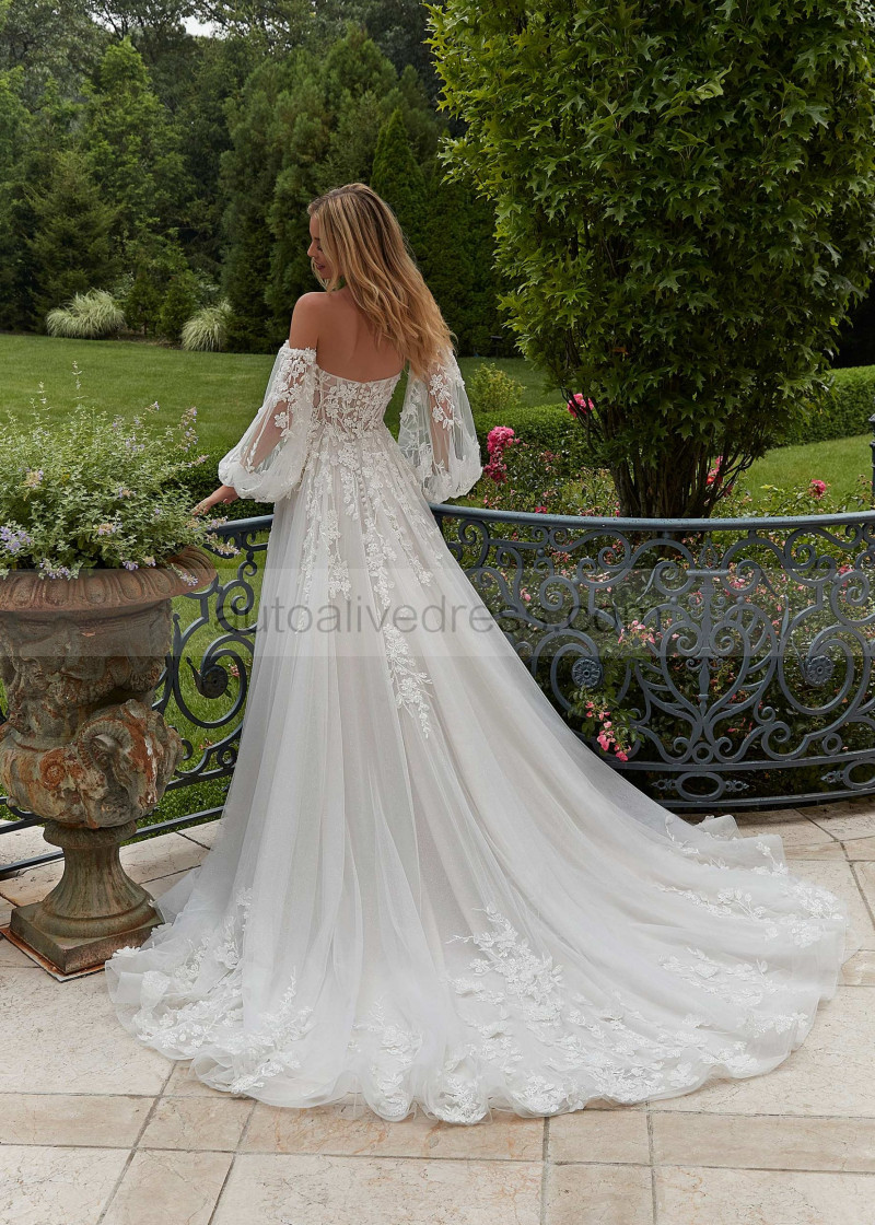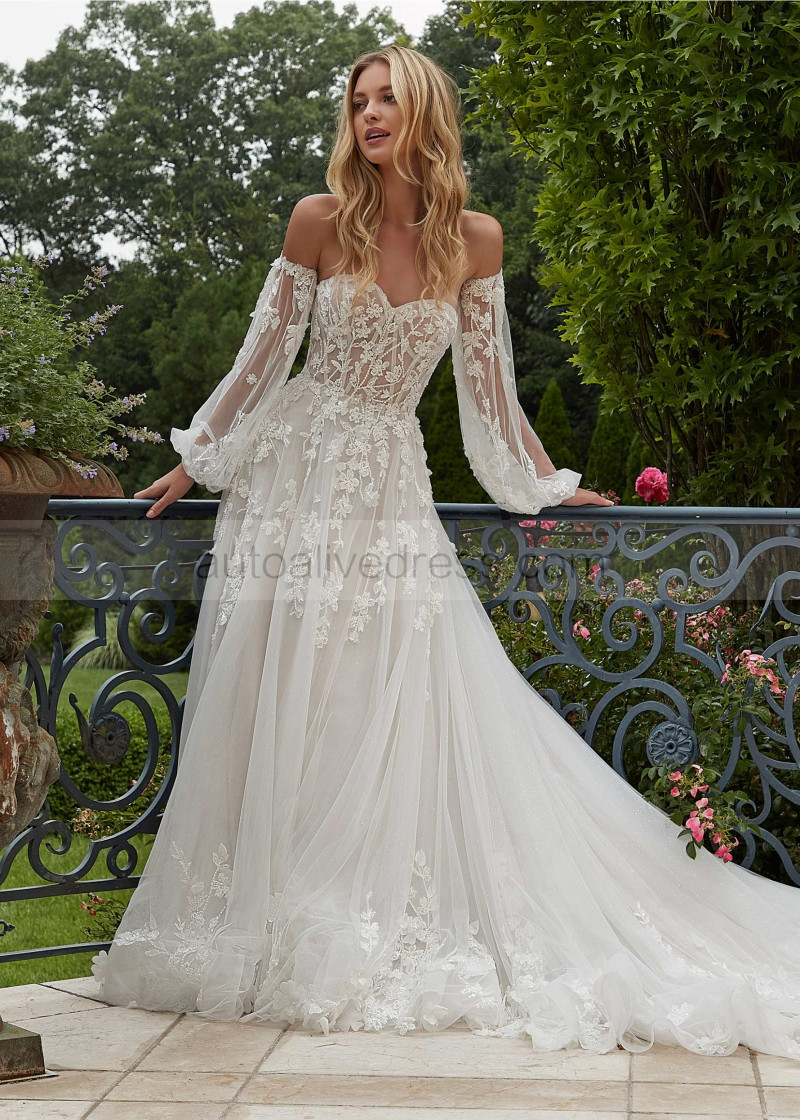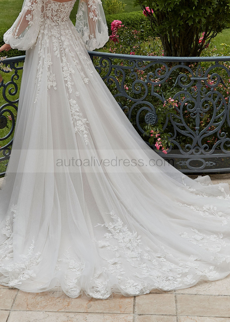 Beaded Ivory Lace Tulle Fairytale Wedding Dress With Detachable Sleeves