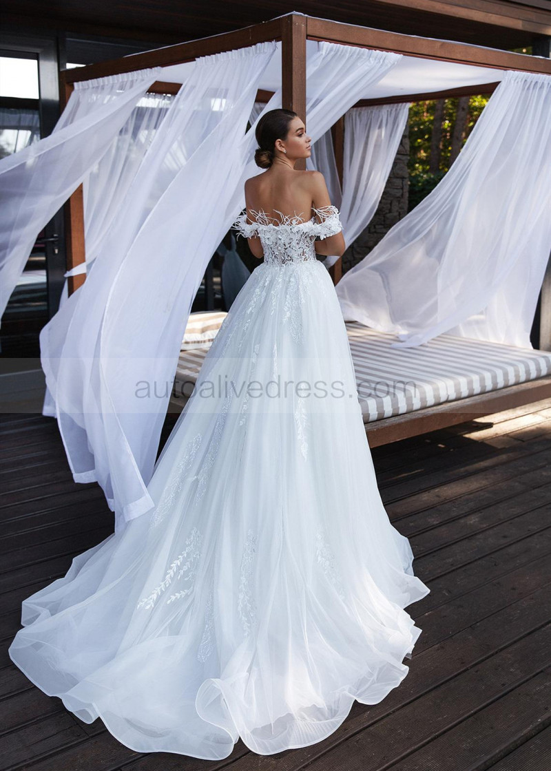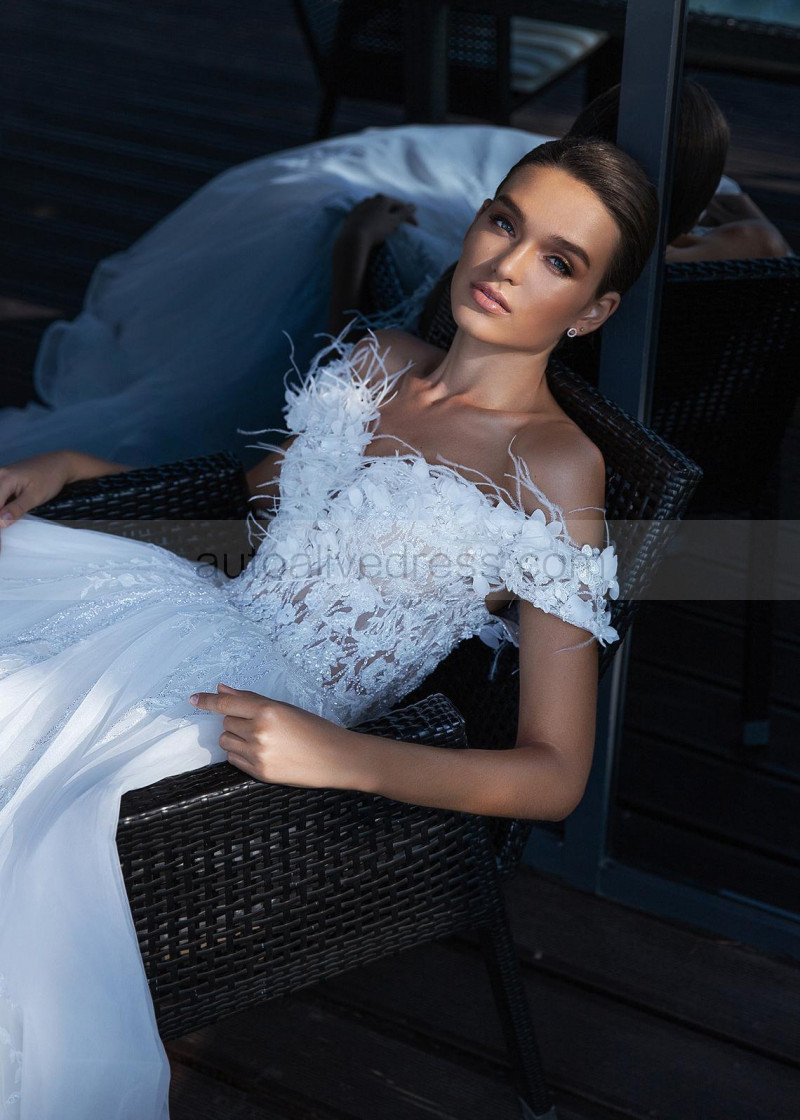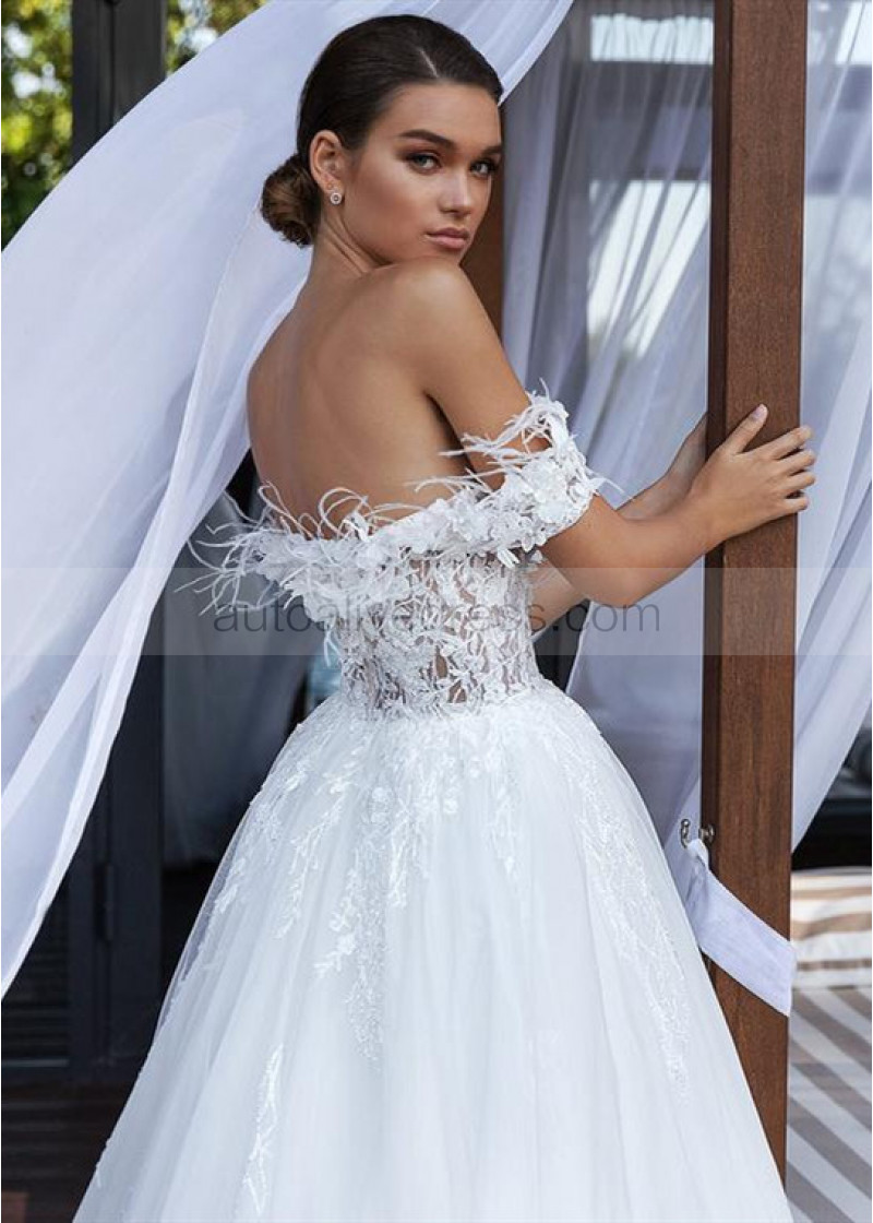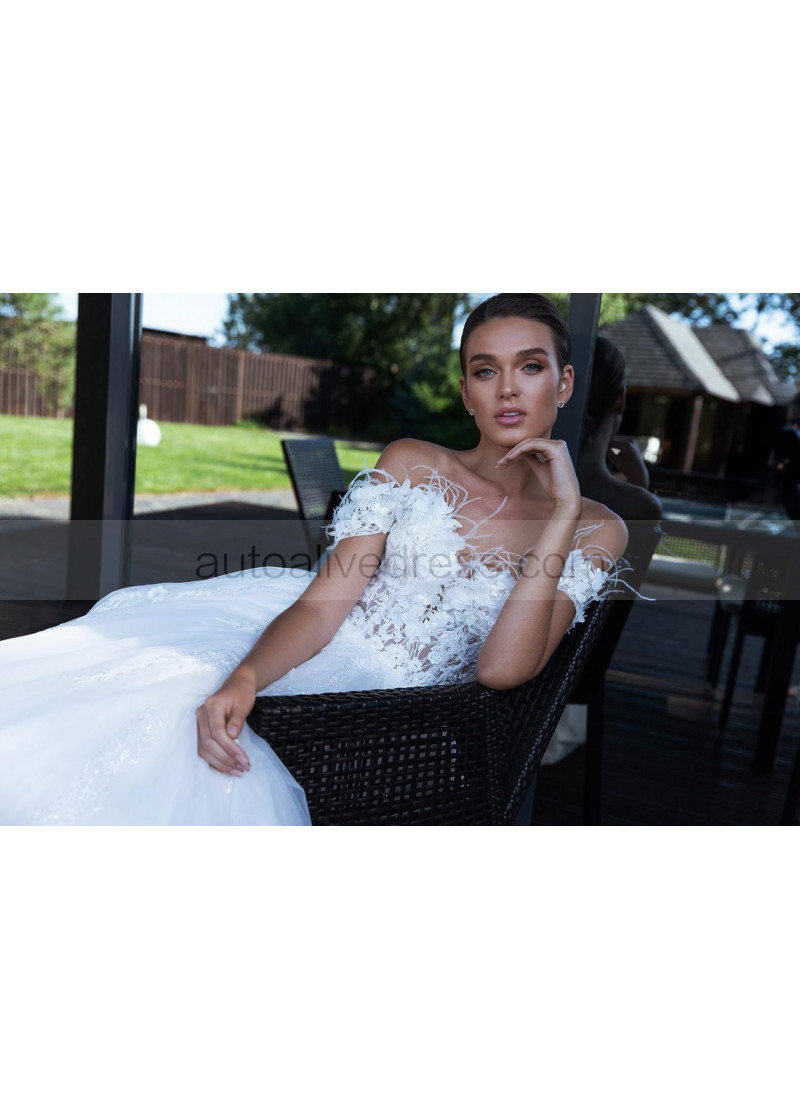 Beaded Ivory Lace Tulle Feather Wedding Dress