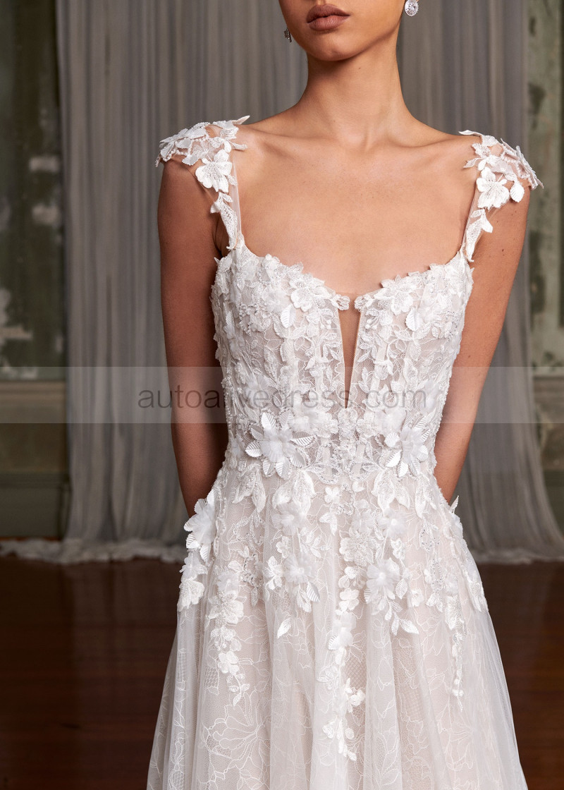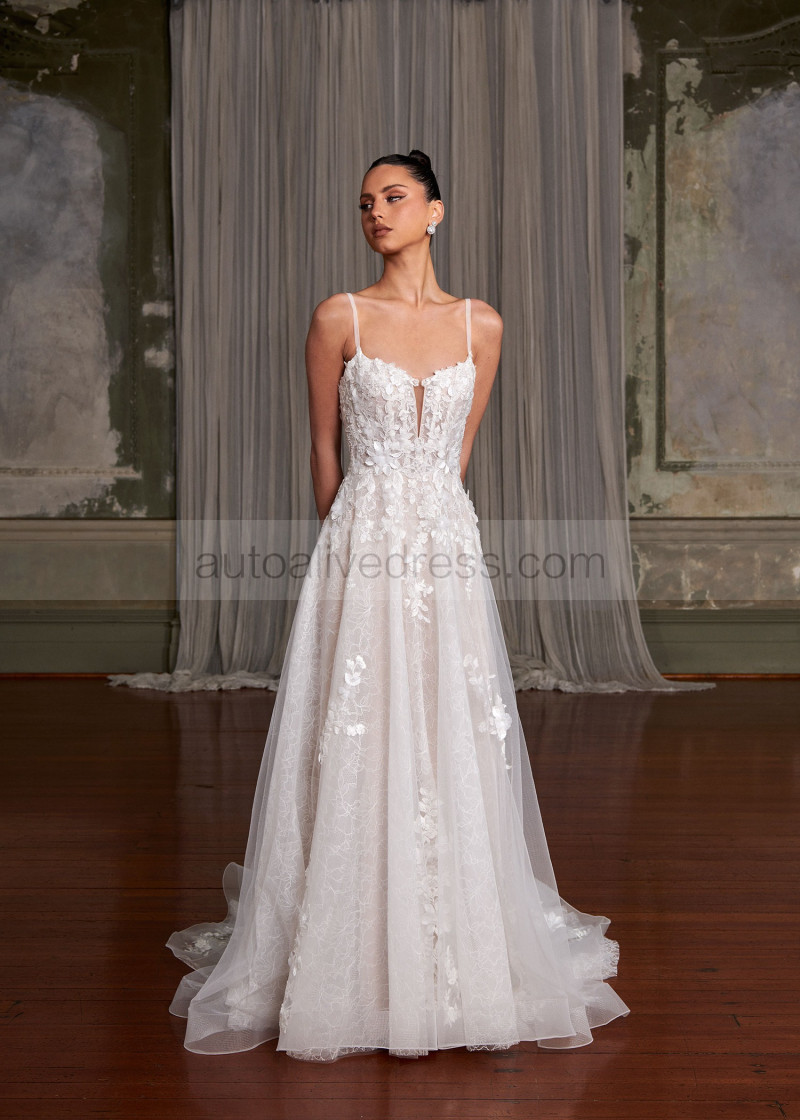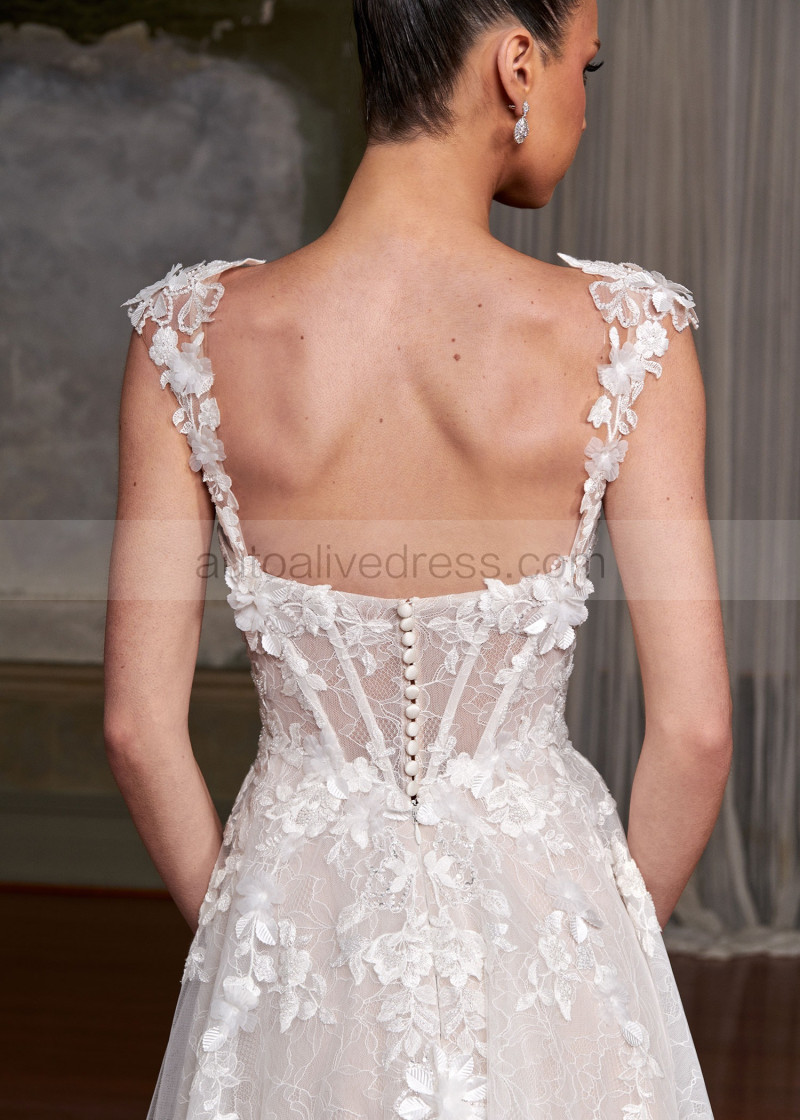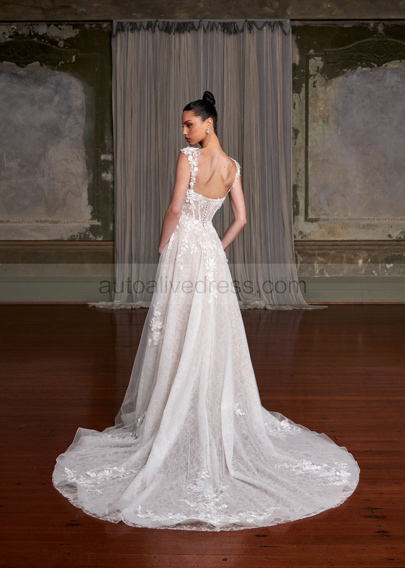 Beaded Ivory Lace Tulle Floral Wedding Dress With Detachable Cap Sleeves