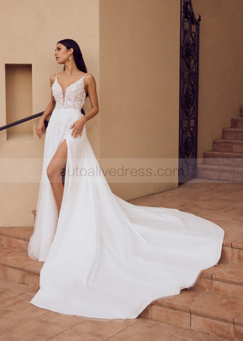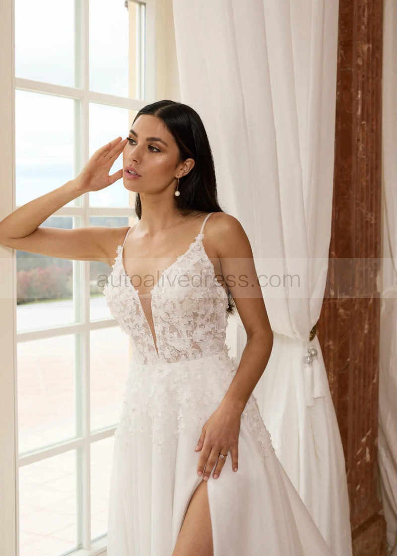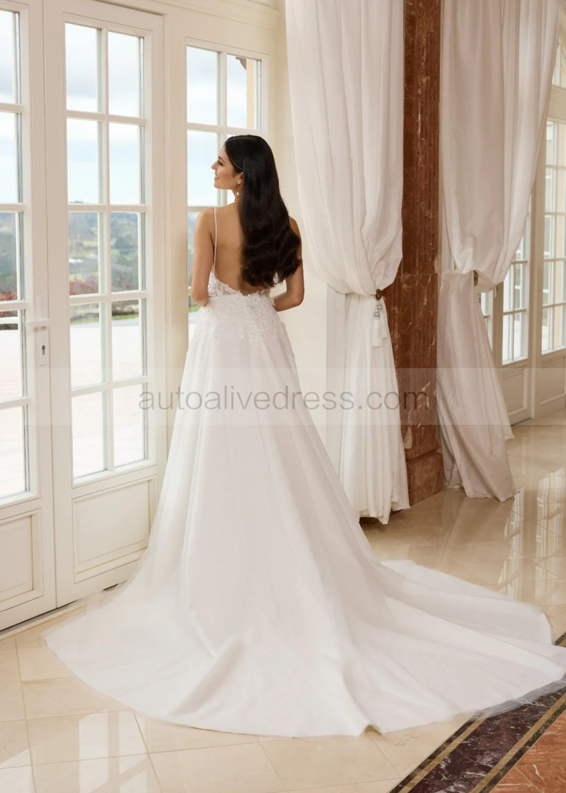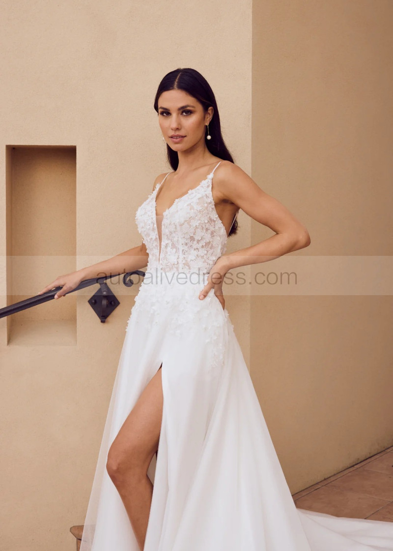 Beaded Ivory Lace Tulle Low Open Back Slit Wedding Dress