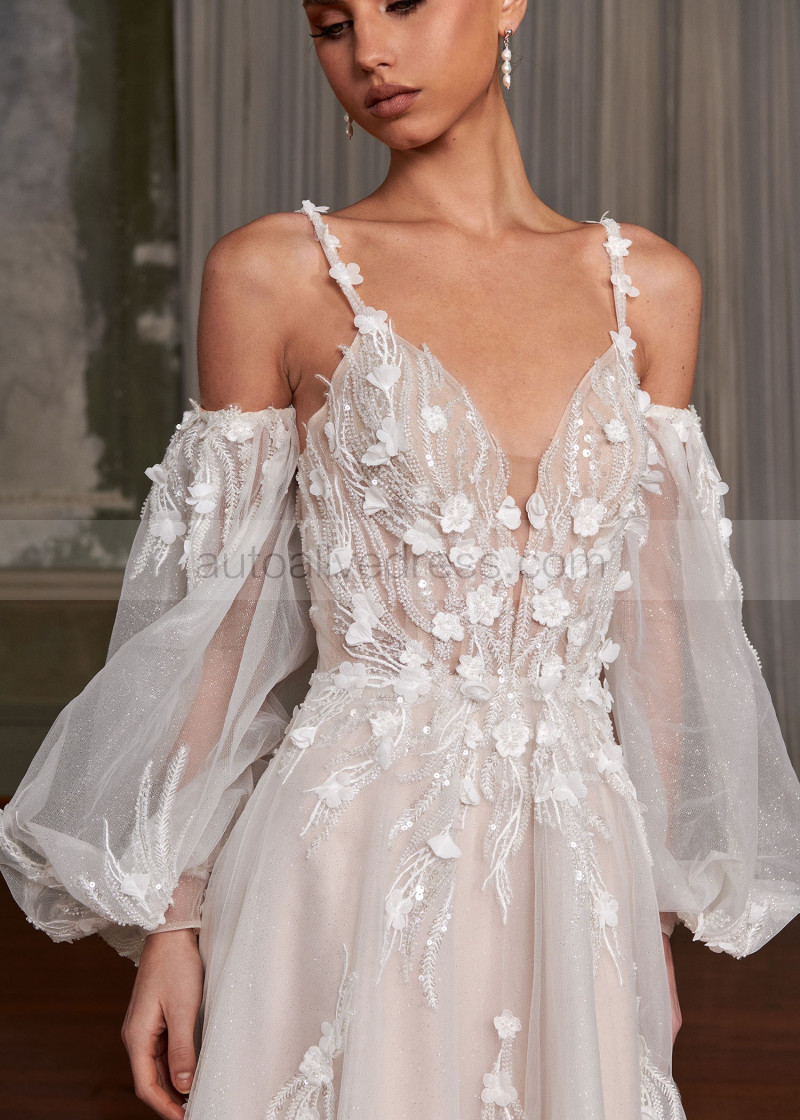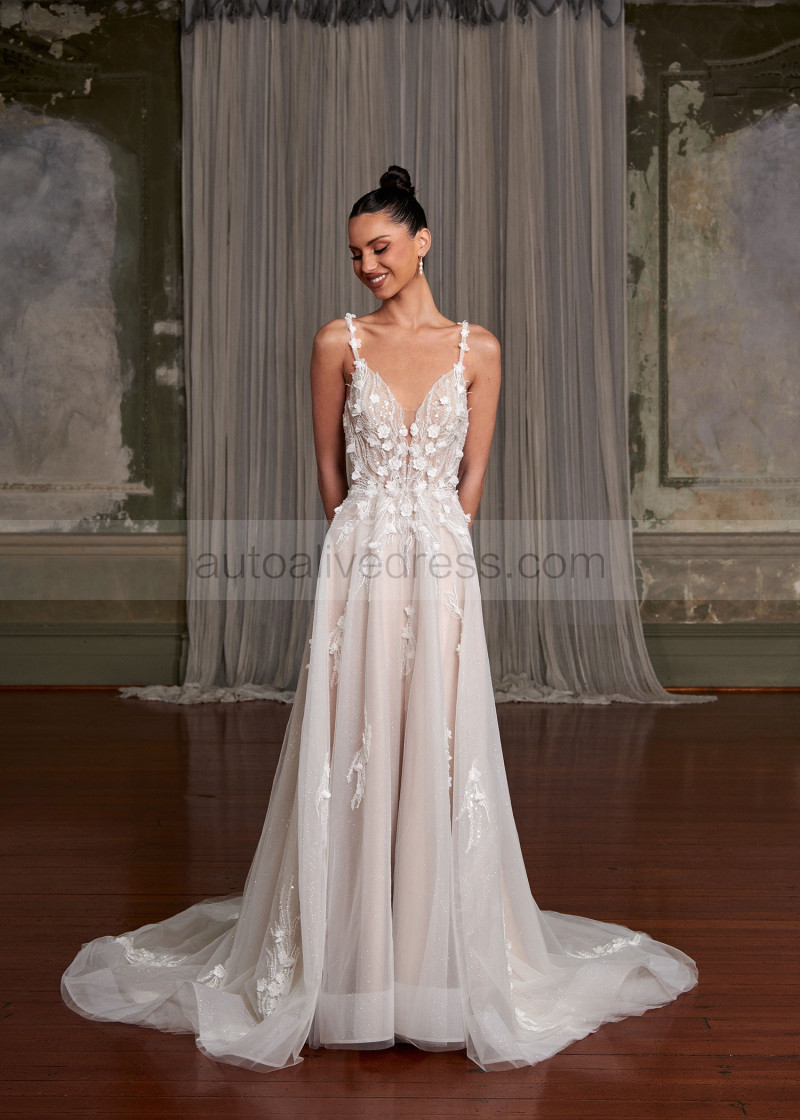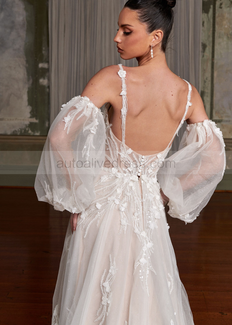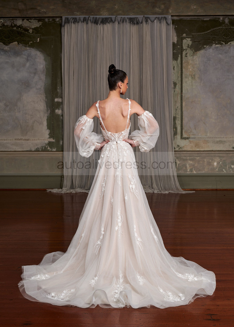 Beaded Ivory Lace Tulle Mocha Lining Sparkling Wedding Dress