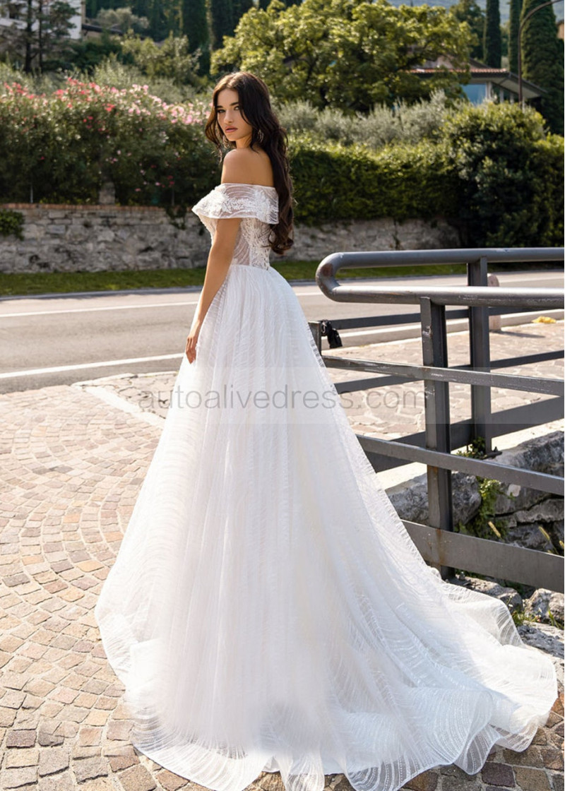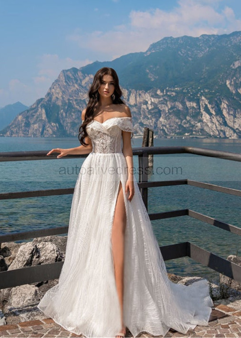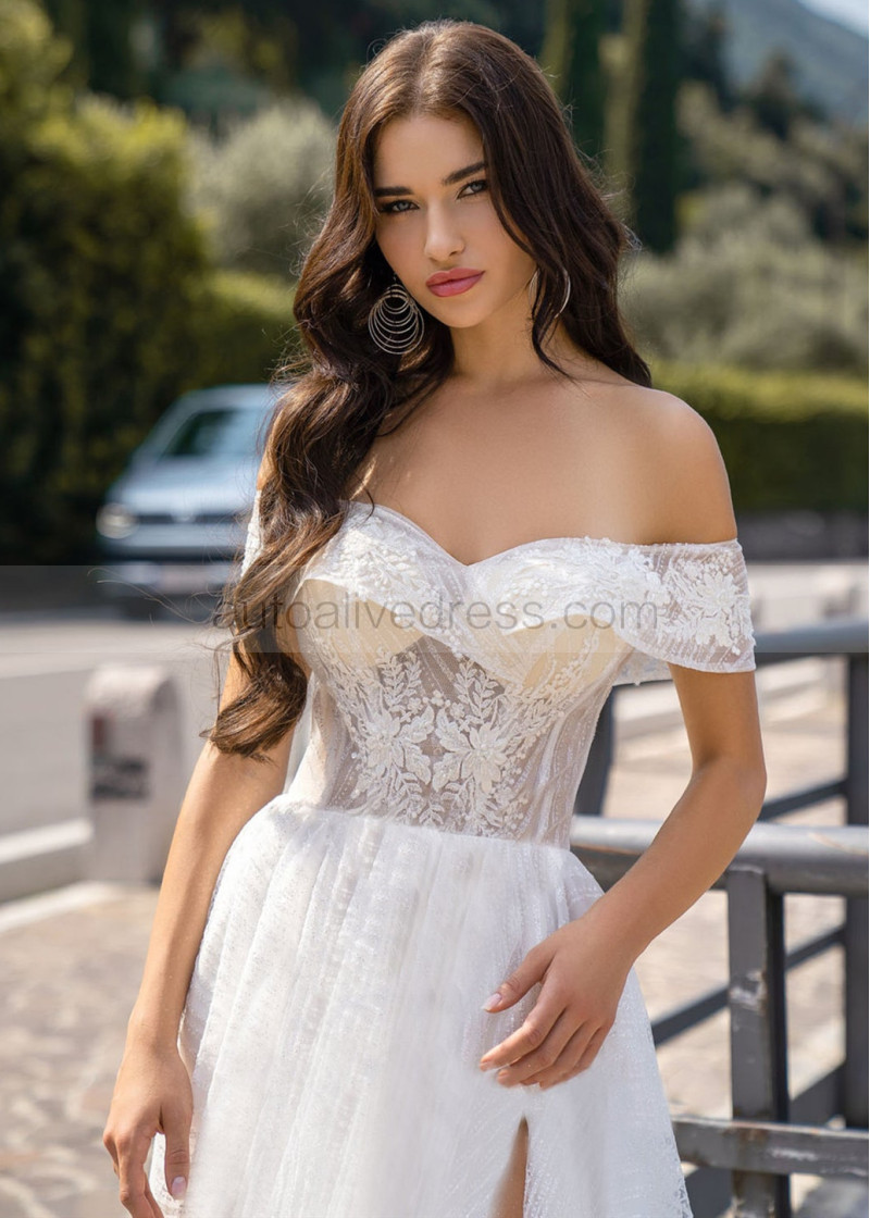 Beaded Ivory Lace Tulle Off Shoulder Slit Wedding Dress