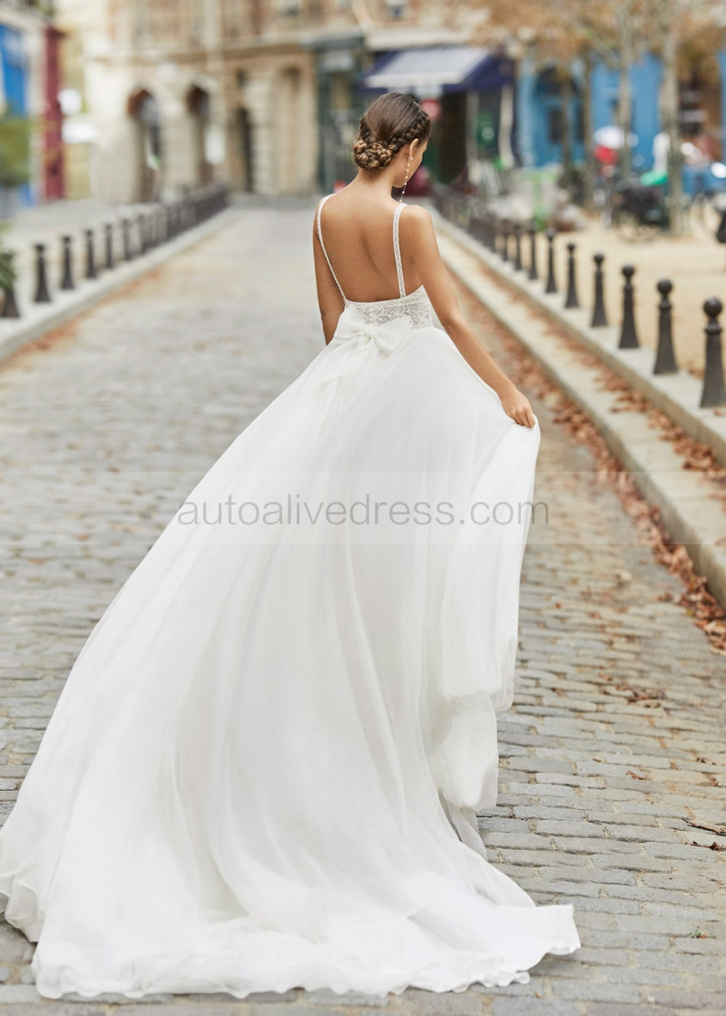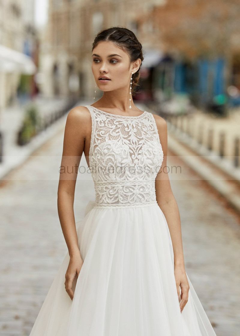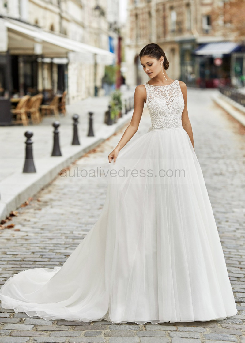 Beaded Ivory Lace Tulle Open Back Elegant Wedding Dress