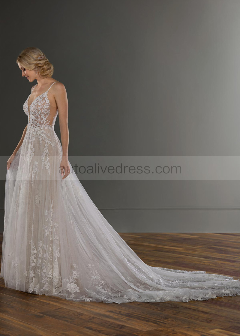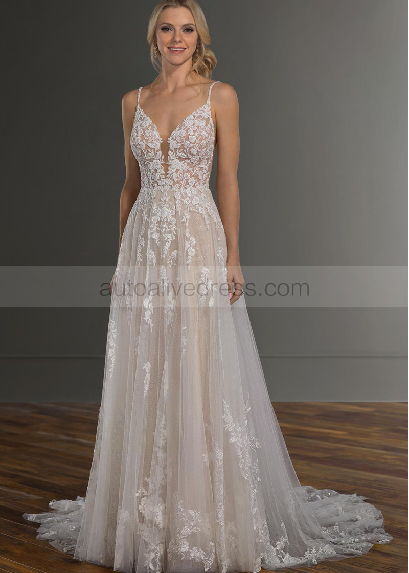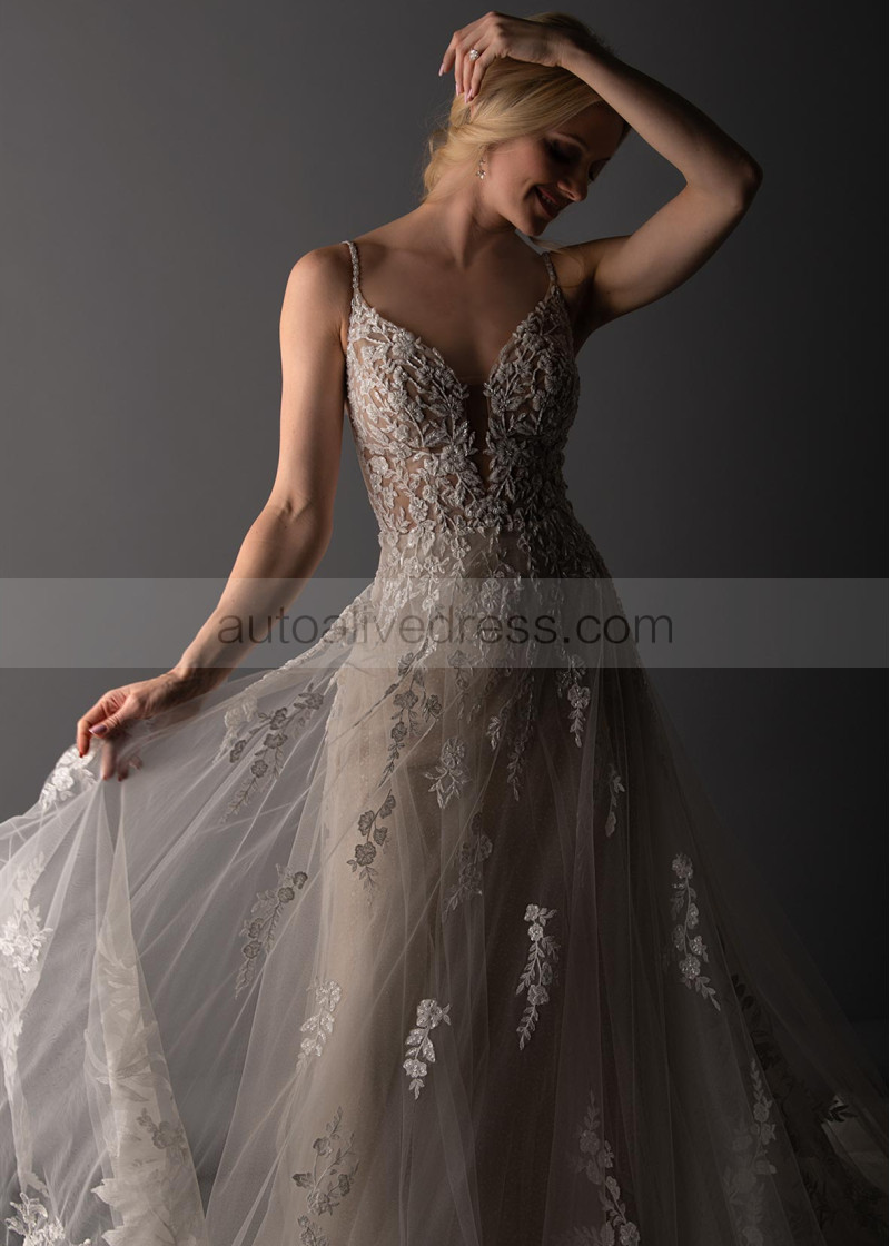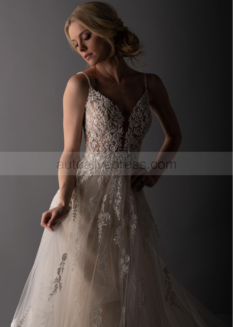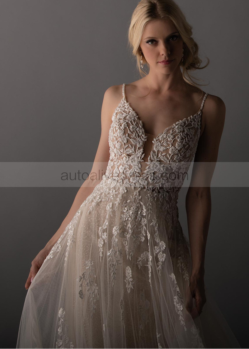 Beaded Ivory Lace Tulle Open Cross Back Wedding Dress