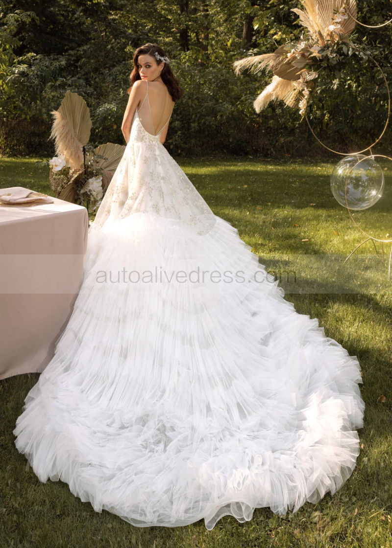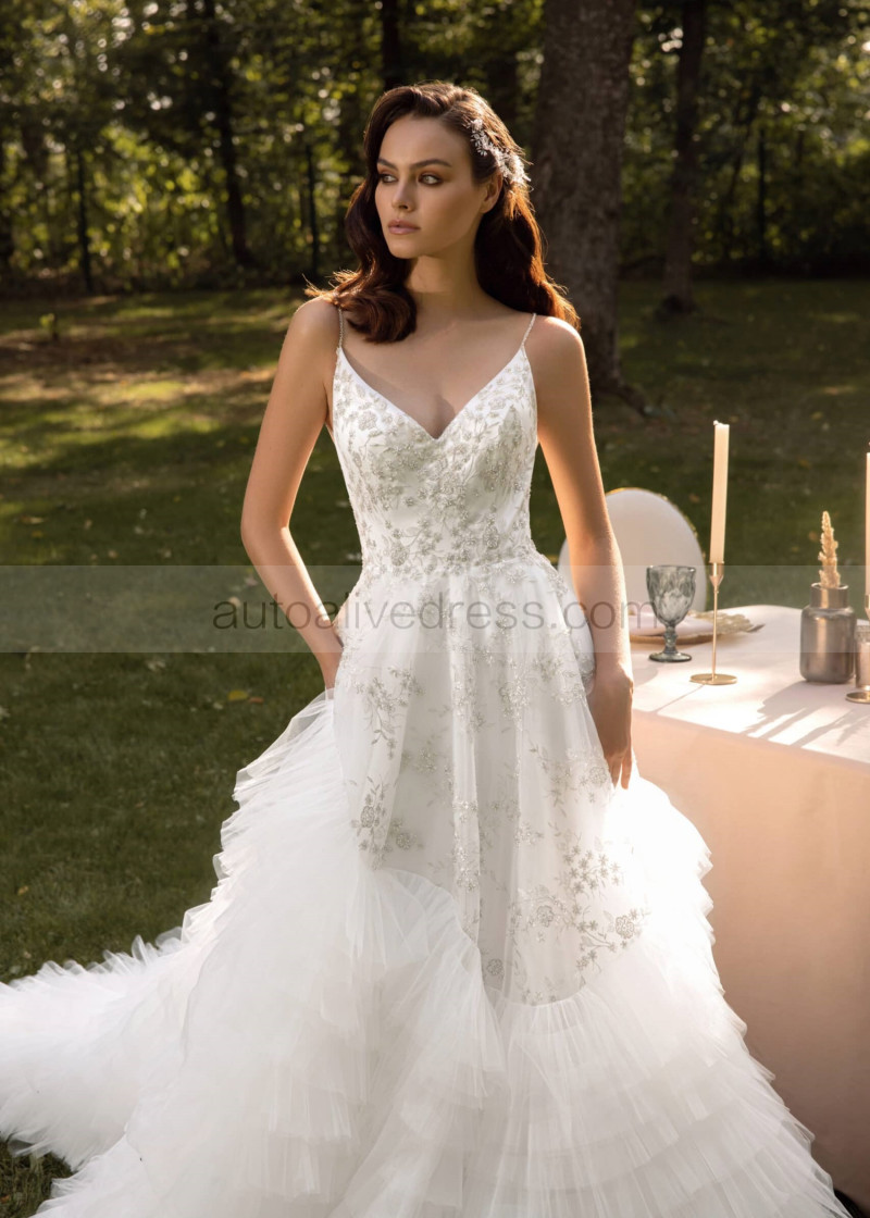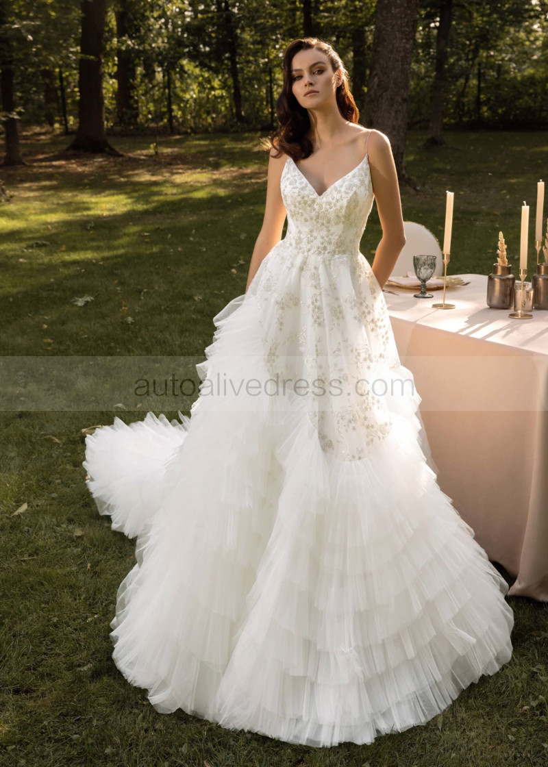 Beaded Ivory Lace Tulle Ruffled Luxurious Wedding Dress
