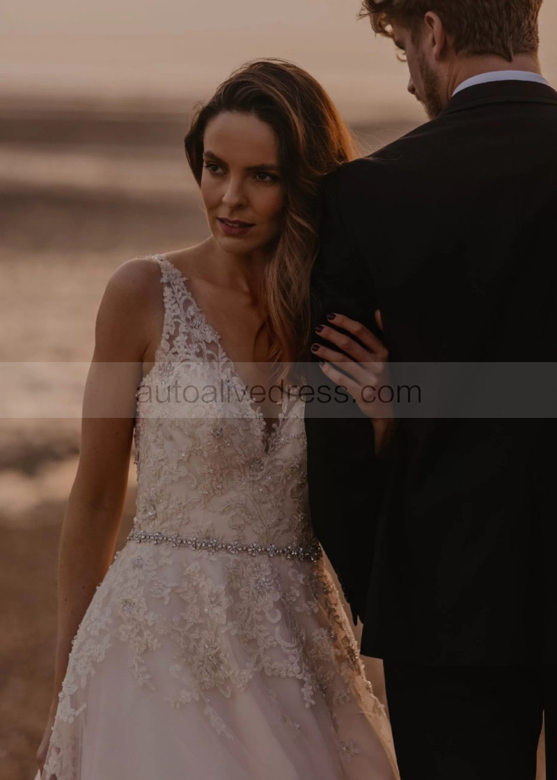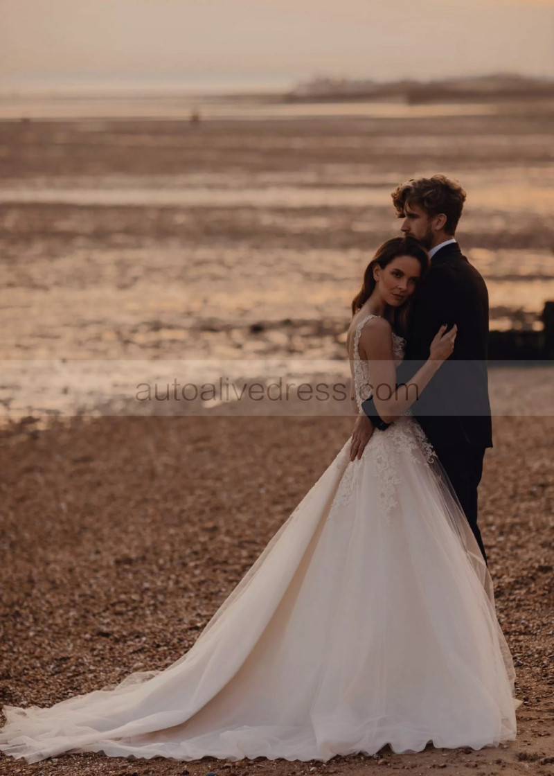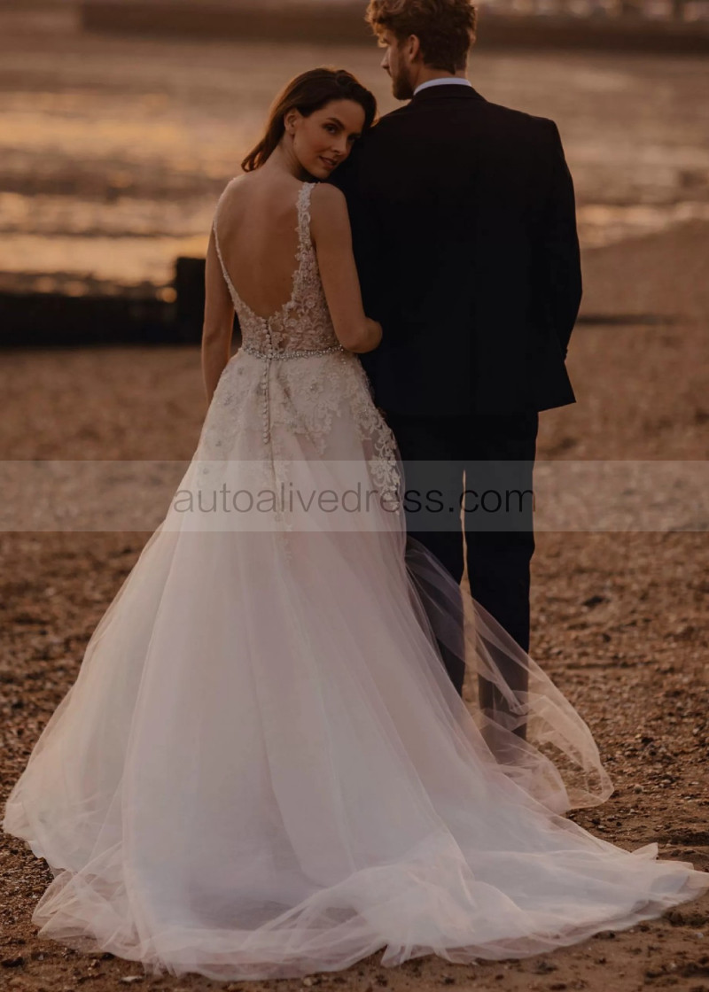 Beaded Ivory Lace Tulle V Back Sparkly Wedding Dress