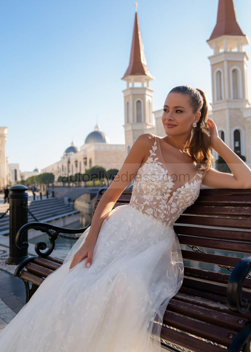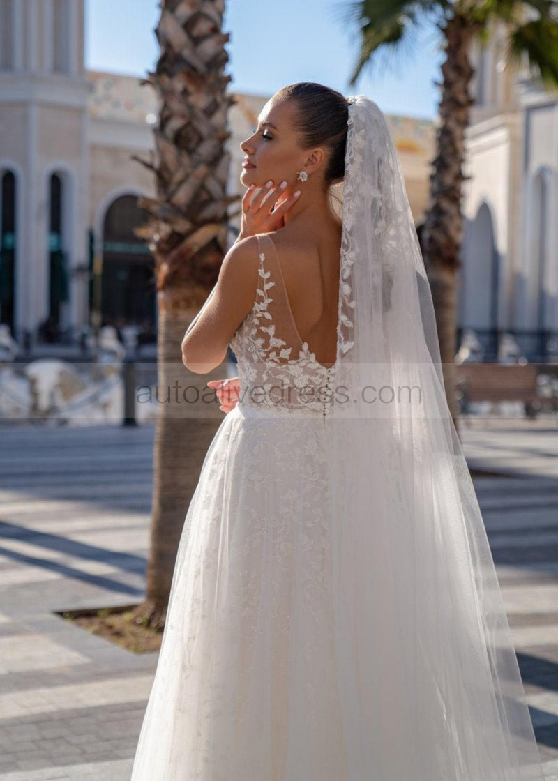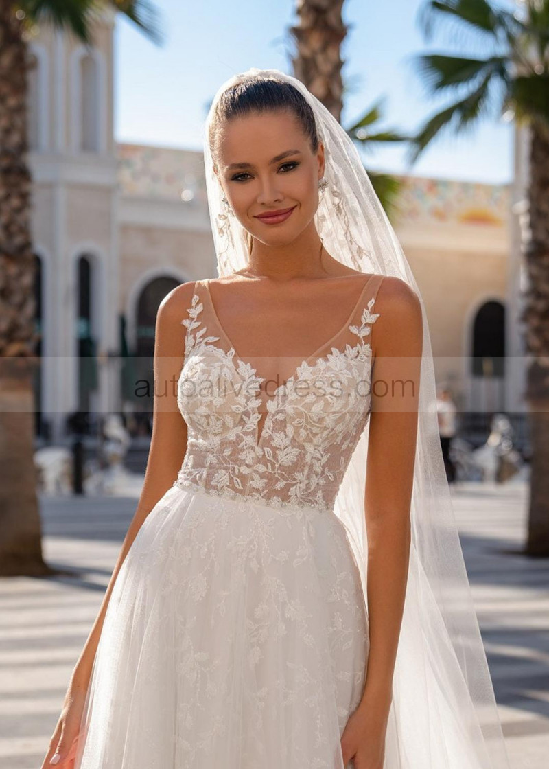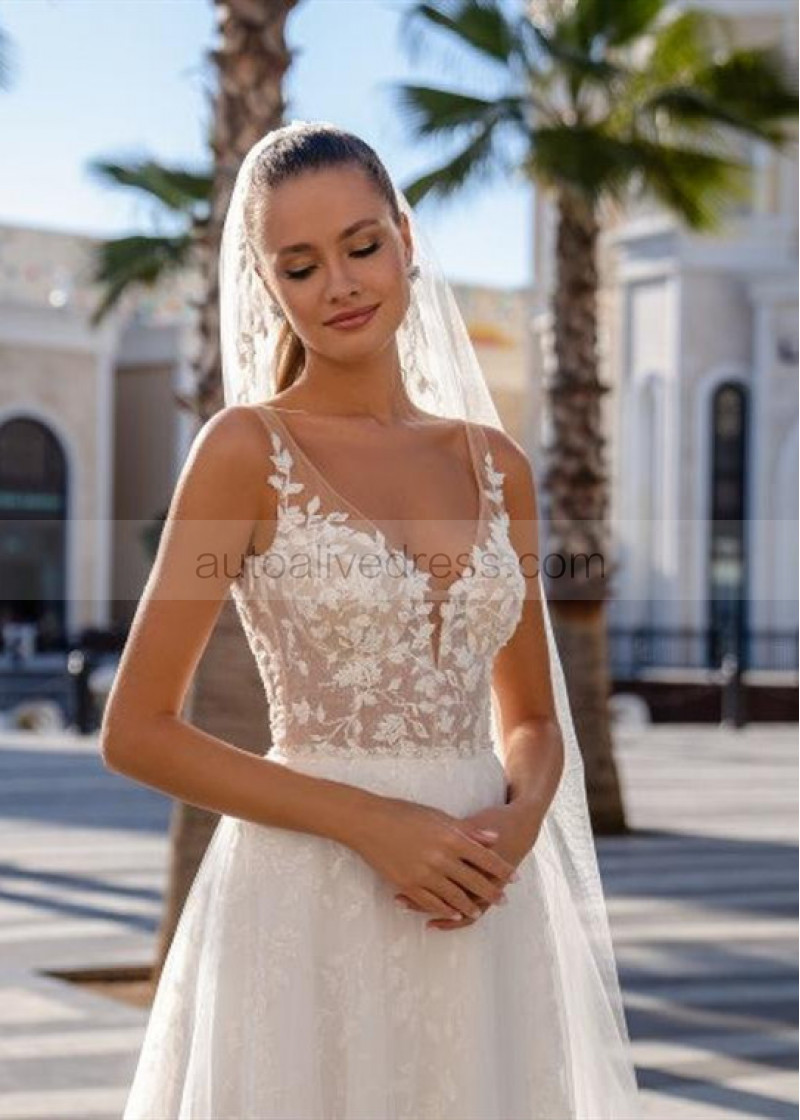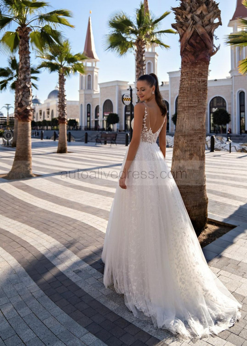 Beaded Ivory Tulle Lace V Back Boho Wedding Dress