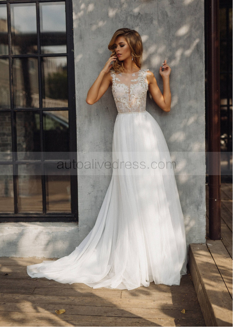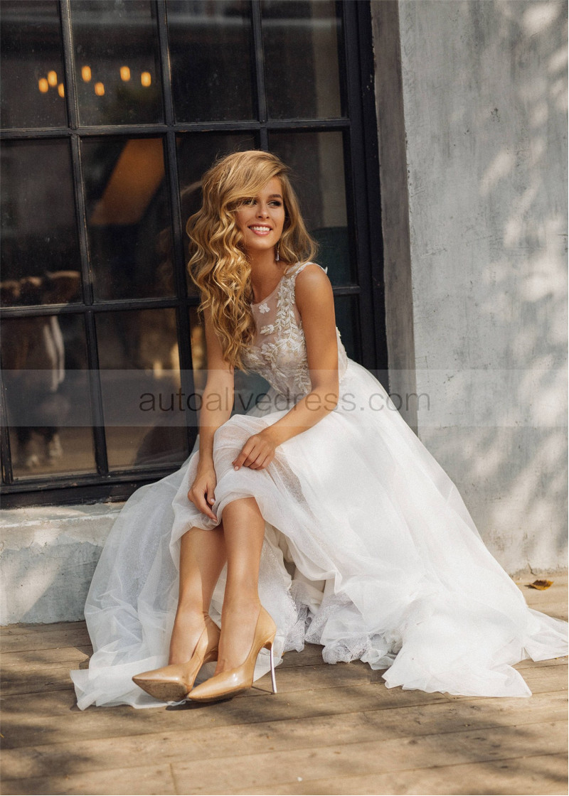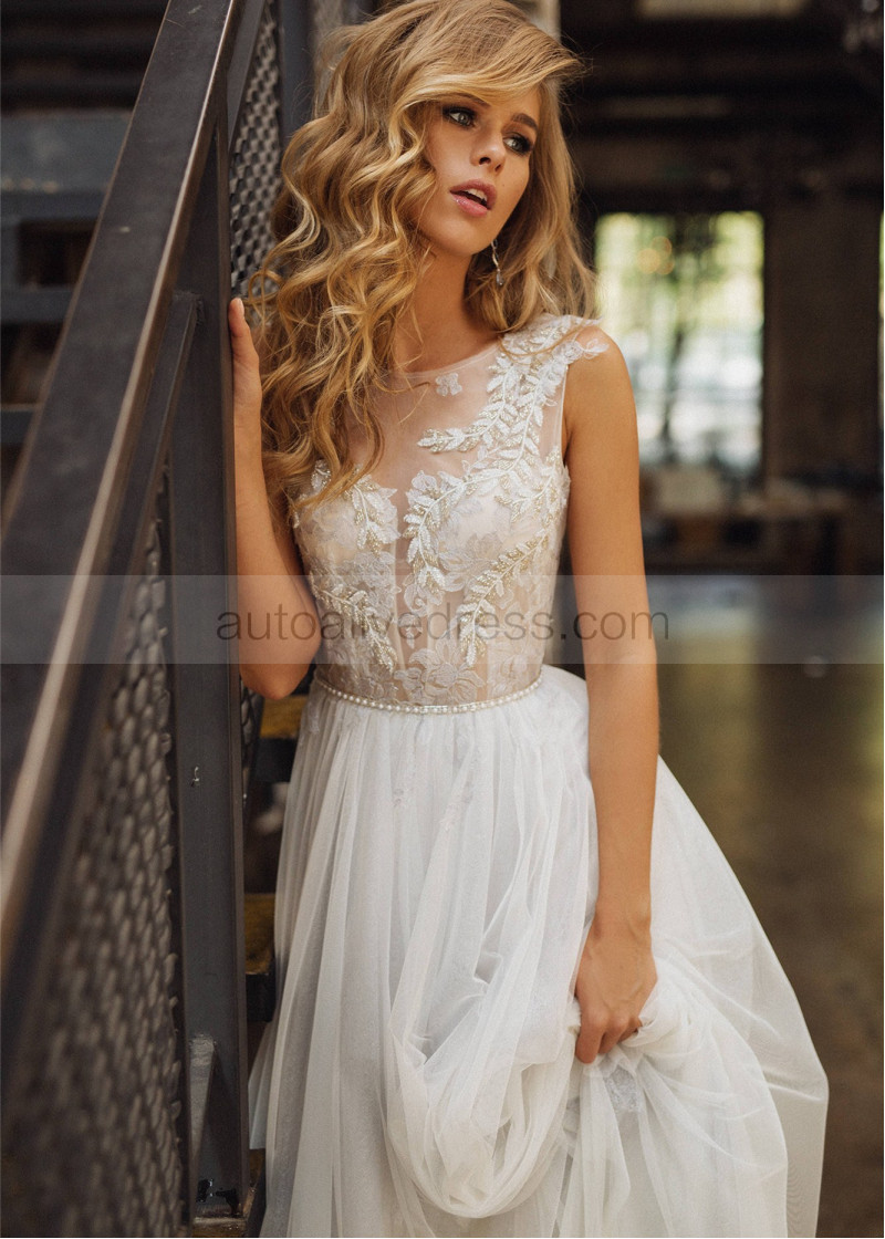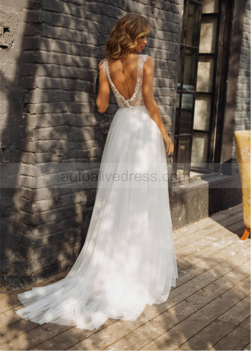 Beaded Light Grey Lace Tulle Deep V Back Wedding Dress